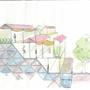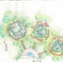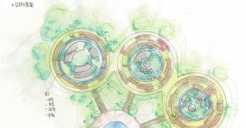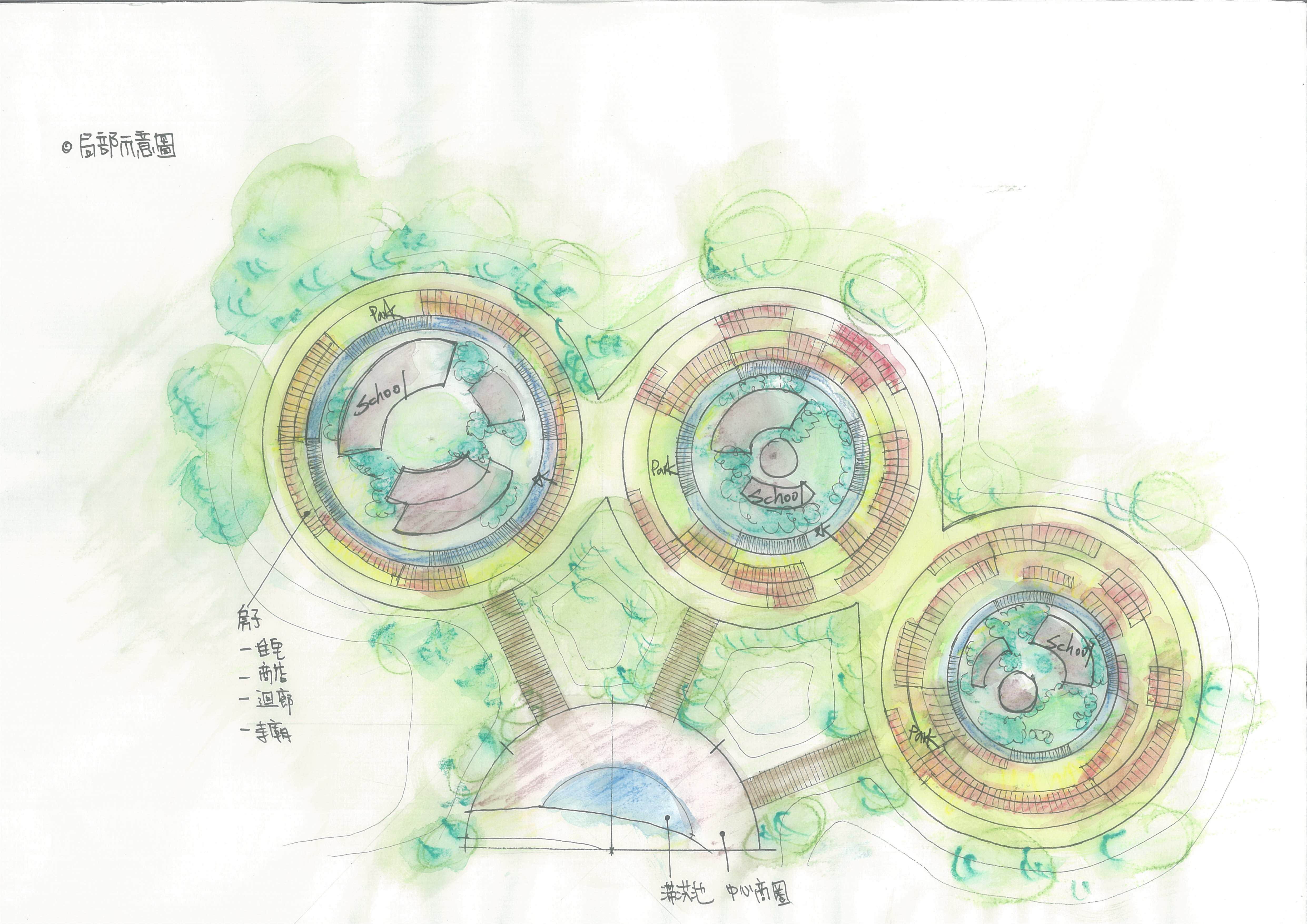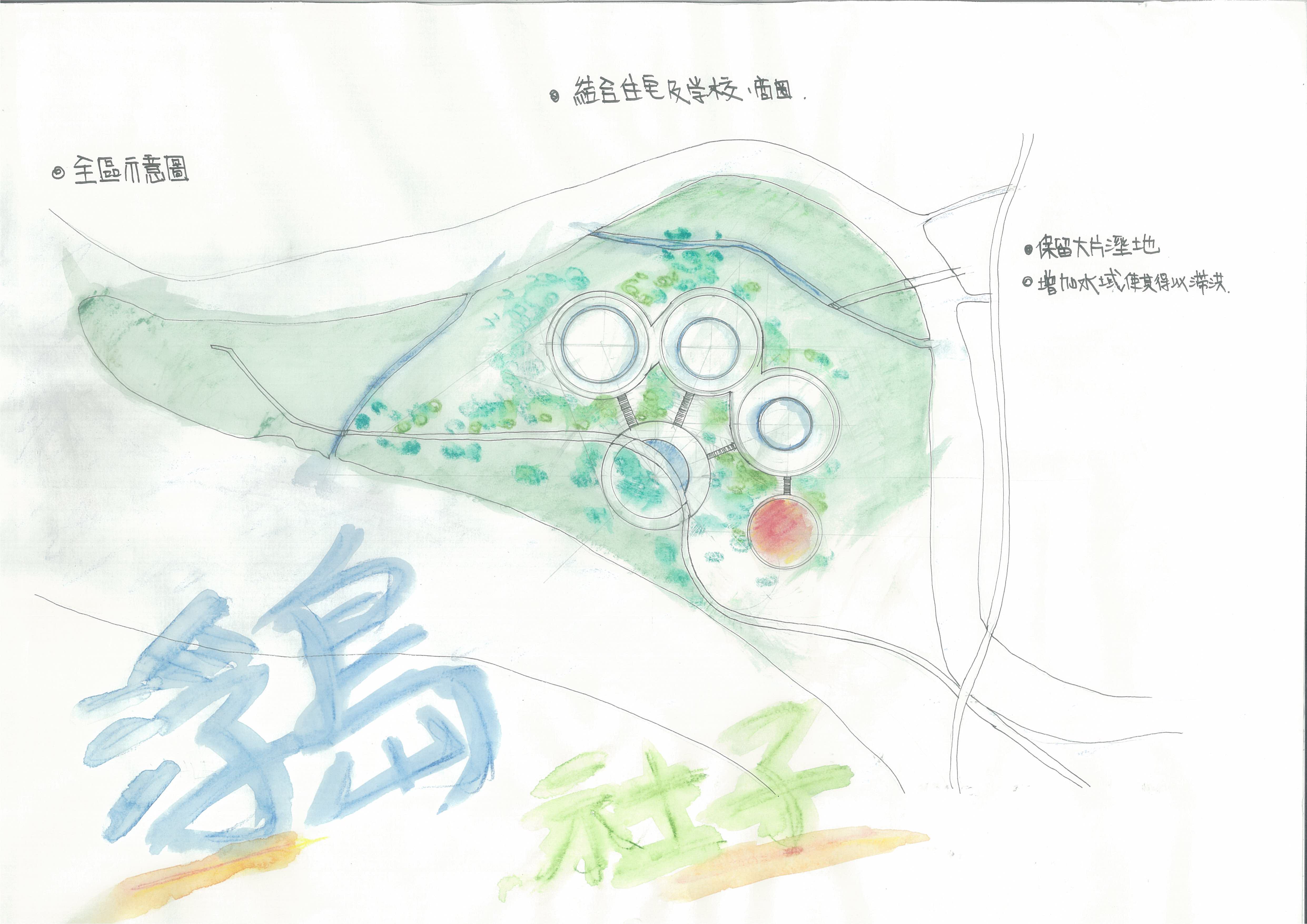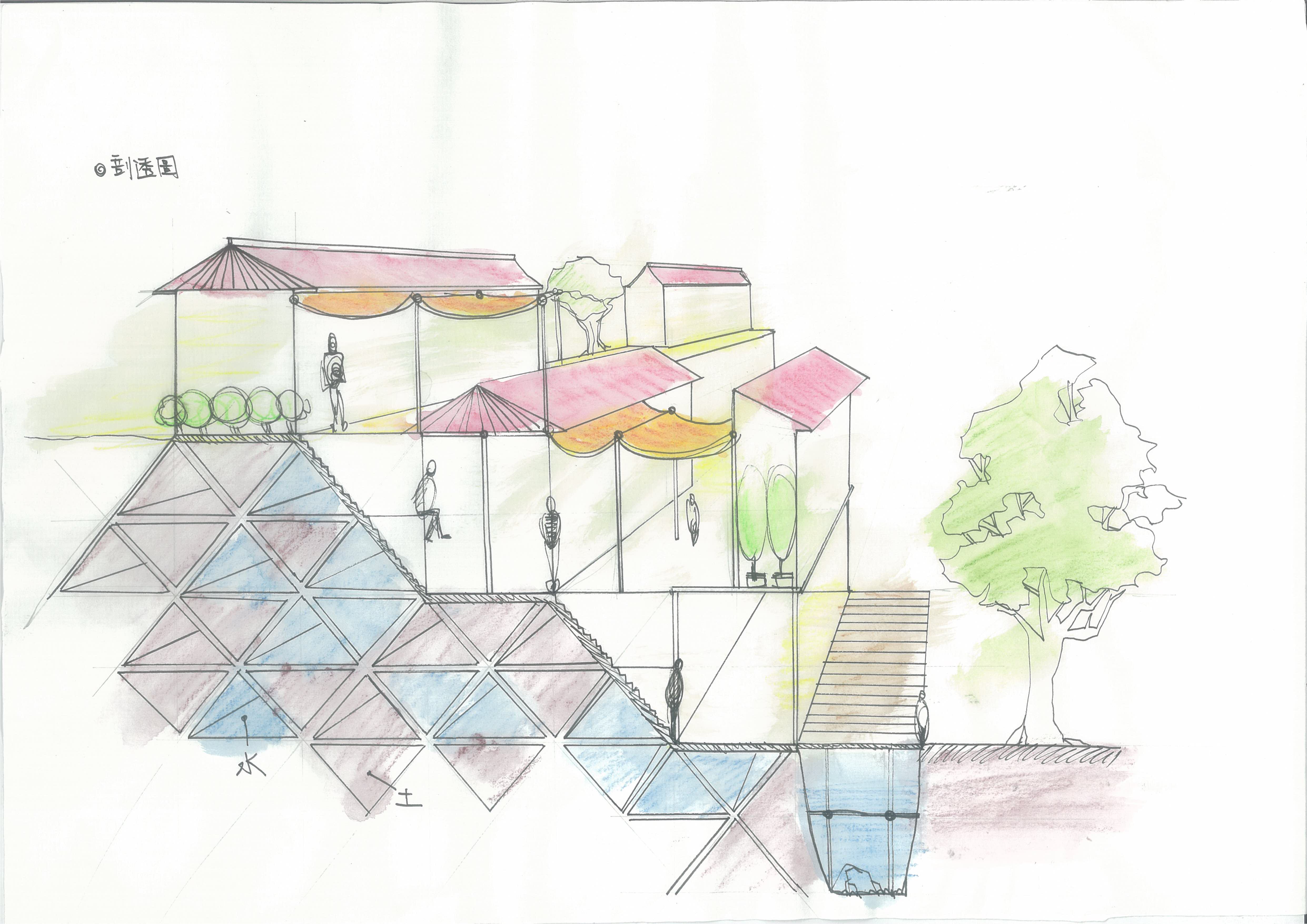 以山城為主要的設計構想,社子島是個低度開發的區域,我希望未來能做到結合住宅、學園與水,形塑出與水的共生環境。以環狀階梯的住宅型態將學員包圍在中心,可以形塑村落的一個共同意識,人人比鄰而居,透過穿插其中的公園、廣場讓孩童更能嬉戲,聚落底下的蓄水幫助降低空氣中的熱度,讓人與水的接觸更為頻繁。