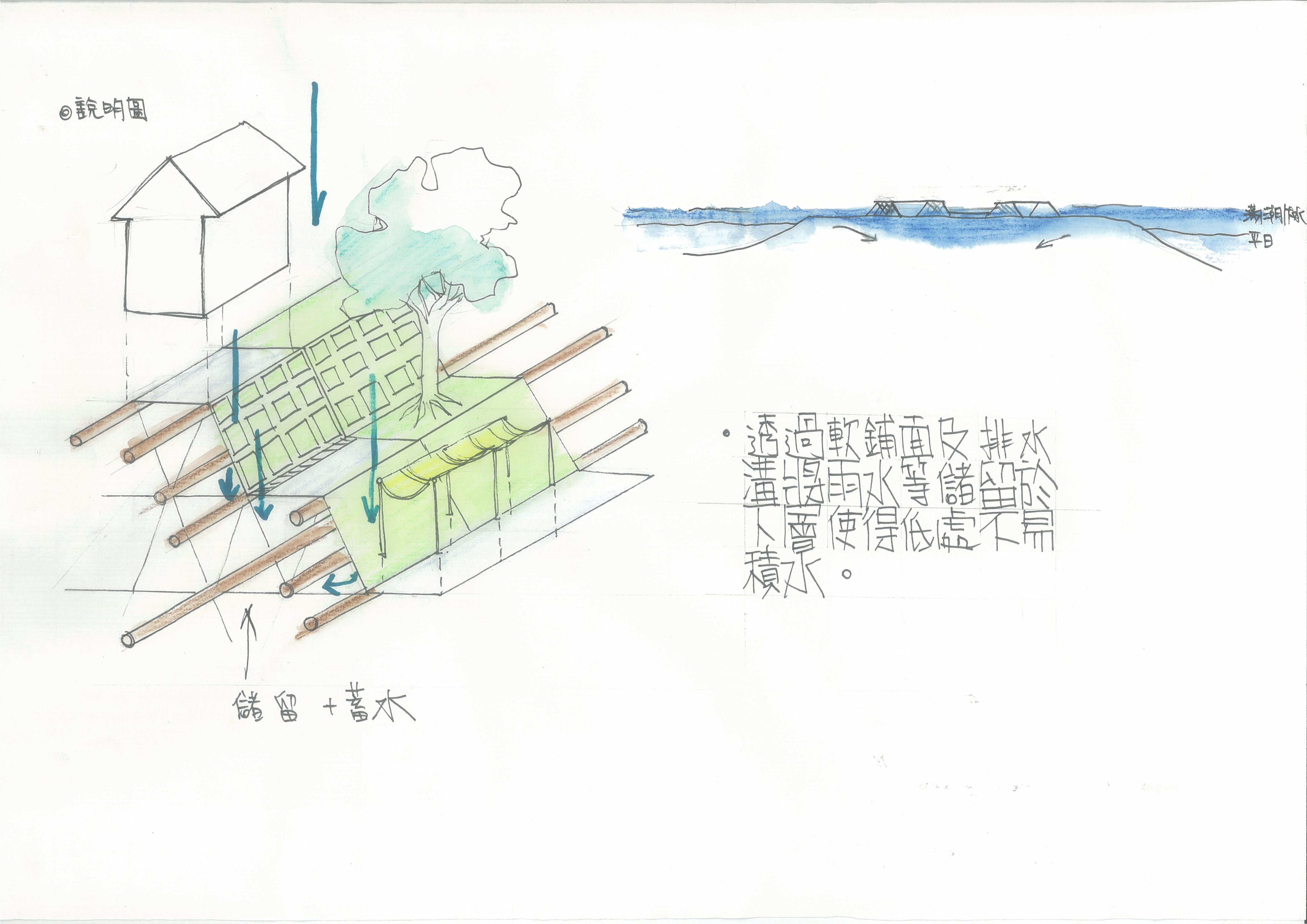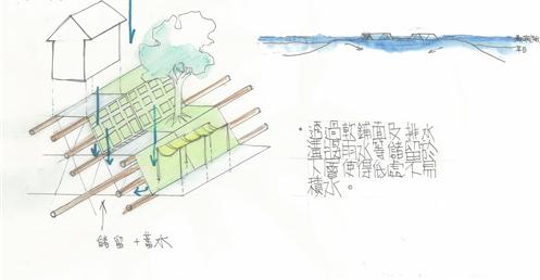 村落外保留大片濕地形成生態公園並且保留滯洪的功能,透過增加水道讓此一地區雨水的關係不再是阻隔而是共存。