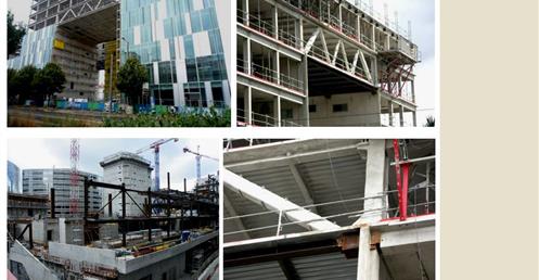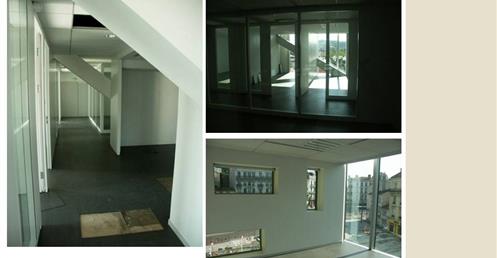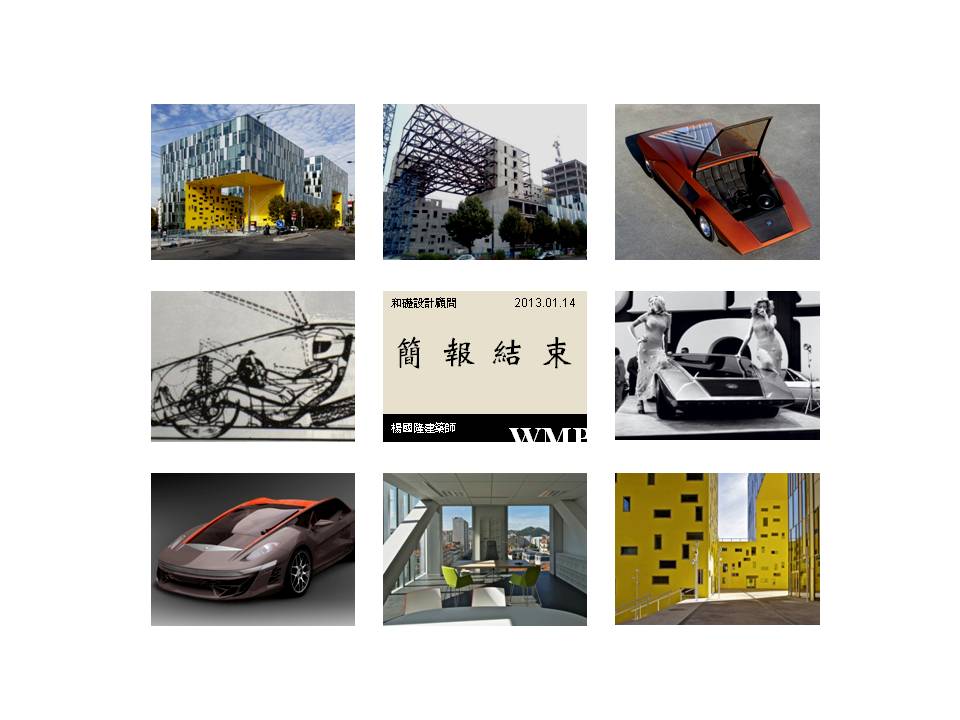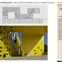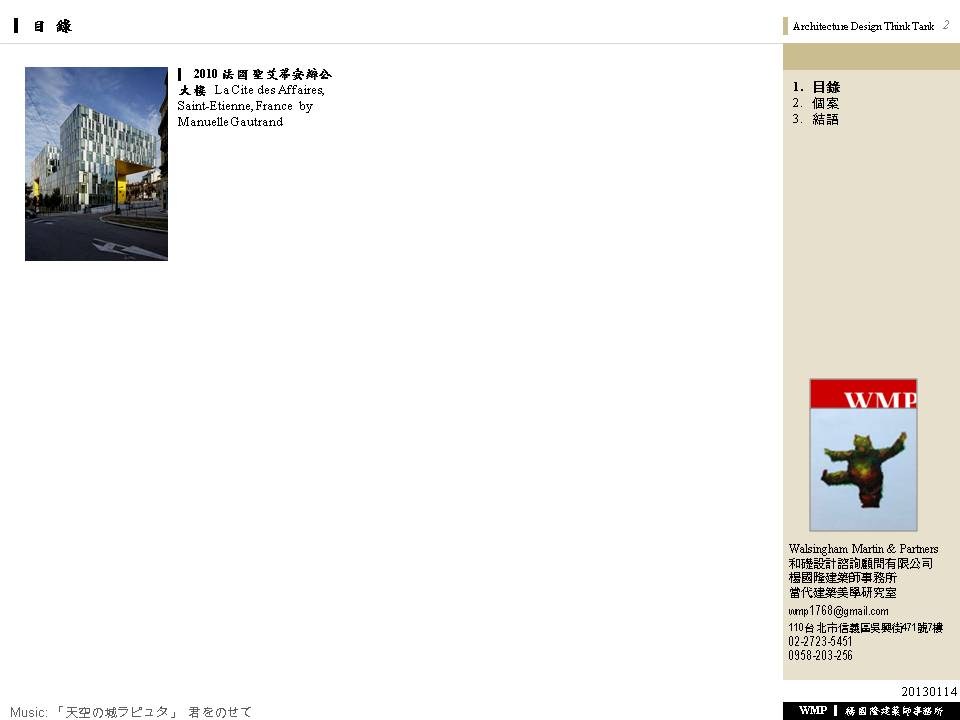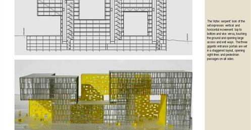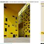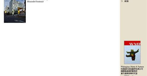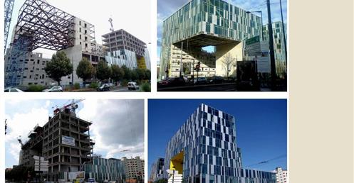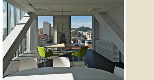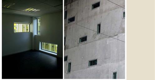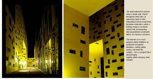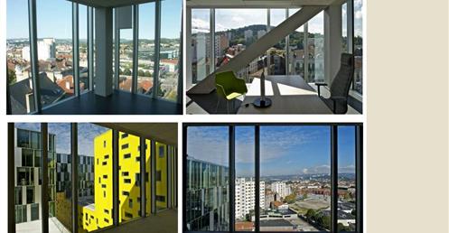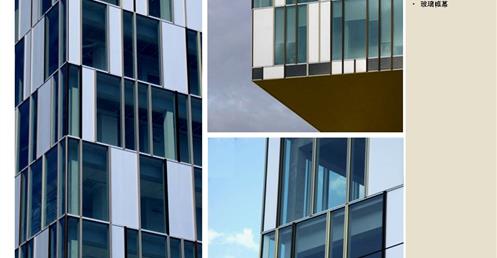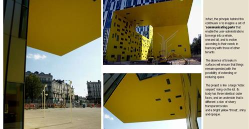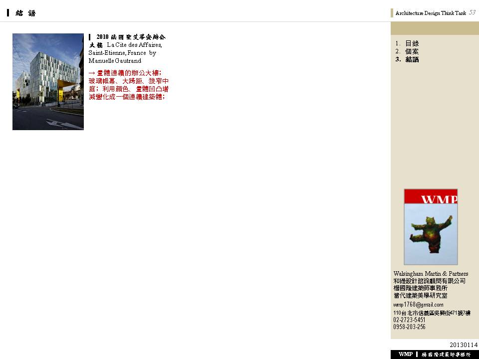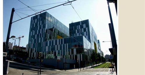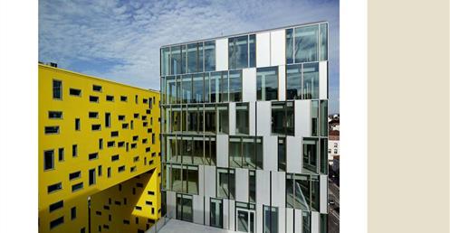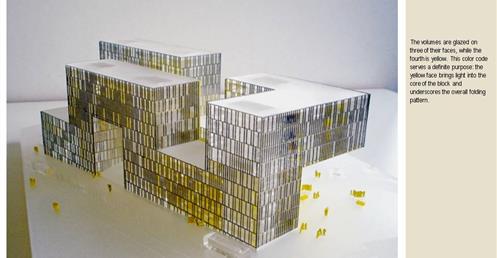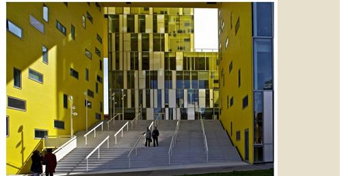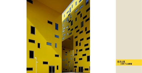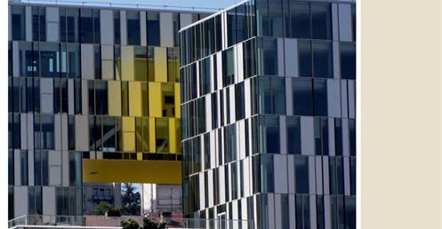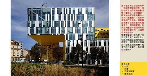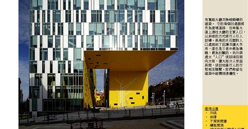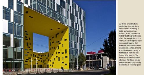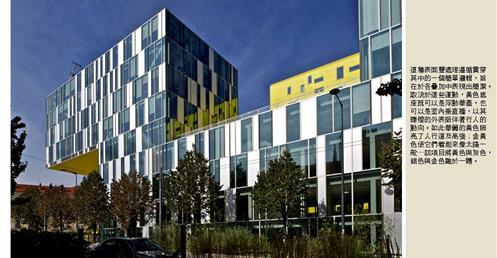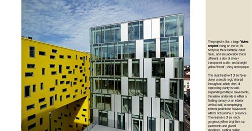 → 量體連續的辦公大樓﹔玻璃帷幕﹑大跨距﹑狹窄中庭﹔利用顏色﹑量體凹凸增減變化成一個連續建築體﹔