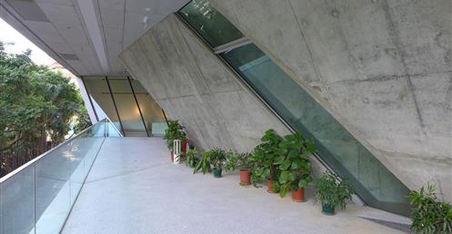 Athletic fields surrounding the building were razed to create a new surrounding landscape. The main pedestrian entrance was placed at podium level, as with the other buildings on campus. A long pathway from nearby Suen Chi Sun Memorial Square to an open foyer creates a focal point, where the building space opens to shops, a cafeteria, museum, and exhibition area.