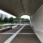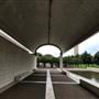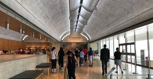 From his earliest sketches and models, Kahn conceived the Museum as a series of long, narrow galleries, each with its sources of light—both natural and artificial—and conditioned air. Kahn’s plan is classical: an axis passing west to east through the front to rear entries is crossed by a longer north-south axis, along which the galleries are positioned in harmony with the site. The north and south sides of the Museum’s three-section pavilion are composed of six parallel, 100-by-20-foot, lead-roofed, post-stressed concrete vaults, while the center section is made of four. Due to its structural strength, each vault only requires the support of four square columns. The building is composed of three levels: the upper floor, housing most of the galleries and the auditorium, library, bookstore, café, and two garden courtyards; the lower floor, encompassing the lower-level entry gallery, conservation labs, offices, and shipping and receiving areas; and a sub-floor basement.
