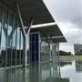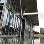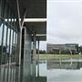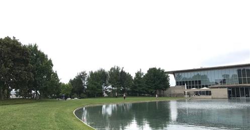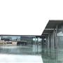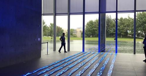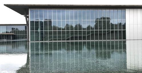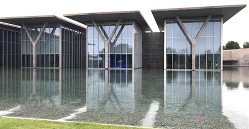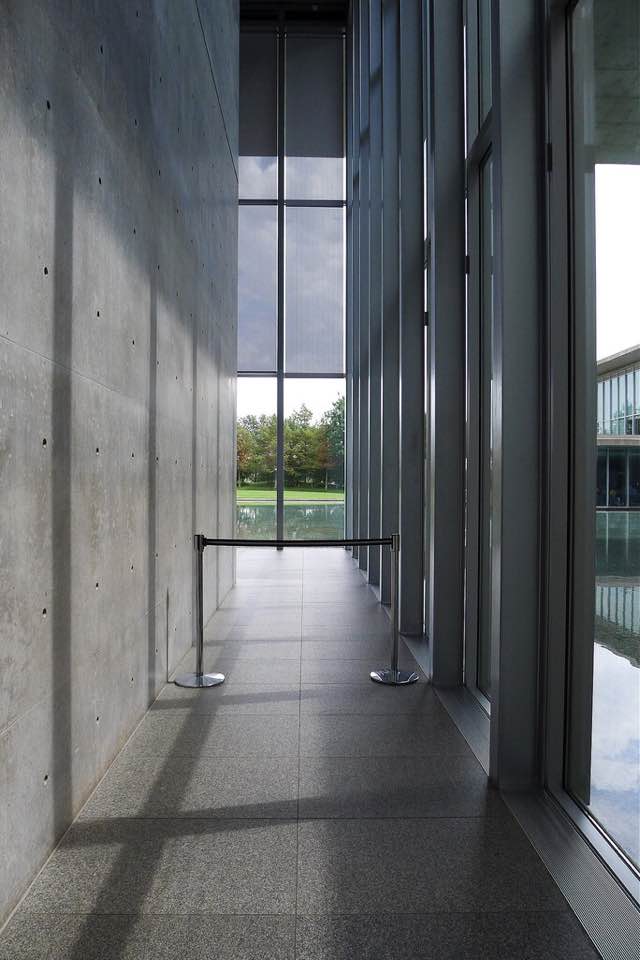 ……此案有別於神戶兵庫縣立美術館,雖然同樣使用熟悉構築材料清水混凝土、玻璃與鋼材,其中少不了水的元素在內,藉由平靜的水面倒影出建築立面所呈現的幾何形體,並且透過安藤擅長的手法,讓建築被廣闊的草原與自然環境圍繞,並以玻璃作為區隔,將自然拉近室內,使人看見其共同存在一隅的畫面;在量體上透過一連串垂直的、水平的簡潔線條、看與被看、既內部也外部、框景層次、虛虛實實..等方式貫注其中。