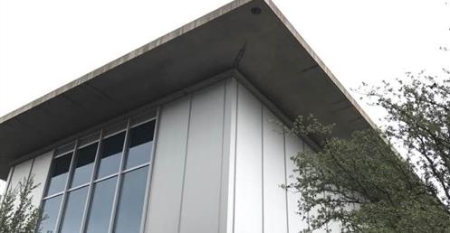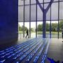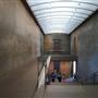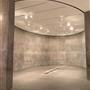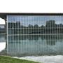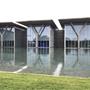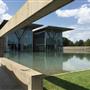 Massive planar walls of architectural concrete boldly express the Modern's basic structure while protecting the collection within. Forty-foot-high transparent walls of glass framed in metal surround the concrete envelope, providing magnificent public circulation areas from which to view the surrounding building, the large reflecting pond, outdoor sculpture, and the landscaped grounds. The desire to use diffused and reflected natural light within the gallery spaces was a major influence on the building's design. Immense cantilevered cast-concrete roofs shade the building's exterior and accommodate the introduction of natural light into the gallery spaces by supporting sophisticated systems of continuous linear skylights and clerestory windows. Supporting the concrete roof slabs are five forty-foot-tall concrete Y-shaped columns. By day, the Modern's setting on eleven naturally landscaped acres—including an outdoor sculpture garden and terrace and a large reflecting pond at the building's edge—provides a restful complement to the building's architectural strength. By night, with the concrete walls bathed in an even glow of light, the transparent glass-and-steel galleries appear as large lanterns floating on and reflected in the pond.
