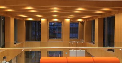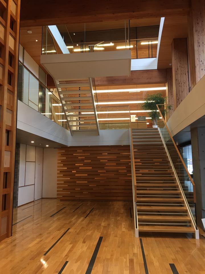 三樓造的會館通透且散發松杉柏混木集成材木質香味,外有兩棵大喬木相伴,的確木構造建築,迷人不已。……
