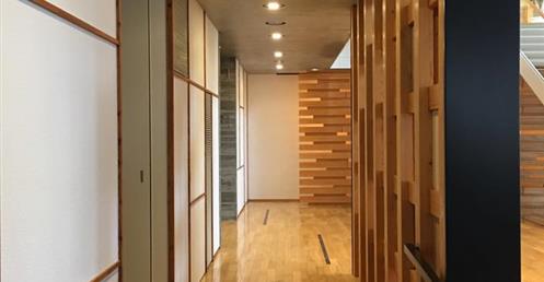 坂茂之作是13年前的設計,鋼構之外由木頭防火疪護成形,期望接待客戶的營業所,有木造建築的溫暖。這家營業額千億以上廣及五大洲的齒科醫療機器公司,對此Showroom滿意極了。
