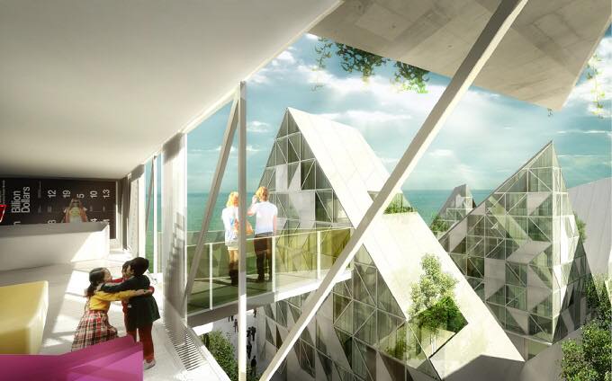 起伏的屋頂是根據建築體量與周邊環境跟內部空間來調整的,形成開放的結構和戲劇化的外觀。底部某些是街區的尺度,具有海港的特徵,上部某些空間,則形成更加城市化的特質,使城市和海港的特徵在相同的建築語彙上相互撞擊。