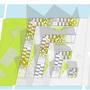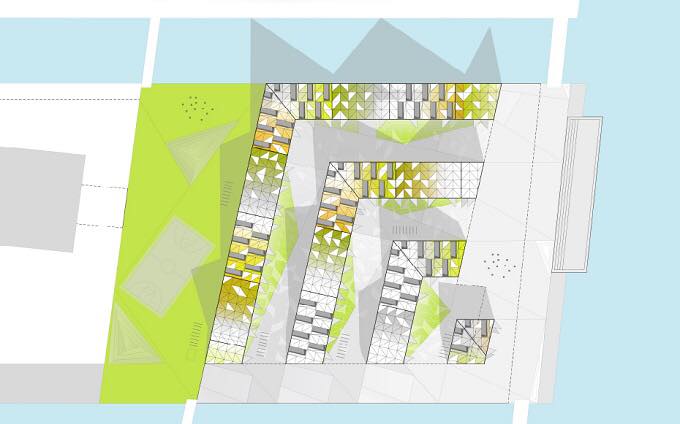 其實周邊為密集開發的街區,但冰山並未追隨此形態,而是用四個L形的翼,使各樓間的的空間朝水面方向開放。屋頂鋸齒狀的起伏,使各建築體塊都不會被絶對性地遮擋,像一座座漂浮的冰山。