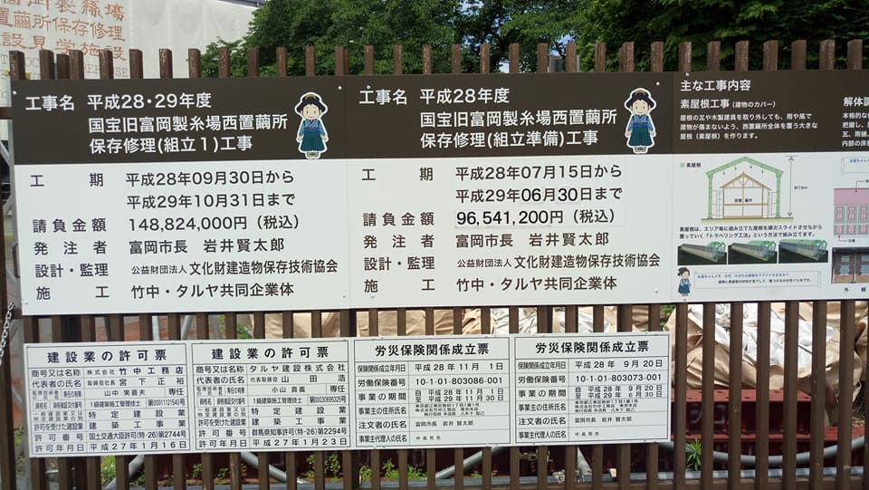 On October 19, 2012, Tomioka City published a "Maintenance and use plan of the old Tomioka Silk Mill designated Historic Site and which buildings are registered as Important Cultural Assets".This plan indicates a vision on how to use the Tomioka Silk Mill while preserving its value, and it clearly shows how to phase the maintenance process towards the realization of this vision.