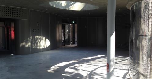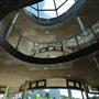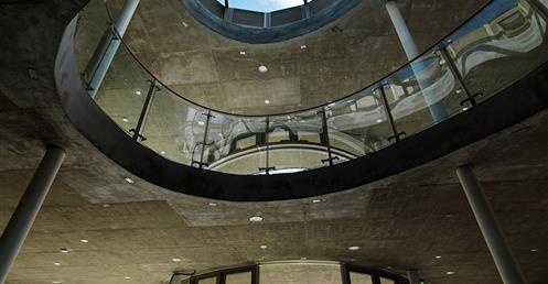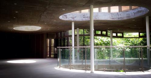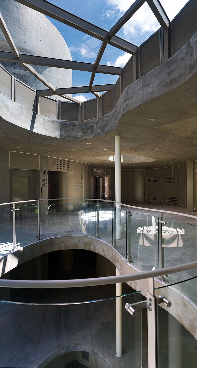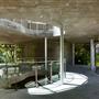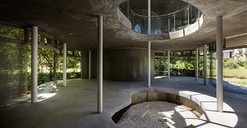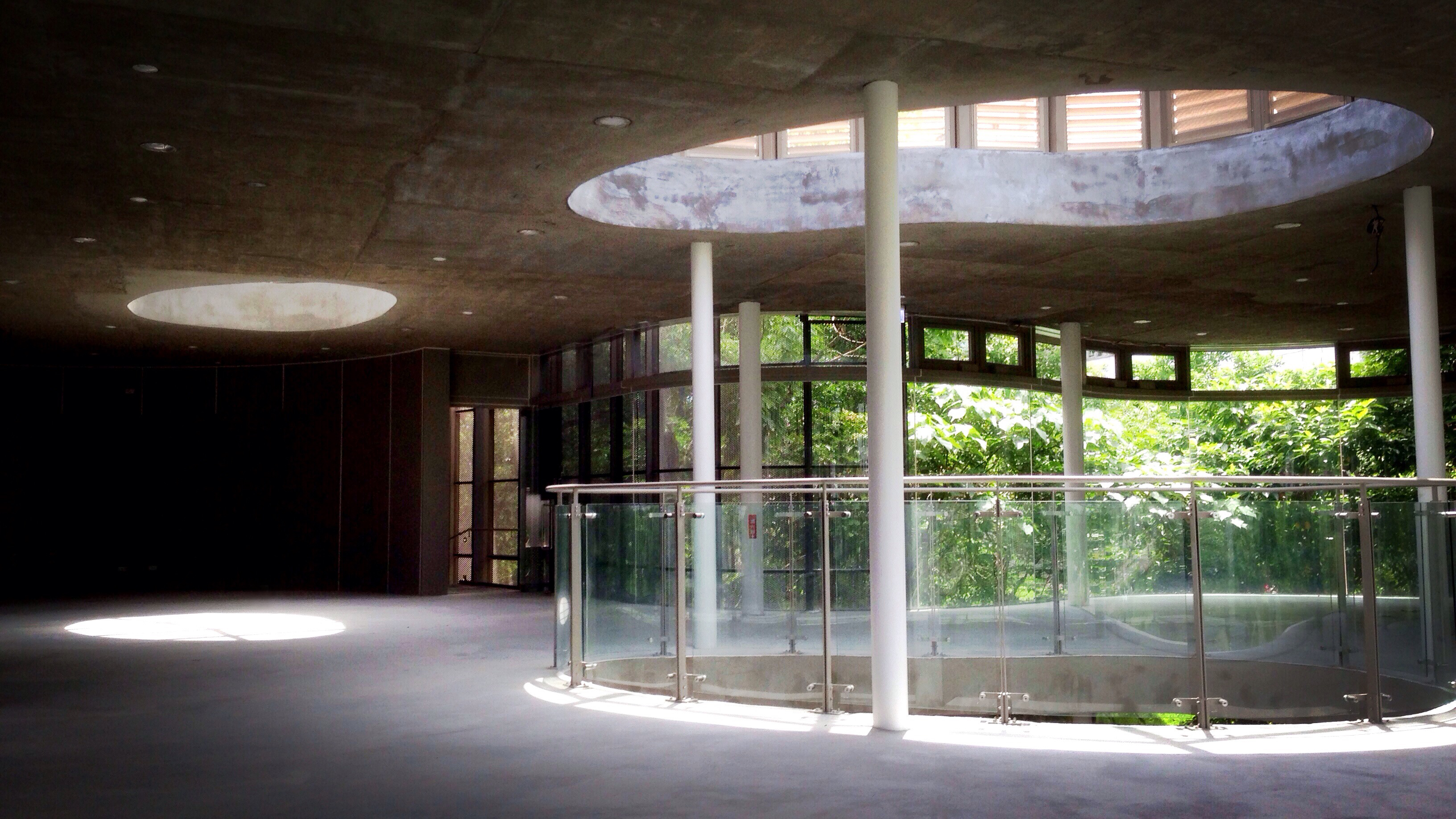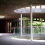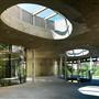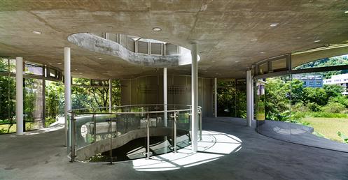 將展示空間、大廳、櫃台、休息區、解說區、放映室等空間整合串聯在一起,僅以採光中庭作為區分,形成了「一個」自由流動的空間