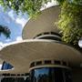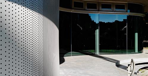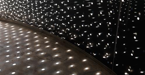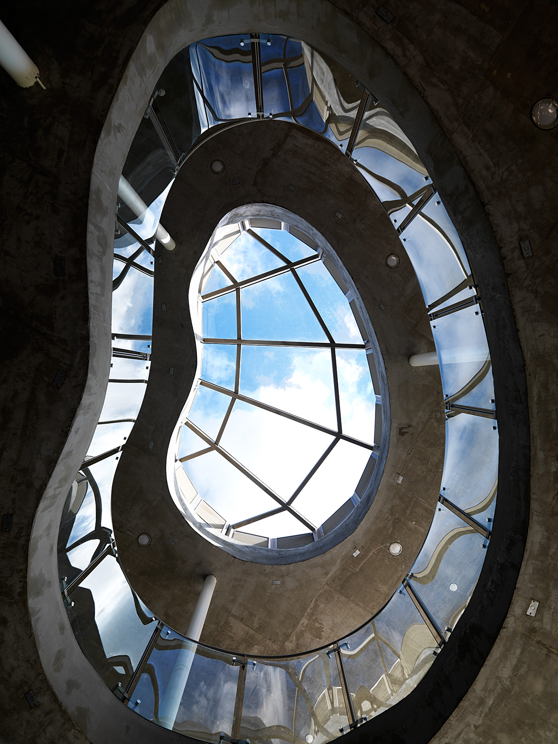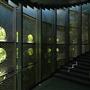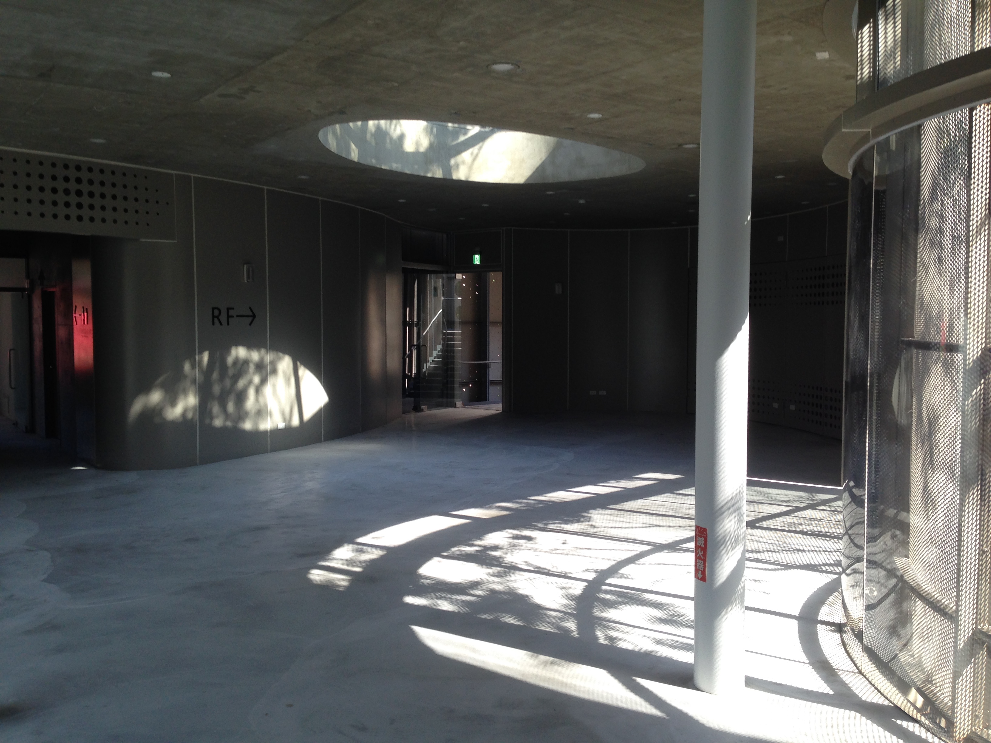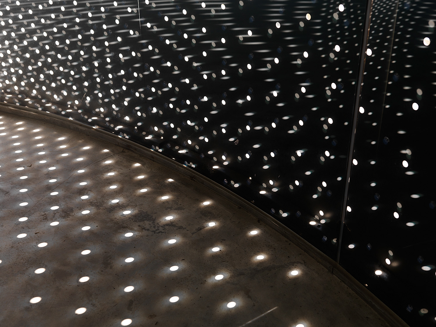 將展示空間、大廳、櫃台、休息區、解說區、放映室等空間整合串聯在一起,僅以採光中庭作為區分,形成了「一個」自由流動的空間