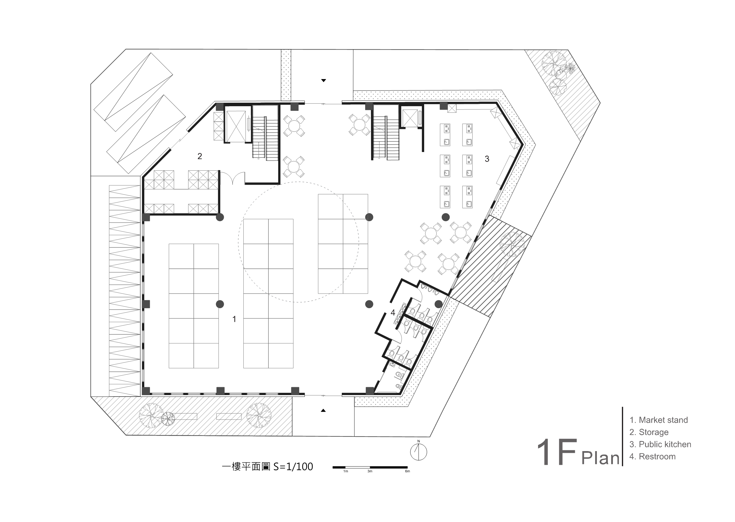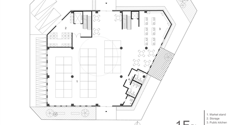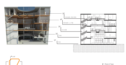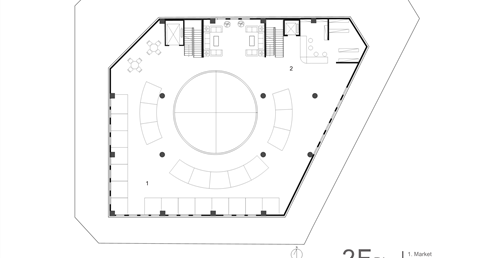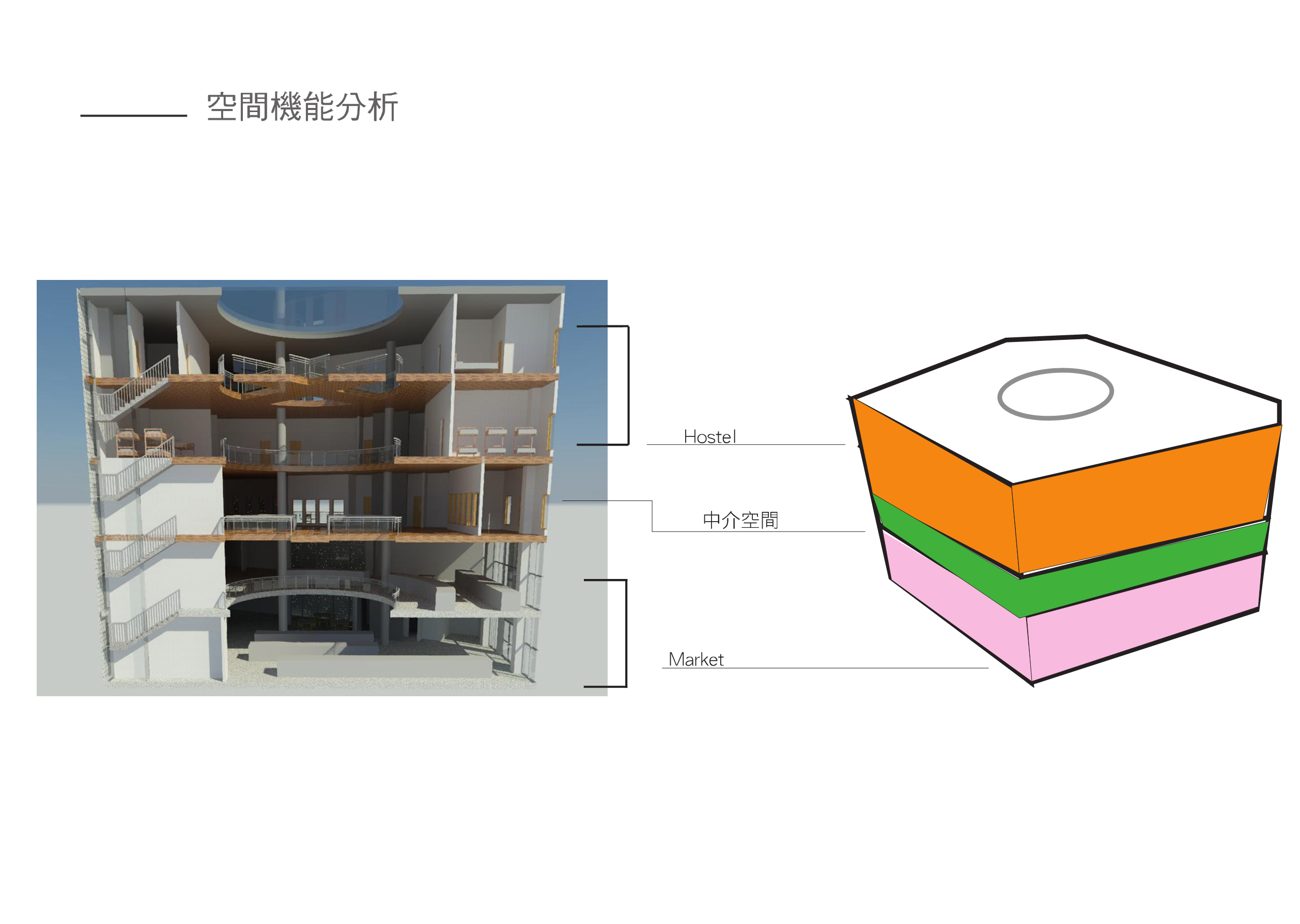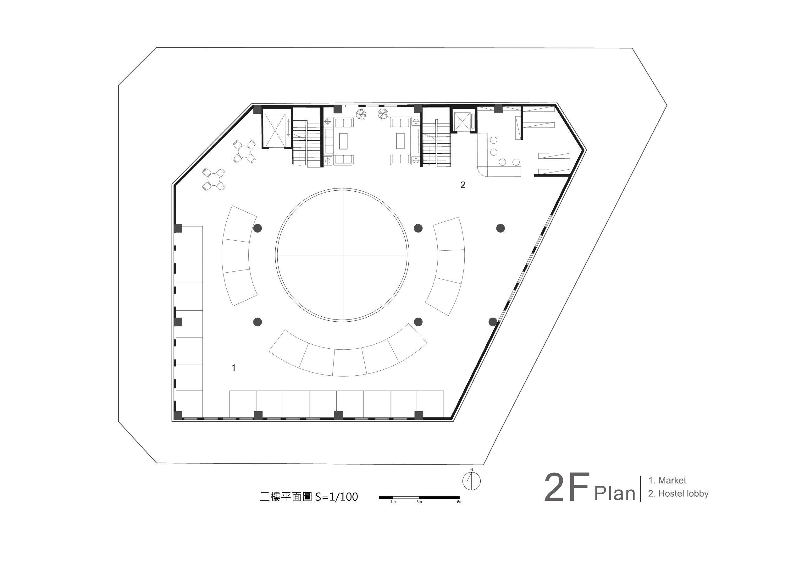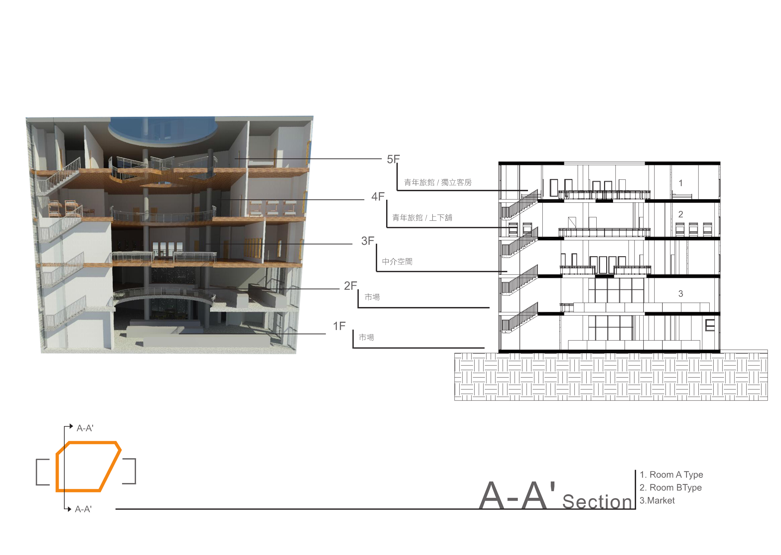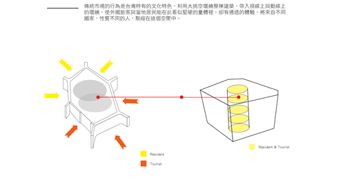 傳統市場的行為是台灣特有的文化特色,利用大挑空環繞整棟建築,帶入視線上與動線上的環繞,使外國旅客與當地居民能在此看似堅硬的量體裡,卻有通透的體驗,將來自不同國家,性質不同的人,聚縮在這個空間中。