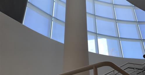 The Museum acts as the centerpiece and the main entrance to the Center. Stepping off the tram that takes you from the base of the mountain and parking area to the Welcome Center and into the Museum. The entrance lobby has a sun-lit circular foyer, and provides views through the courtyard to gallery structures arrayed in a continuous sequence.
