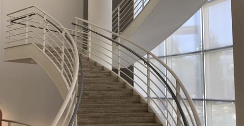 A 450-seat auditorium, west of the Getty Trust offices and the Art History Information Program, terminate the east elevation. The Getty Conservation Institution, The Getty Center for Education, and The Getty Grant Program take advantage of the climate through the use of loggias, pergolas and full-height glazing at the external perimeter. Along the more secluded western ridge, the Getty Research Institute for the History of Art and the Humanities completes the complex.