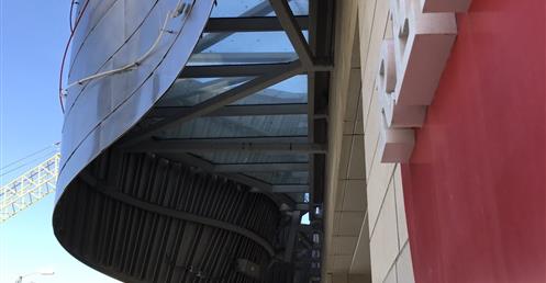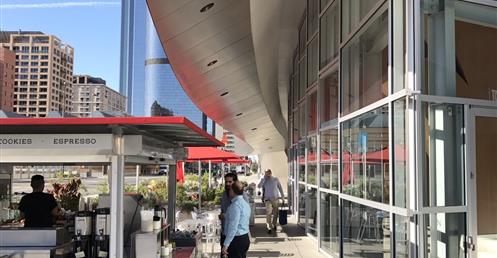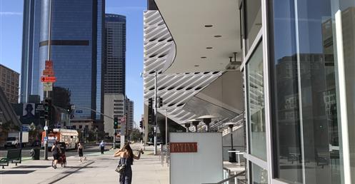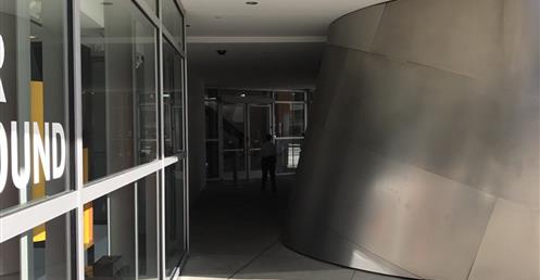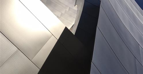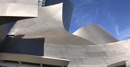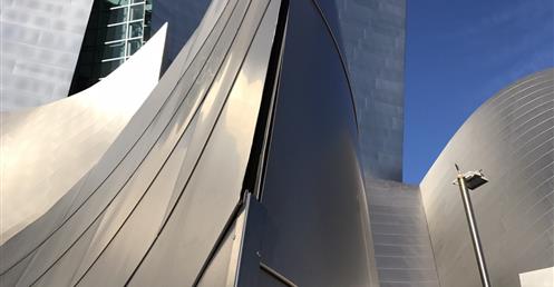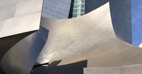 The first view of Walt Disney Concert Hall most people see is the curving stainless steel skin of the building’s exterior. Resembling silver sails, the curves echo the billows in the auditorium and play off the bowed cornice of the Dorothy Chandler Pavilion, forging a link between new and old.