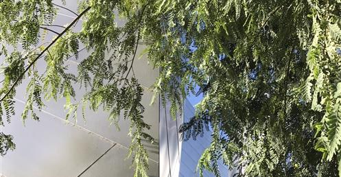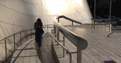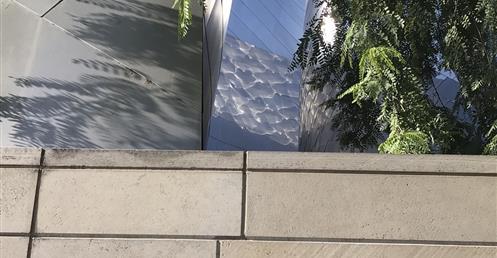 Past the barge with billowing sails is a public park that doubles as an oasis for concertgoers. At the center of the garden is a rose fountain dedicated to Lillian Disney, who provided the initial donation for the Concert Hall. The fountain is constructed from broken pieces of Delft China, Lillian’s favorite. Gehry named the fountain, “A Rose for Lilly.”