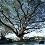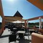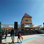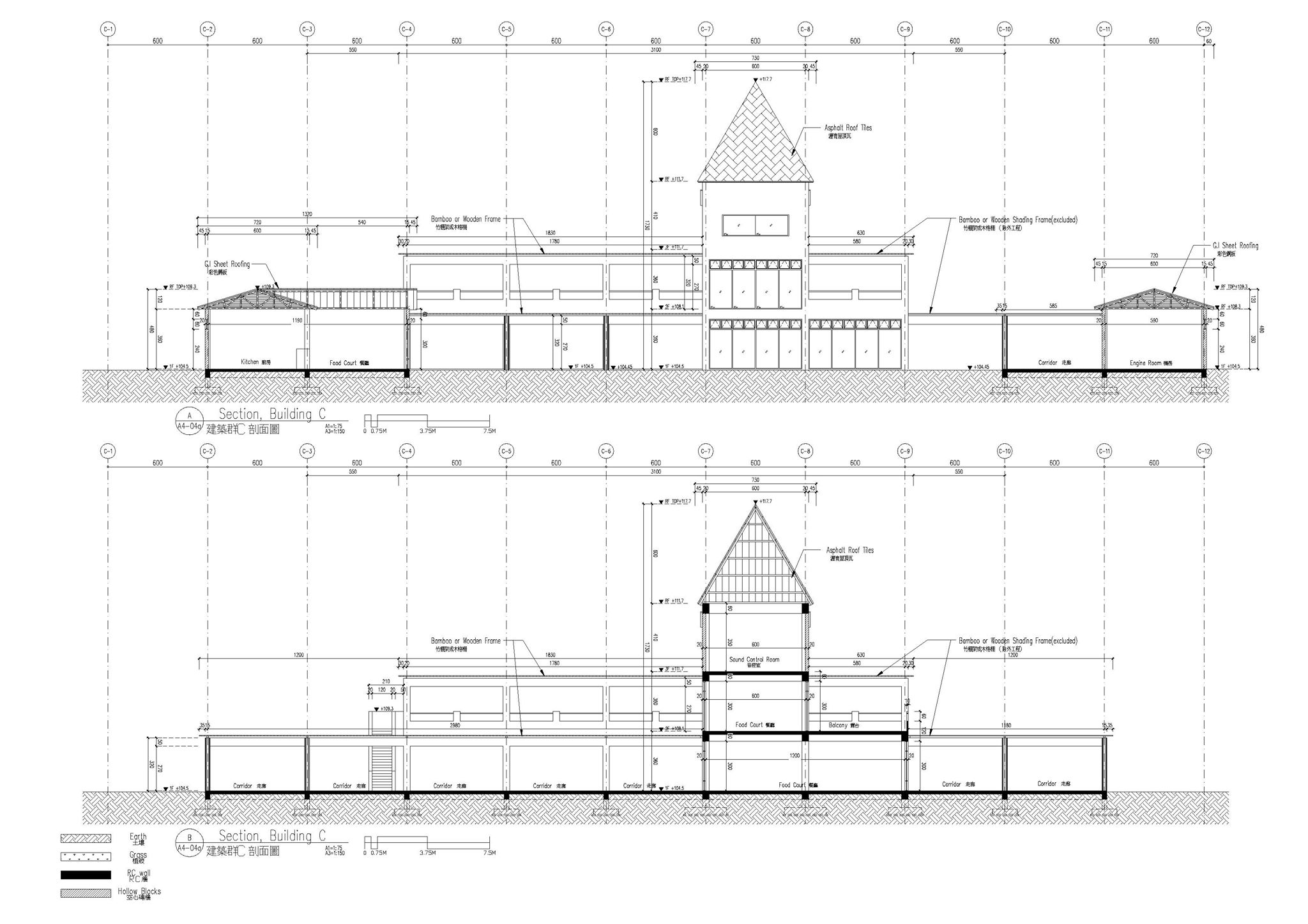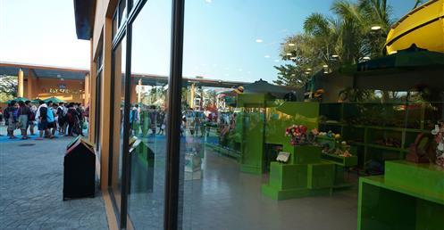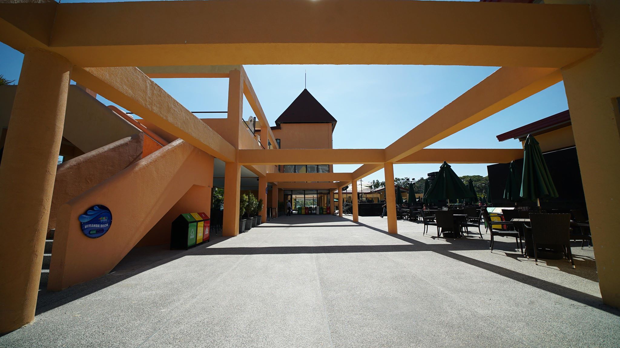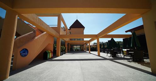 漂流河環繞的中央島嶼,配置品字型建物做為主題餐廳及休憩涼亭,最高尖頂建物內有中央監控室,控管大海嘯燈光及音響,大海嘯設備機房與員工辦公室共構。
