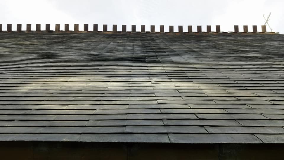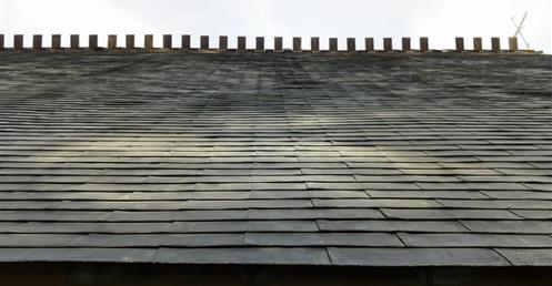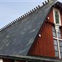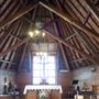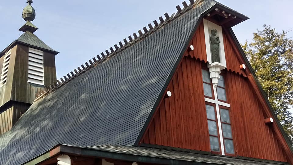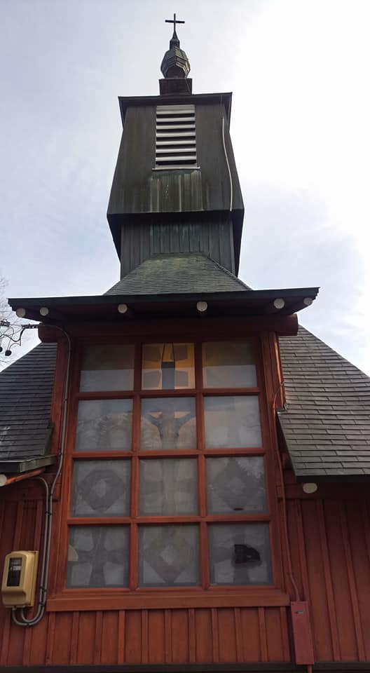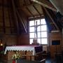 It features a triangle-shaped steep pitch roof, big steeple and as-cast concrete.