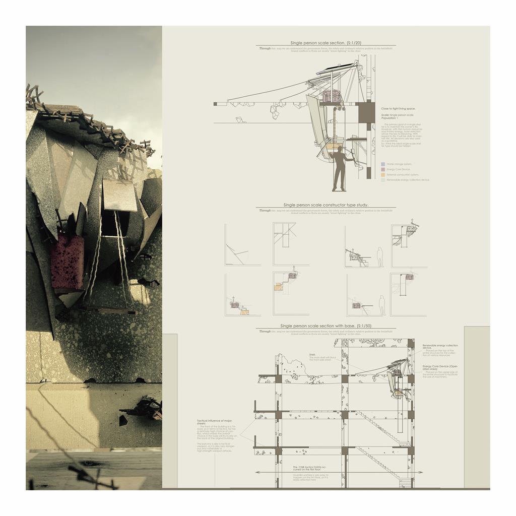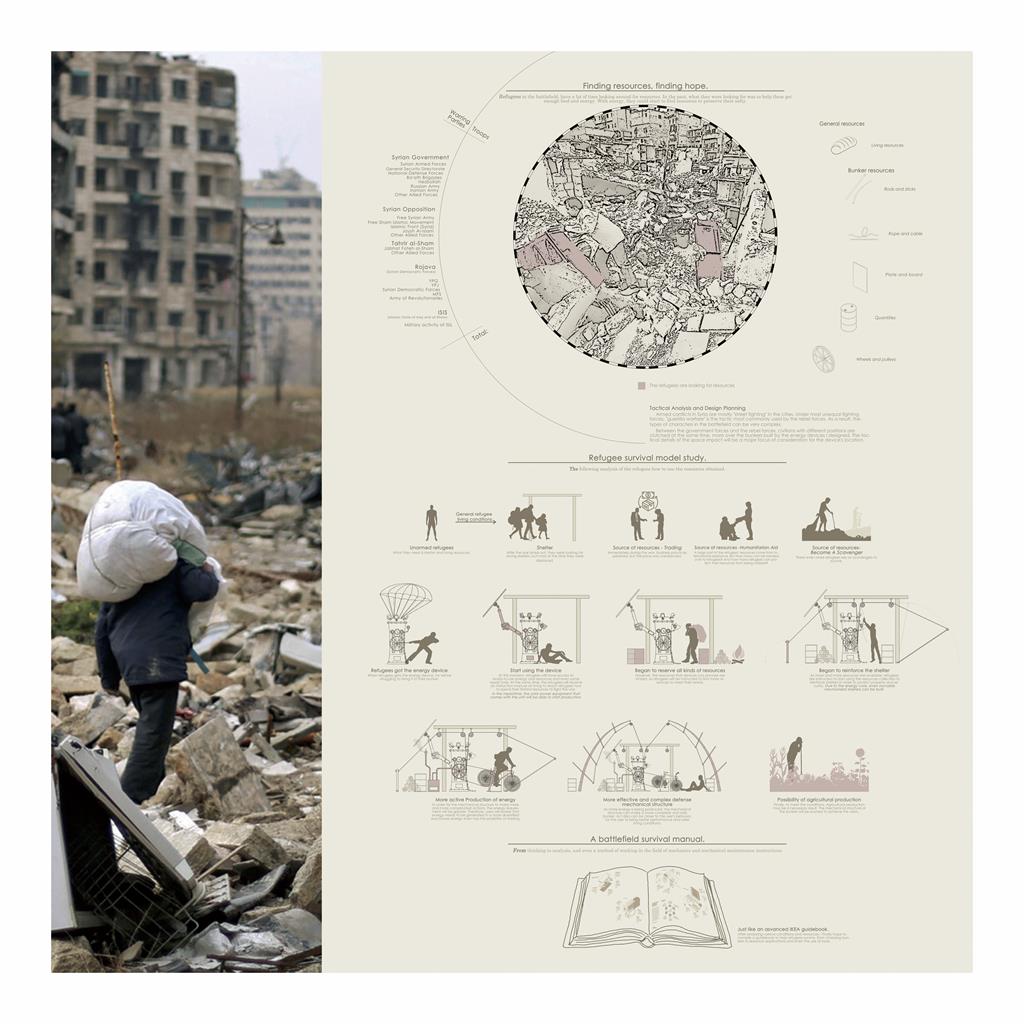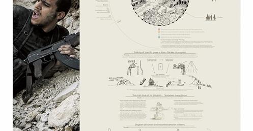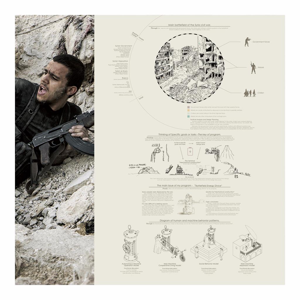 而為了達成機械特性裡的「達成某種目的或功能」,我選擇「戰爭」這樣的主題,並以敘利亞內戰為藍本,希望在這種機端環境的背景下,以一個「能源核心」作為發展基礎,勾勒出人與機械的共構關係。是行為的、是精神的、是理性也是感性的。
