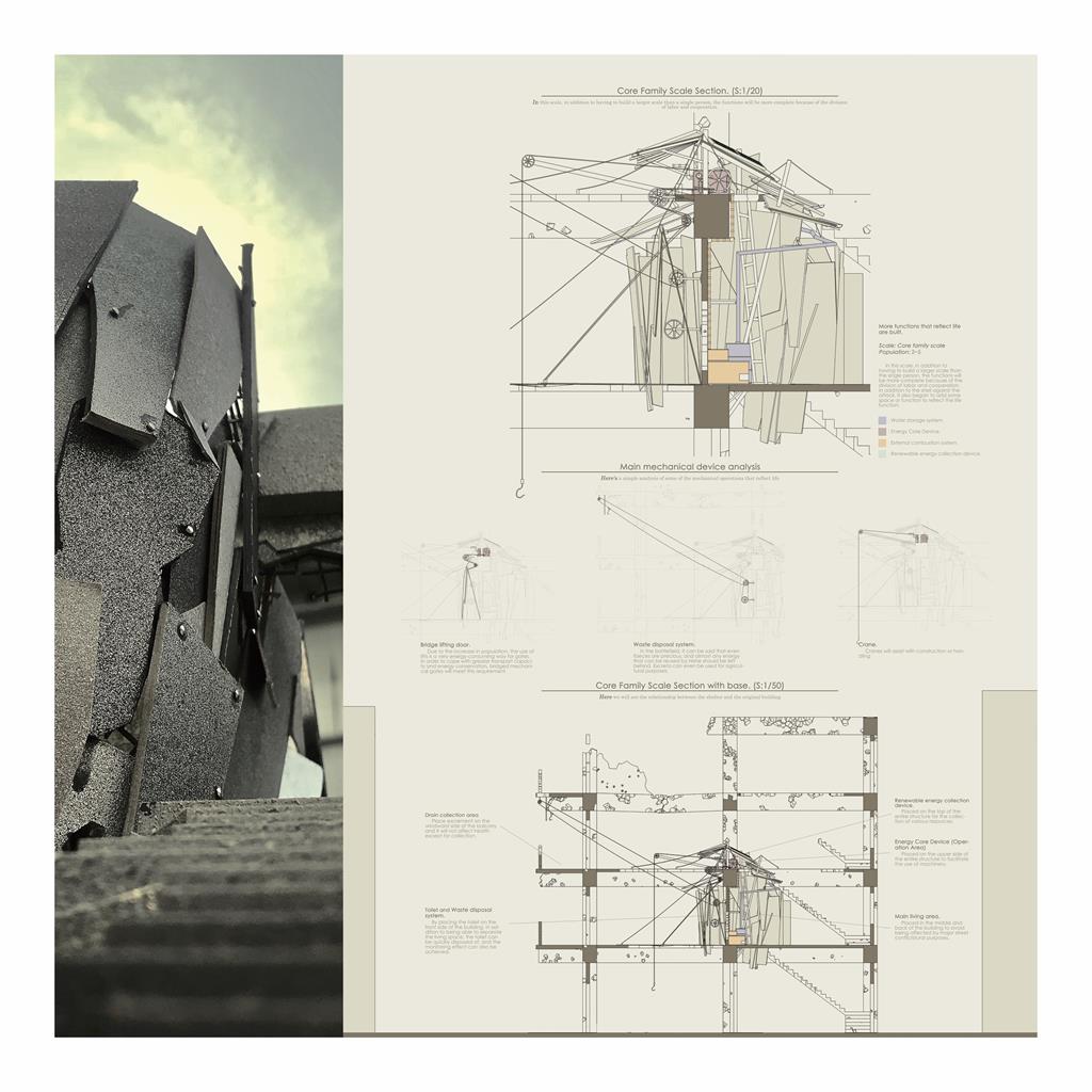 透過對於機械與人類肢體的研究後,在一個強力的能源基礎核心下,想在本次設計中探討「人機一體」的空間想像與可能性。