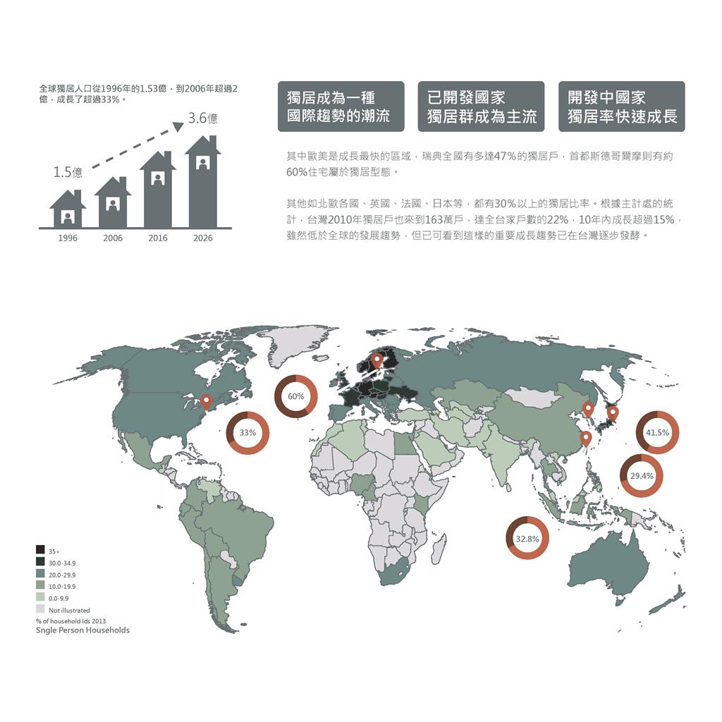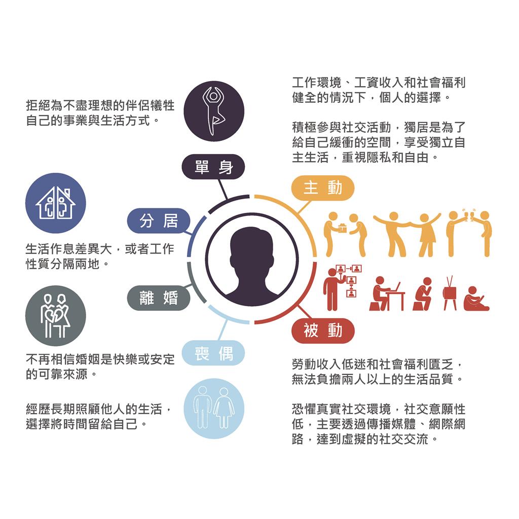 但從過去半個世紀開始,一切都改觀了,我們不視獨居為過渡階段,獨居漸漸成為一種穩定發展的居住型態,並且趨勢不斷成長,甚至勝於核心家庭的比例。