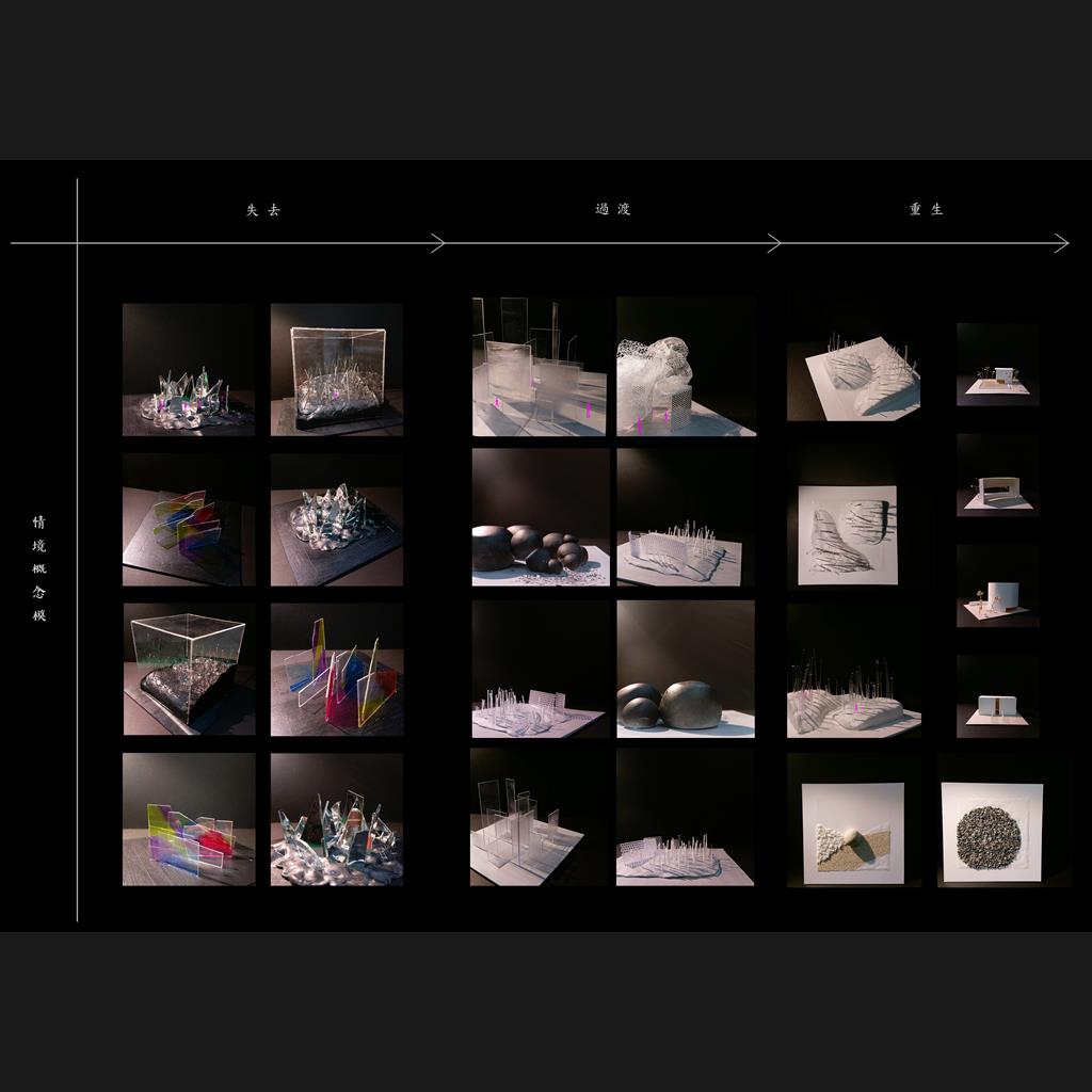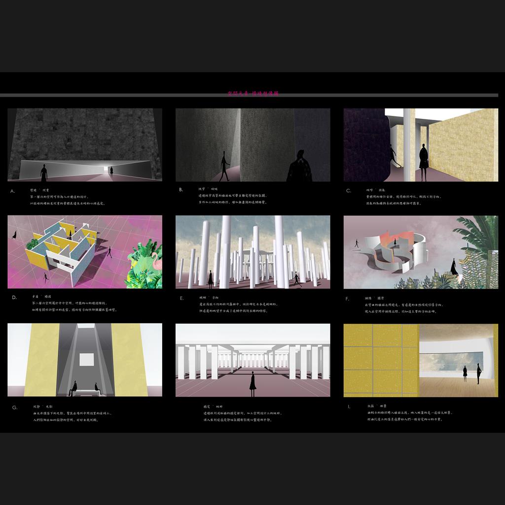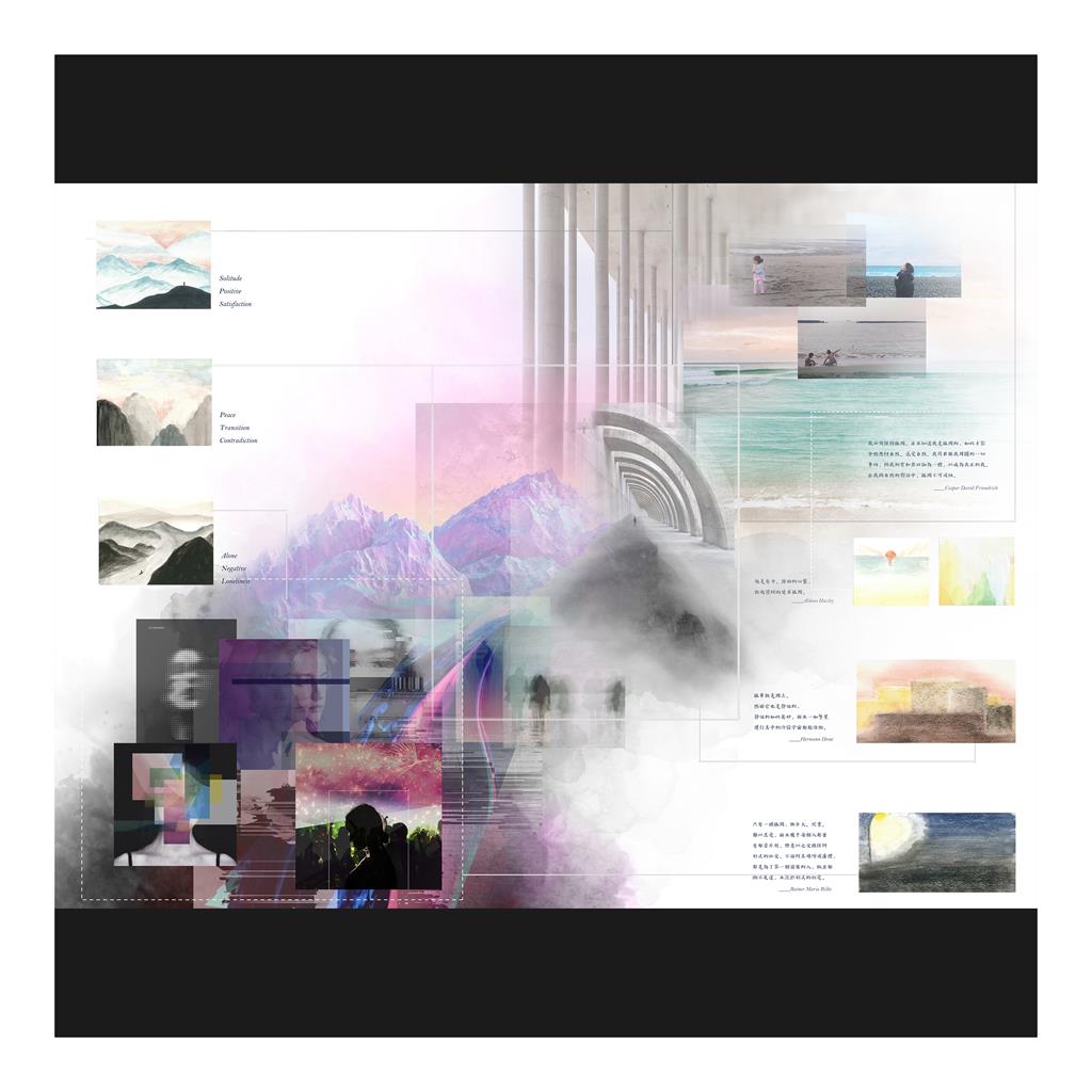「孤獨」本身為一個中性且廣義的詞彙,出現在各種情境,大家對孤獨的看法也是褒貶參半。然而,只要身為人,一定曾經有過無意識或有意識地處於孤獨的狀態中。透過收集許多關於孤獨的書籍或電影,吸收大家對孤獨不同的看法,經過研究與統整,我聚焦於「失去、寂寞、思考、自由」這四種狀態與孤獨之間產生的關係,將所有觀點整合為一道 ”失去至重生”的過程,而孤獨就潛伏於整道過程之中。將抽象情境一層層轉化至空間元素,以建築語彙重新詮釋整道過程。