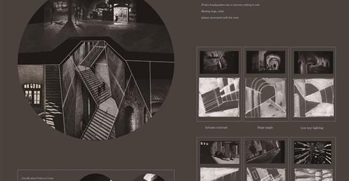 黑色電影題材大多來自社會黑暗面,透過直觀的視覺衝擊象徵了幻想破滅後的心態。常以鏡頭的壓低及歪斜,創造出人們觀看的那種不安心理狀態,使畫面產生不平行狀態或是壓迫感,透過窺視的角度營造懸疑不安的氣氛;光線在空間中產生戲劇化的效果,百葉窗透出的光線在空間切割成線狀,而照射在物體上產生出極大的對比性,亮面與黑暗面強烈的反差,使得黑暗面表現更加極致,是人們對於不安惶恐的轉化。