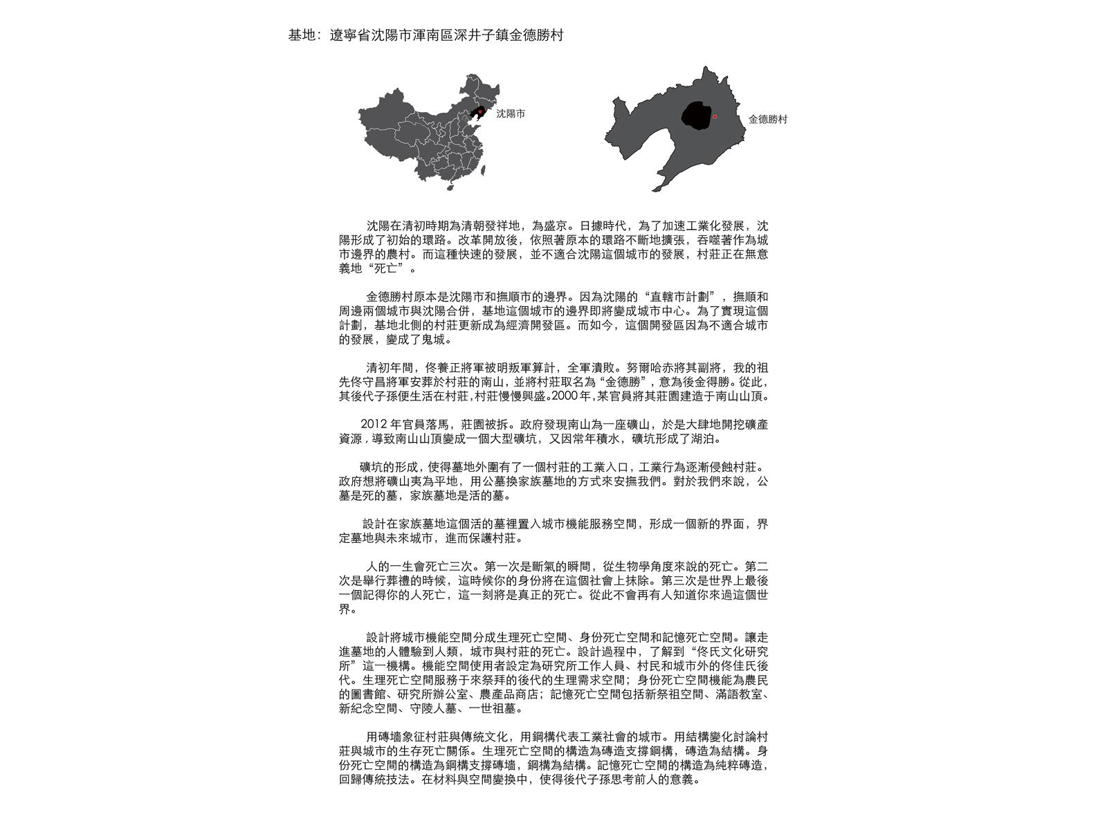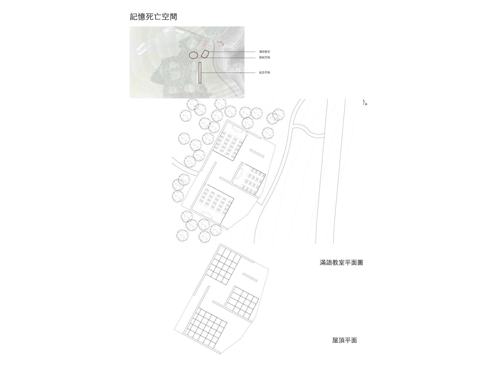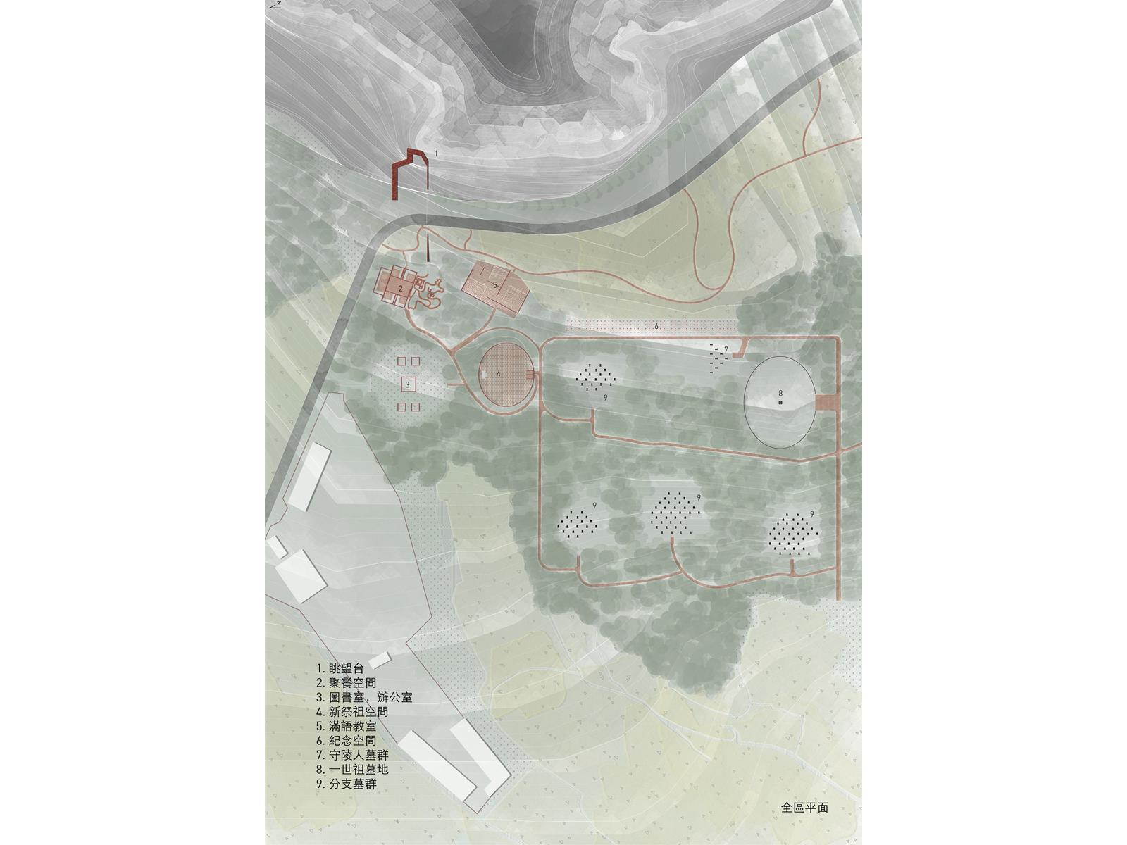 設計將城市機能空間分成生理死亡空間、身份死亡空間和記憶死亡空間。讓走進墓地的人體驗到人類,城市與村莊的死亡。設計過程中,了解到“佟氏文化研究所”這一機構。機能空間使用者設定為研究所工作人員、村民和城市外的佟佳氏後代。生理死亡空間服務于來祭拜的後代的生理需求空間;身份死亡空間機能為農民的圖書館、研究所辦公室、農產品商店;記憶死亡空間包括新祭祖空間、滿語教室、新紀念空間、守陵人墓、一世祖墓。