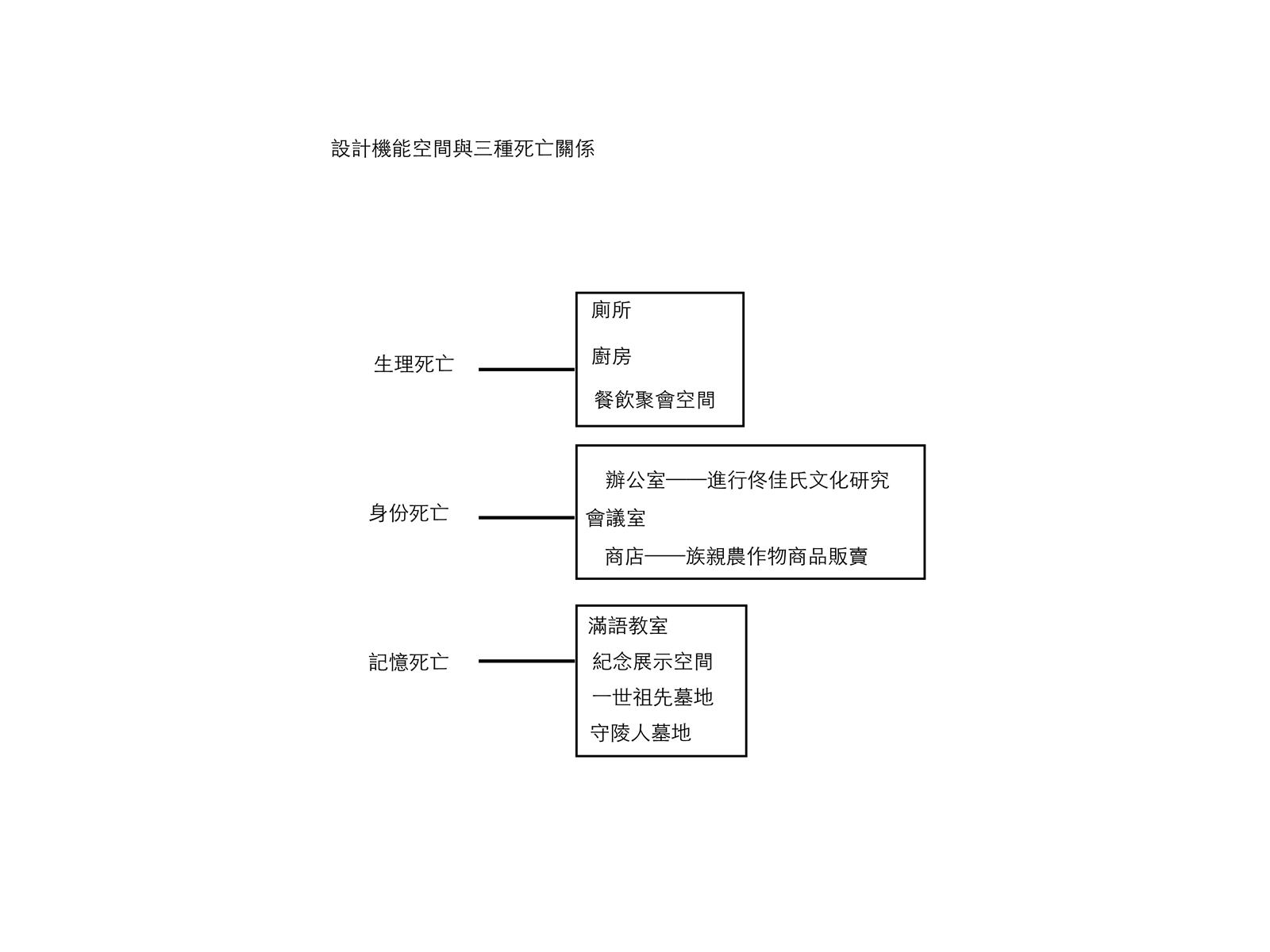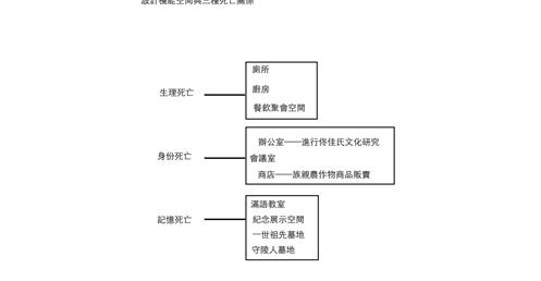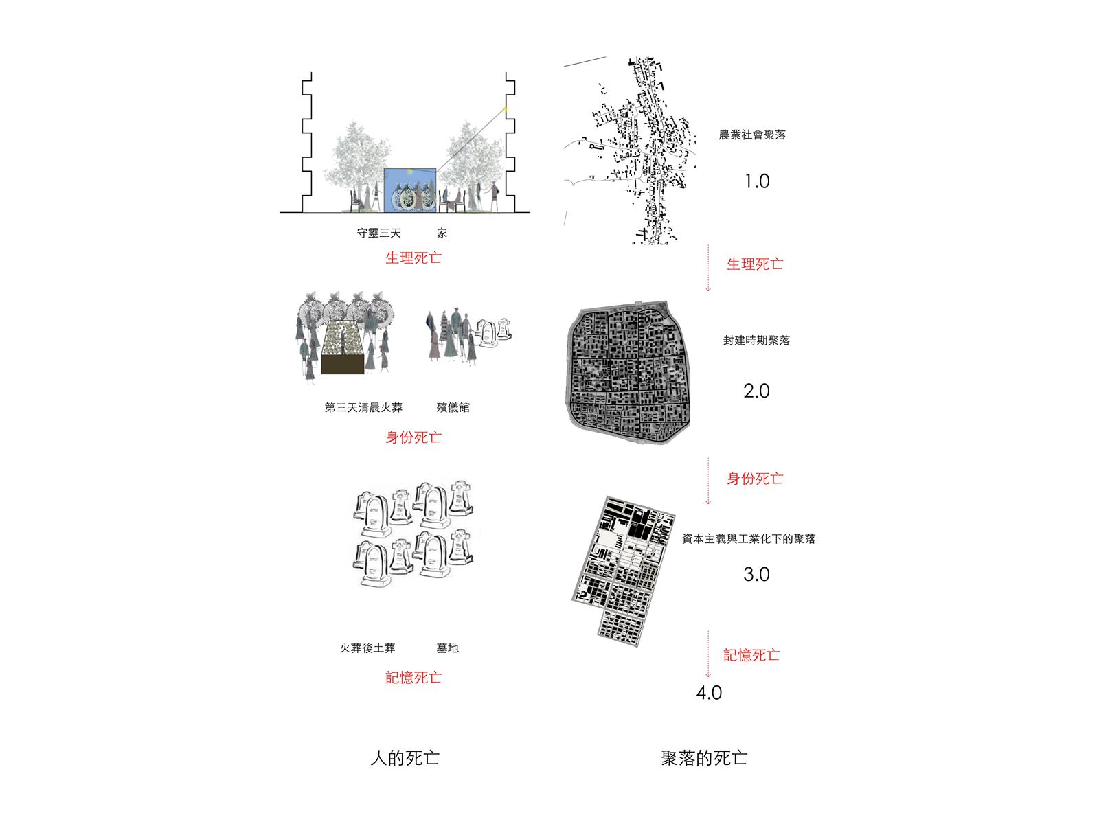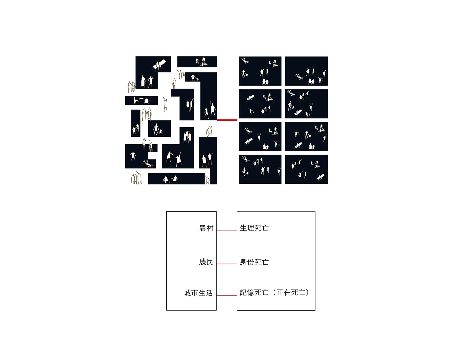 設計將城市機能空間分成生理死亡空間、身份死亡空間和記憶死亡空間。讓走進墓地的人體驗到人類,城市與村莊的死亡。設計過程中,了解到“佟氏文化研究所”這一機構。機能空間使用者設定為研究所工作人員、村民和城市外的佟佳氏後代。生理死亡空間服務于來祭拜的後代的生理需求空間;身份死亡空間機能為農民的圖書館、研究所辦公室、農產品商店;記憶死亡空間包括新祭祖空間、滿語教室、新紀念空間、守陵人墓、一世祖墓。