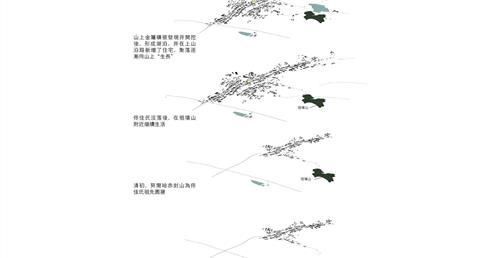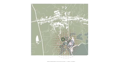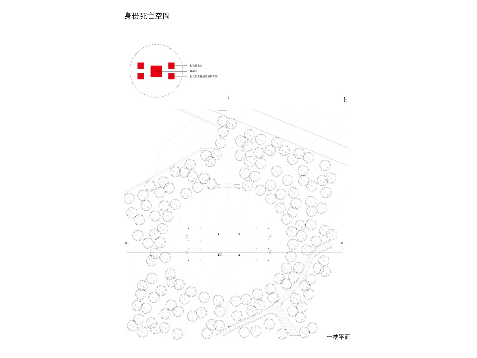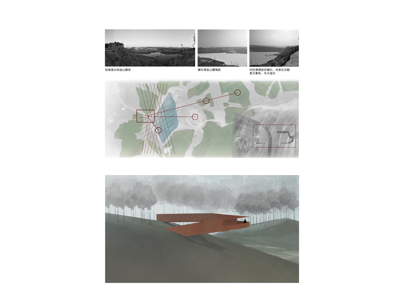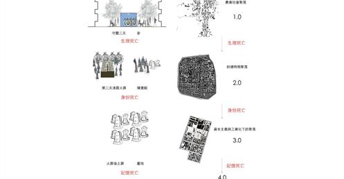 設計在家族墓地這個活的墓裡置入城市機能服務空間,形成一個新的界面,界定墓地與未來城市,進而保護村莊。