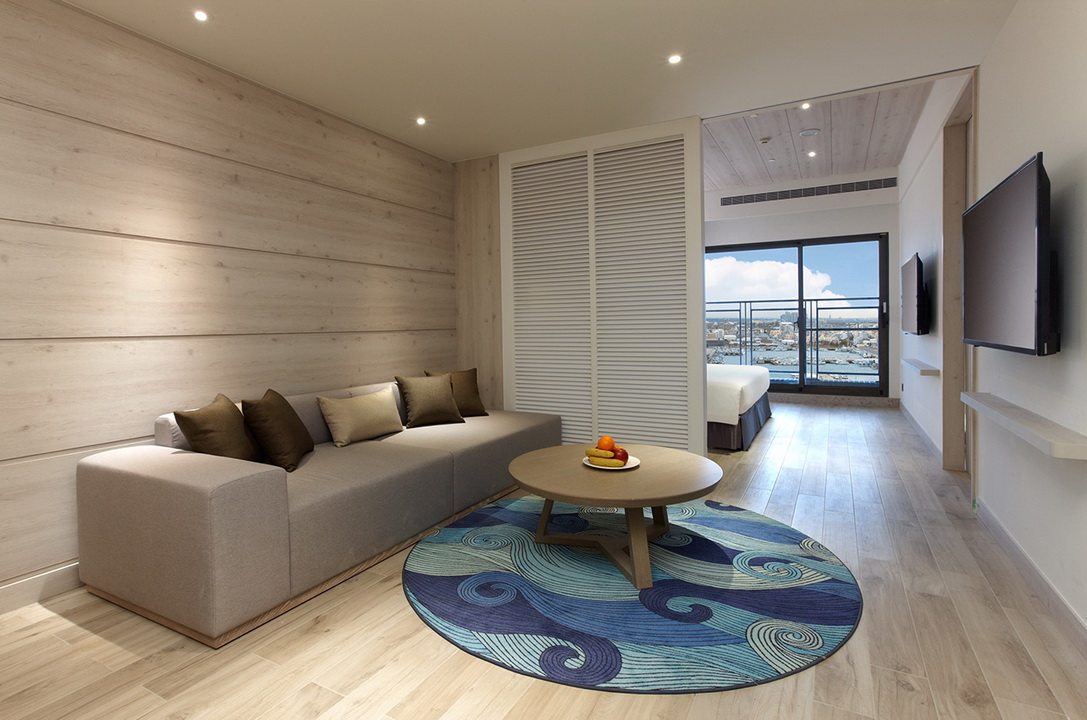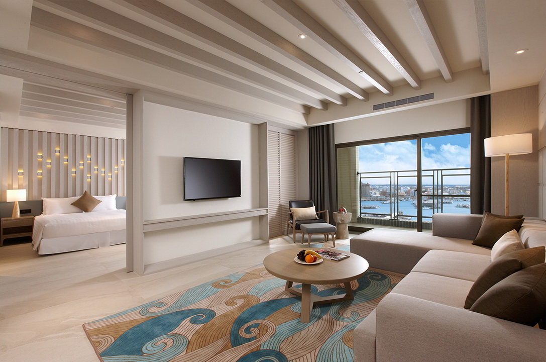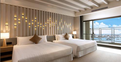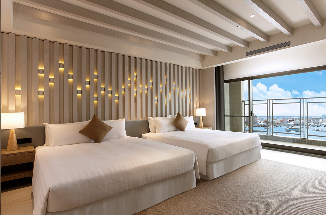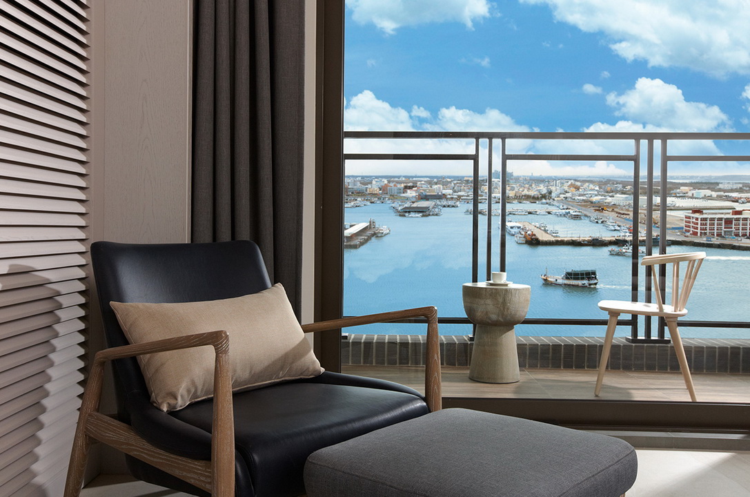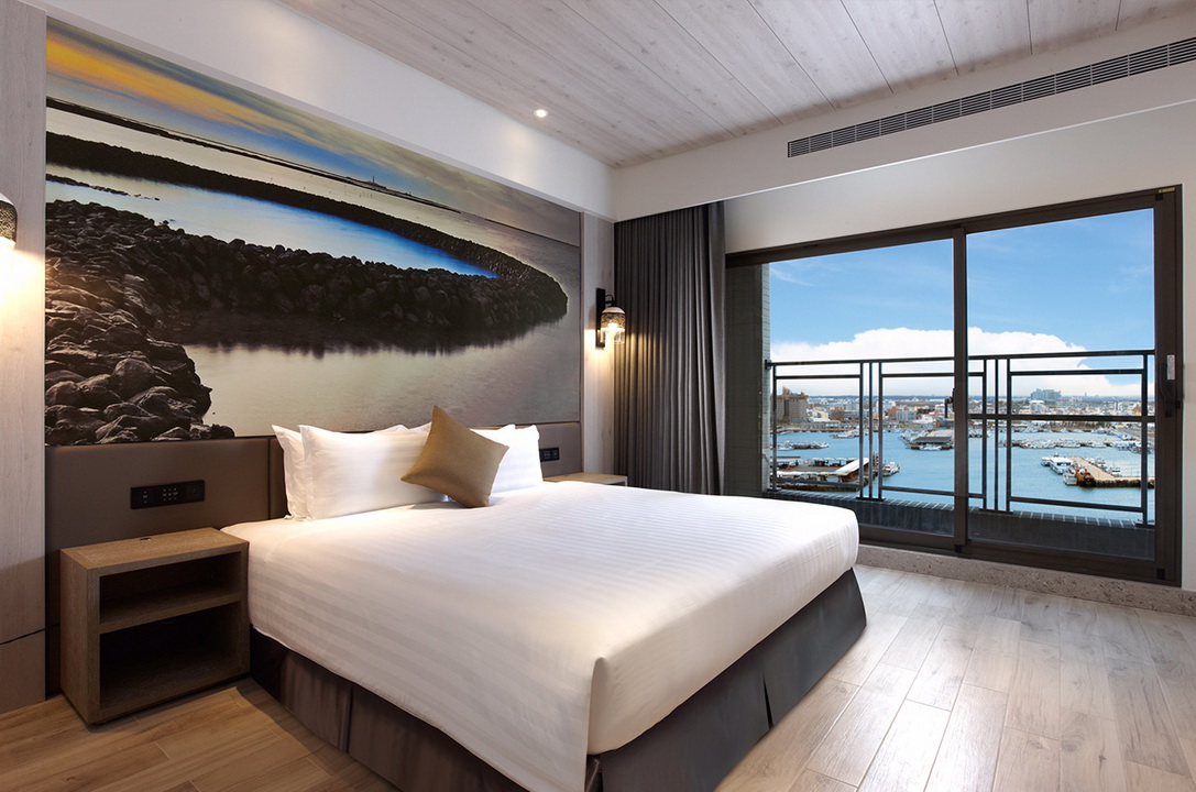 擷取當地的漁業元素及具時代性的裝飾窗稜格柵,搭配海洋色調的軟件及清爽的木材質,讓人即使在室內也有沉浸蔚藍海的沁涼,而客房也延續整體概念,於簡約舒適的空間中點綴在地人文元素,大片落地窗讓人盡覽菊島風情之外,也框出明信片般的美麗畫面。