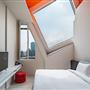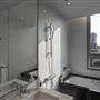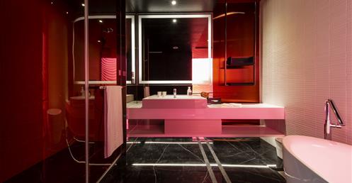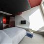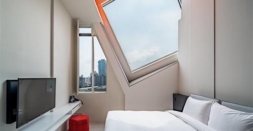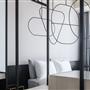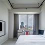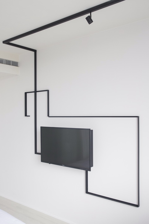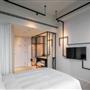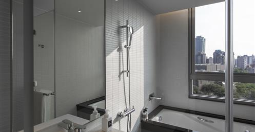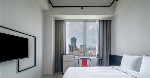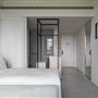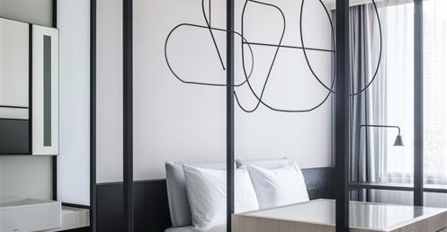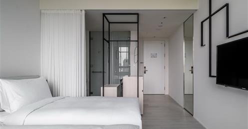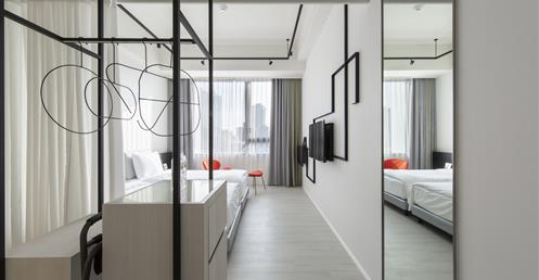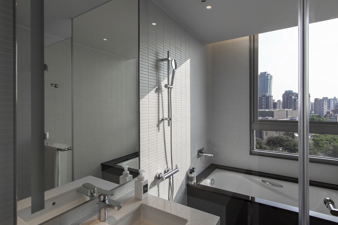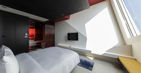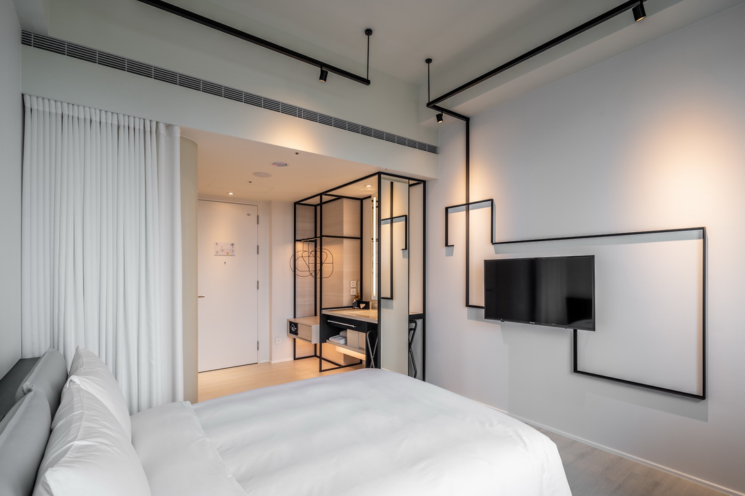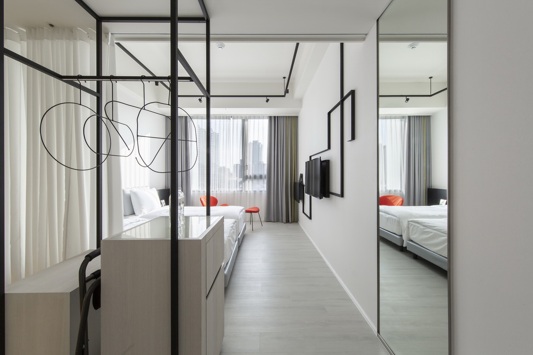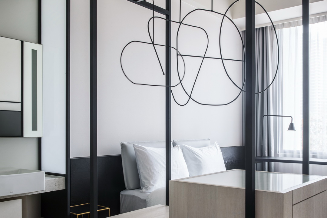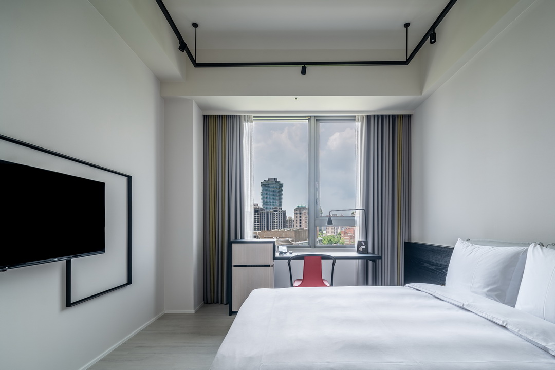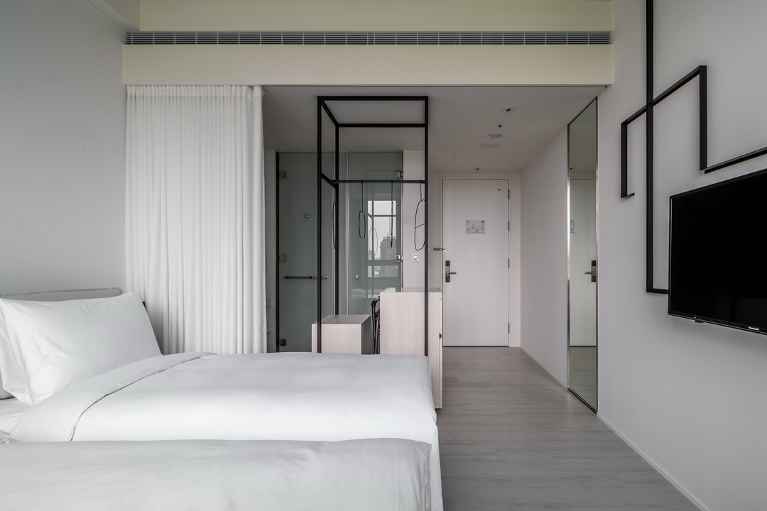 全白意象貫穿客房,藏有燈光的黑色鐵件線條巧妙地將「中」這個文字描繪出來,方正溫暖的格局與大片景觀窗,讓旅人充分欣賞城市天光與美麗景觀