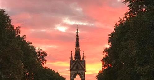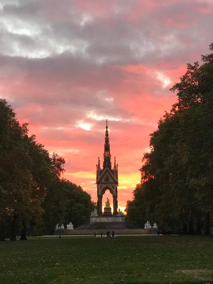 關館時間是17:30離天黑還有一段時間,決定轉移去海德公園晃晃,看一下傳說中的One Hyde Park,以及蛇行藝廊(2018年由Frida Escobedo設計),在離開時,還剛好看到阿爾伯特紀念亭映照半天晚霞,旁邊慢跑的老外站在一旁驚嘆不已,還要趴趴拍的照片分享給她,讓她可以永遠記住這個感人時刻。