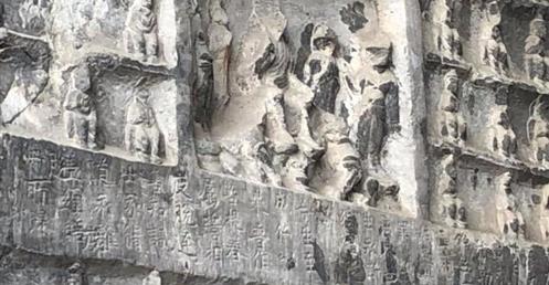 因伊水東西兩岸之香山和龍門山對峙如天然門闕,故古稱“伊闕”,隋唐以後,習稱龍門。《伊闕佛龕之碑》通高約5.00米、寬1.90米。由中書侍郎岑文本撰文,諫議大夫褚遂良書。字共三十二行,滿行五十一字。計一千六百餘字。碑文主要記述唐太宗第四子魏王李泰在其母長孫皇后逝世後做功德而開鑿,太宗貞觀十五年李泰與太子李承乾爭奪太子位,李泰借為母親開窟造像做功德,實有獲得太宗好感,為自已撈取政治資本的目的。落成後,唐太宗于這一年的十一月辛卯親自大閱于伊闕。這通碑原應為北魏所雕的賓陽中洞的造窟碑,到了唐代李泰為節省費用,竟就勢磨去原有碑文,又重新雕刻成唐碑的。 關於該碑的記載,始見於宋嘉祐六年(西元1061年)歐陽修之《集古錄》及趙明誠之《金石錄》。