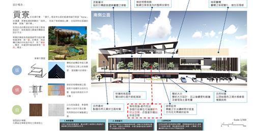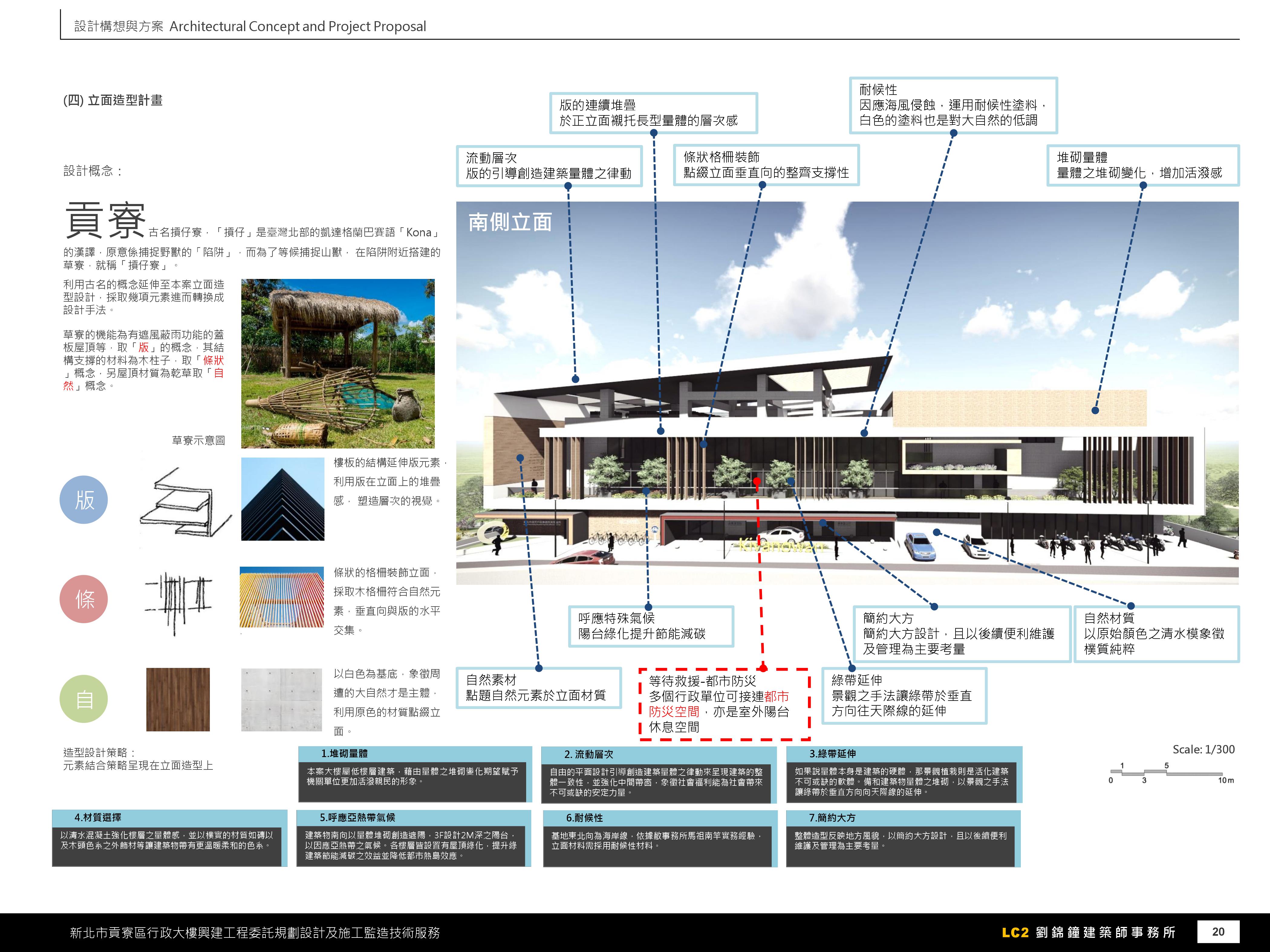 草寮的機能為有遮風蔽雨功能的蓋板屋頂等,取「版」的概念,其結構支撐的材料為木柱子,取「條狀」概念,另屋頂材質為乾草取「自然」概念。