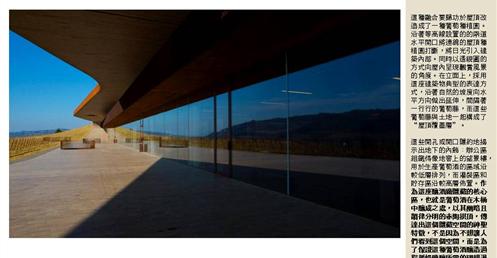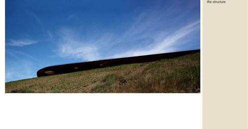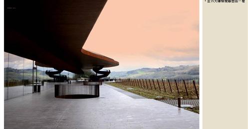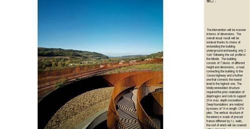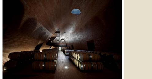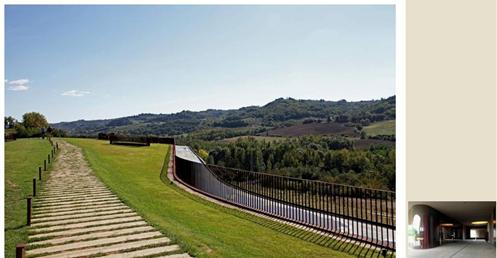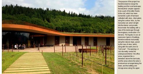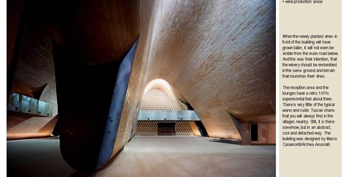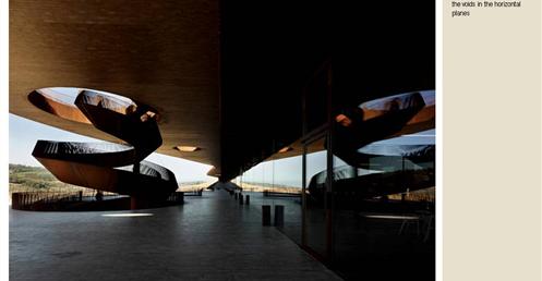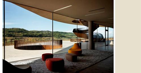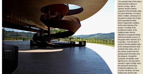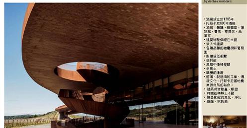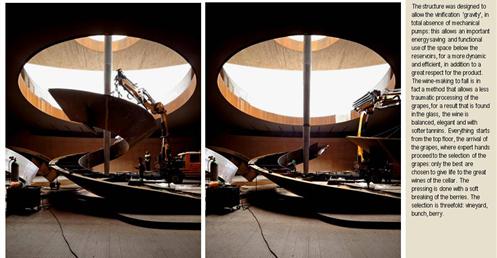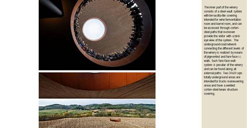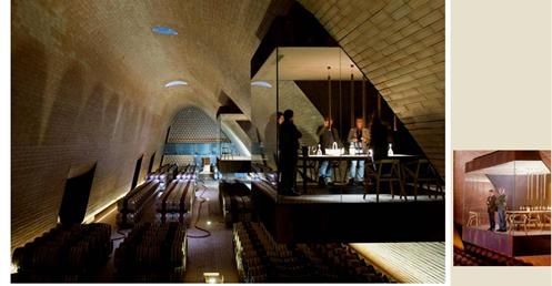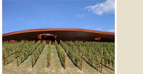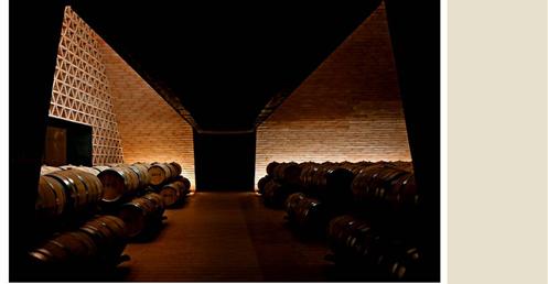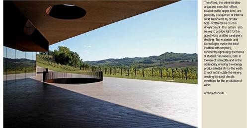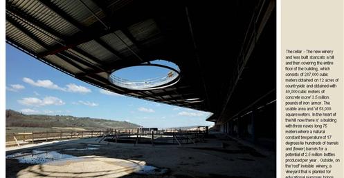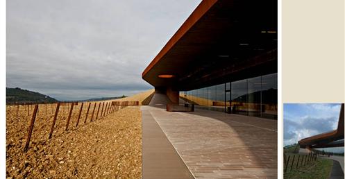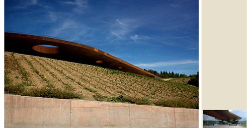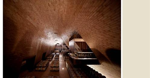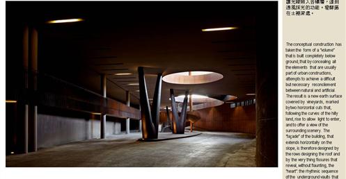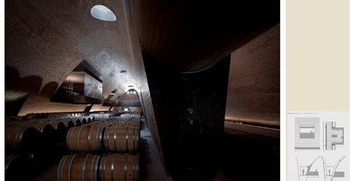 整個建築物結合工業、農業、文化、美食、藝術、歷史;建築體整個嵌入地底,對環境衝擊最小,地面層把葡萄園當作屋頂;釀酒區埋在地底,不規則拱型內部構造,保持一定溫濕度;呈現一種宗教般的靜謐;