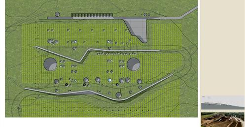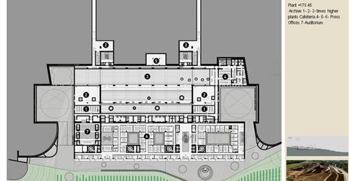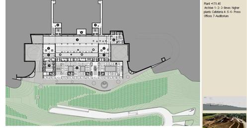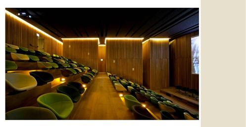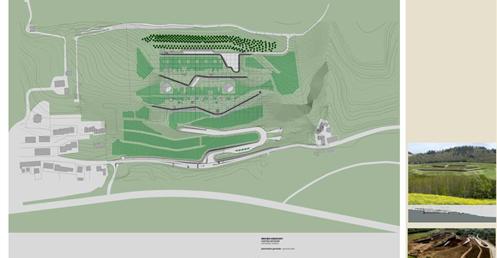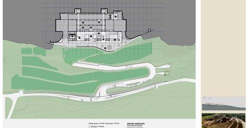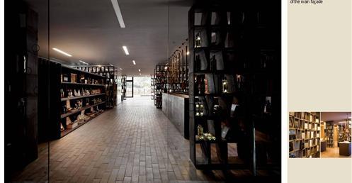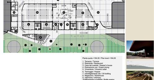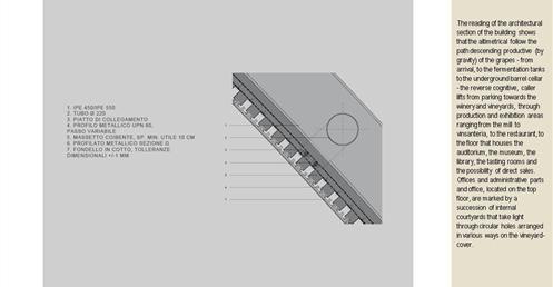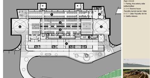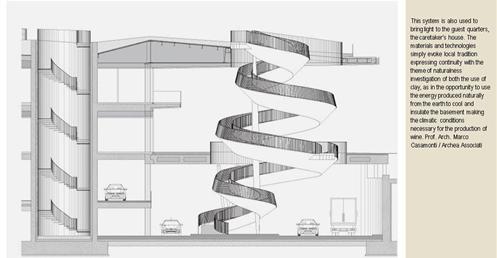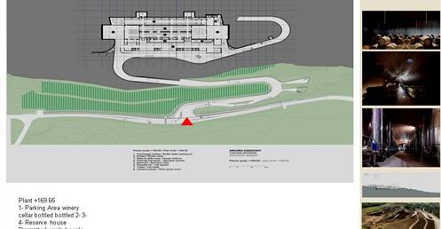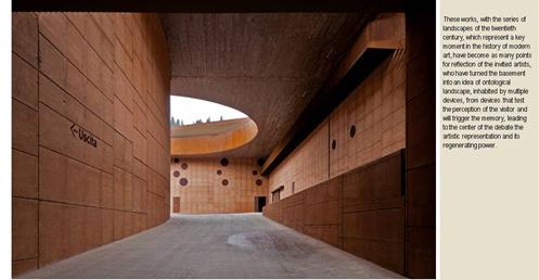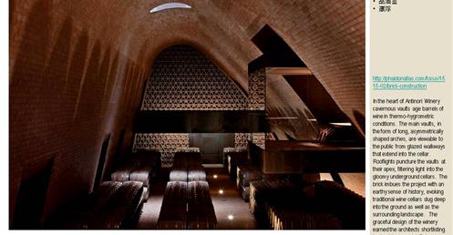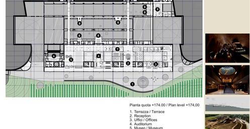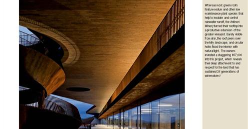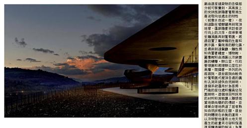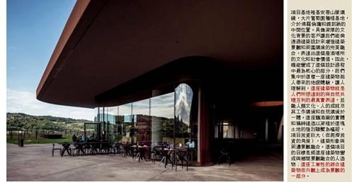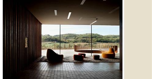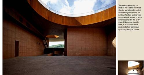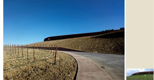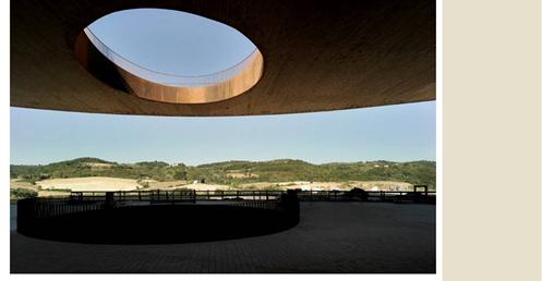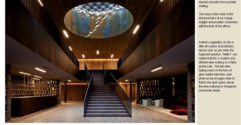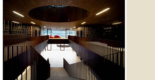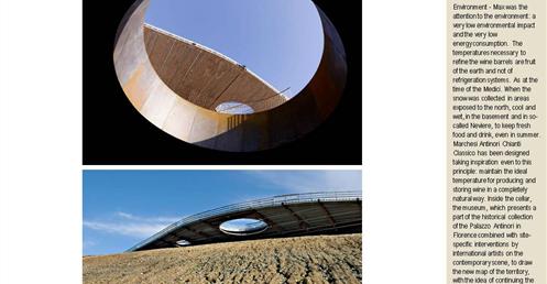 整個建築物結合工業、農業、文化、美食、藝術、歷史;建築體整個嵌入地底,對環境衝擊最小,地面層把葡萄園當作屋頂;釀酒區埋在地底,不規則拱型內部構造,保持一定溫濕度;呈現一種宗教般的靜謐;