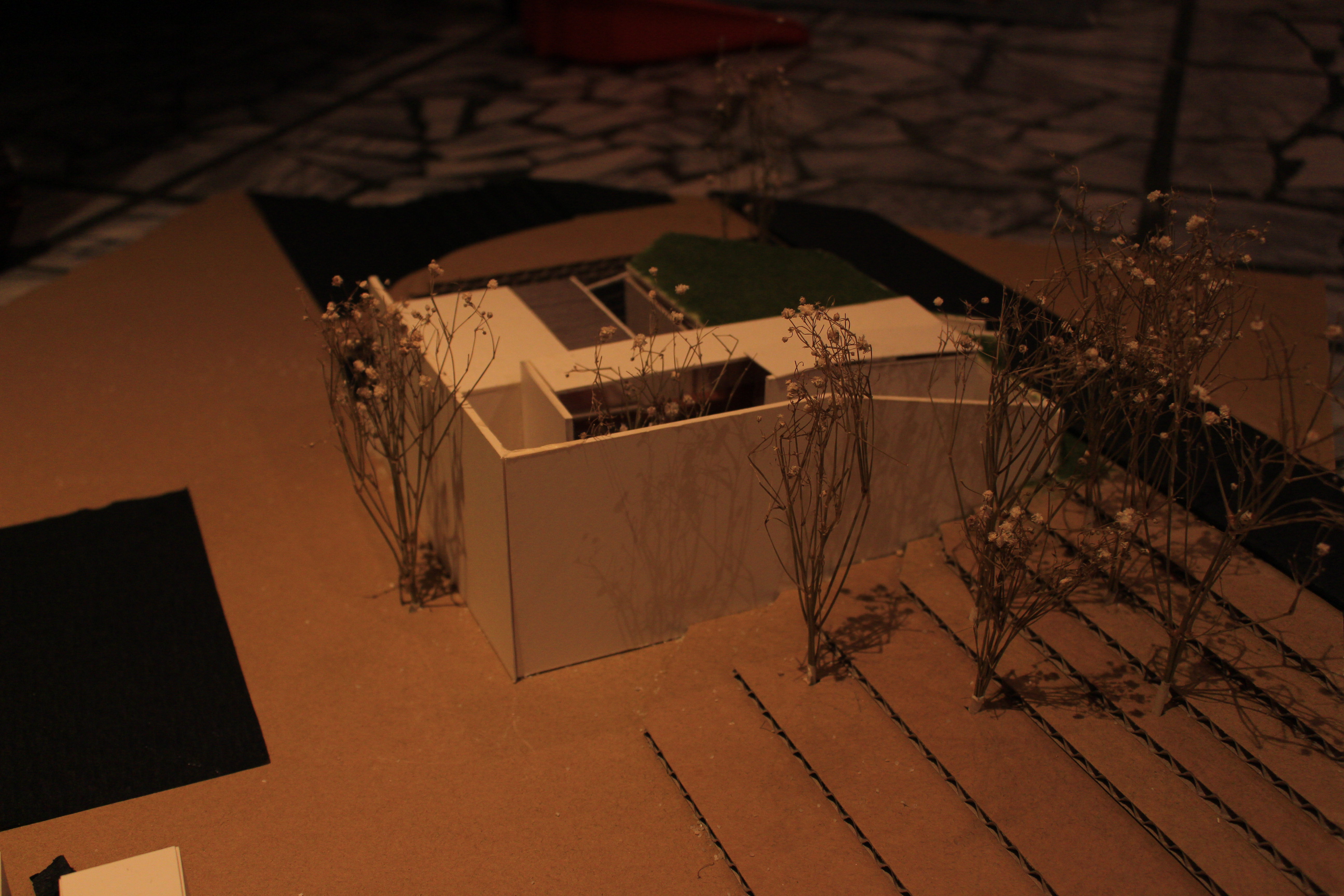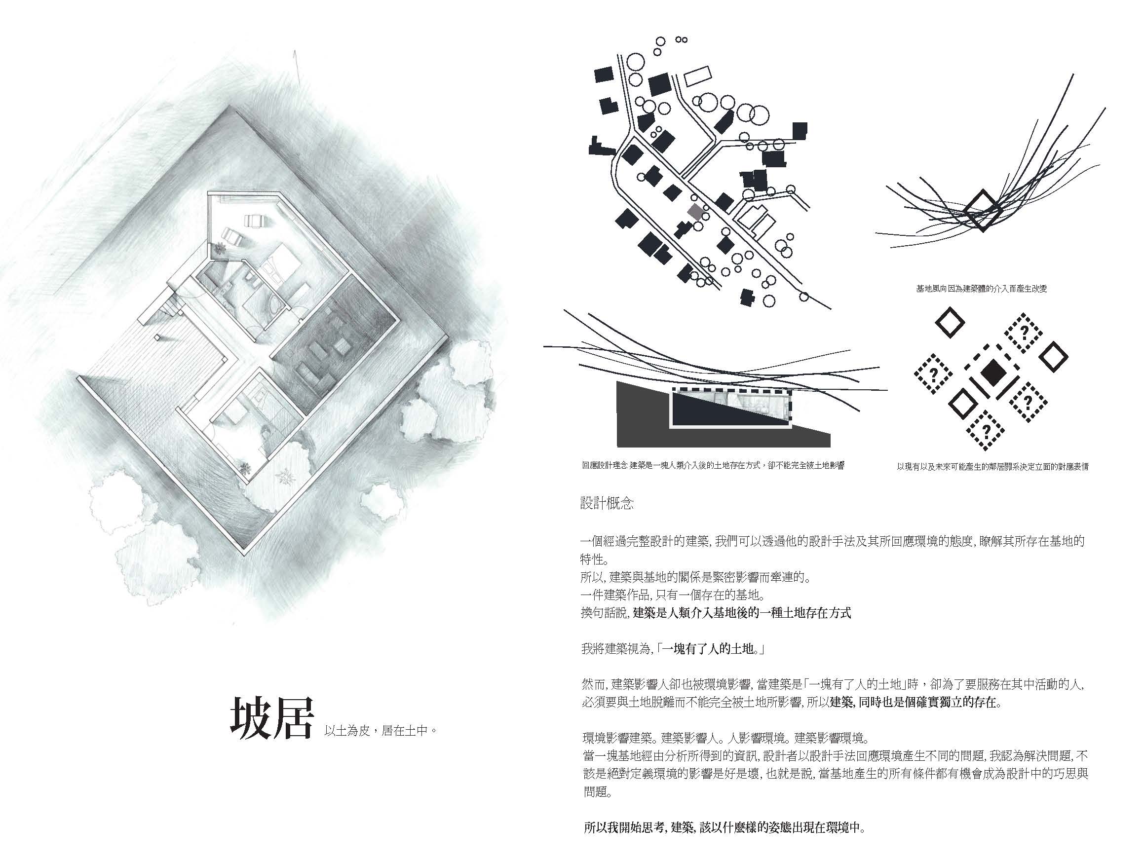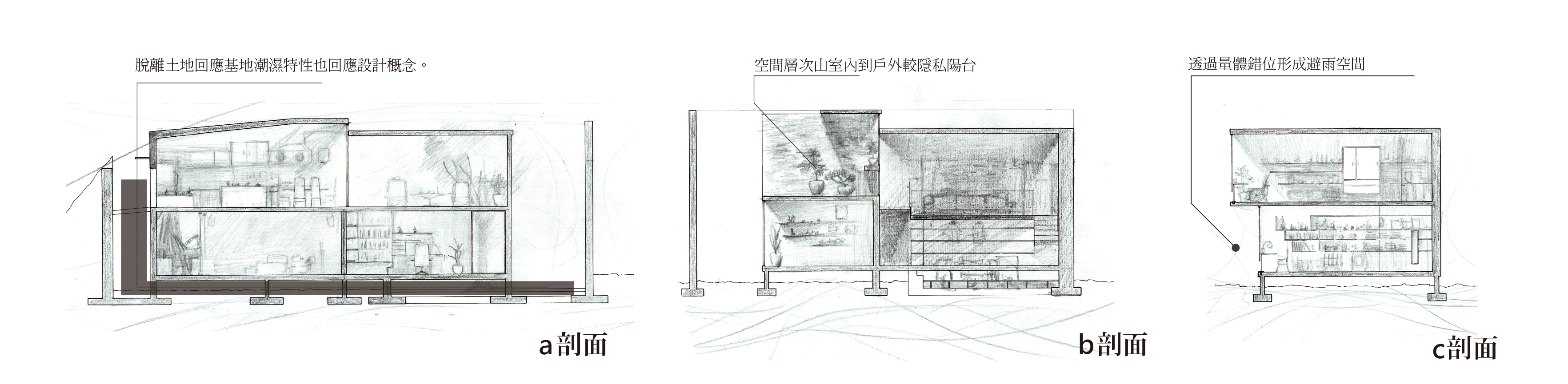 這塊基地,是一塊位於新竹寶山的山坡地,冬季來臨時從山坡上傾瀉而下的是潮濕且刺骨的九降風,在這樣的地形上建築的存在姿態變得很重要,用強硬的態度回應大自然絕對不是個長久之計,我透過壓低建築的迎風面,利用結合坡型的建築將風帶到建築物上方,解決了九降風帶給使用者的困擾,然而環境產生的特性不一定只有問題,我開始思考如何能進一步的利用,透過牆面安排讓風引入建築對使用者達到不同的機能,帶走廚房的油煙,讓曬衣空間通風等。這是一塊山坡地,而在台灣的山坡地會產生一個很大的問題,潮濕 ,同時必須將建築物置入於土地中而又必須產生對潮濕問題的回應,所以我將建築物與土地間的介面做了一個縫隙,這個縫隙不僅是對機能上解決潮濕問題的回應,同時也回到了我最初的想法,「建築在土地上存在的姿態」;因為有「人」所以建築不能完全被土地所影響,建築是土地的存在方式但它不是土地本身,於是設計了整個建築脫開的介面去面對土地。