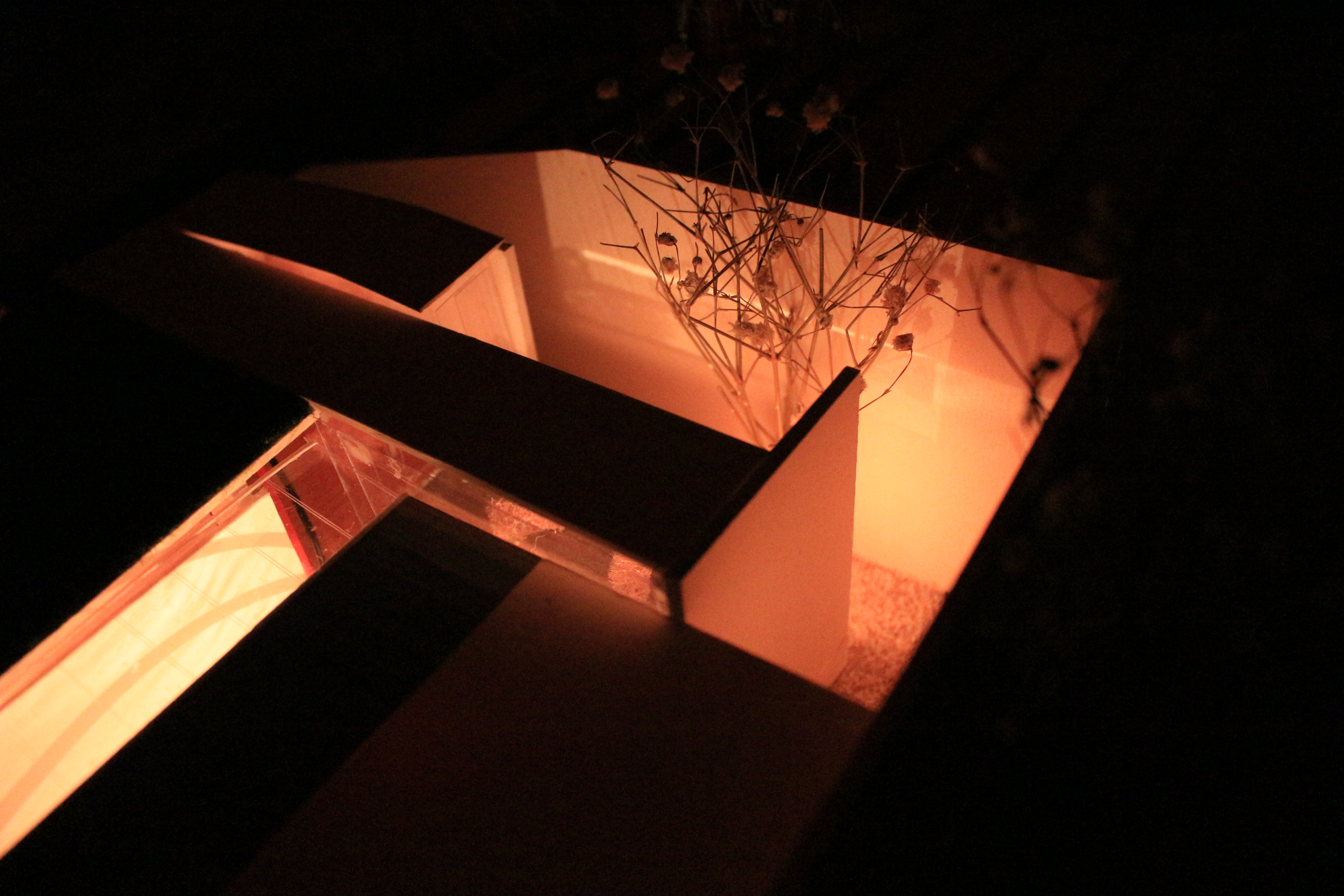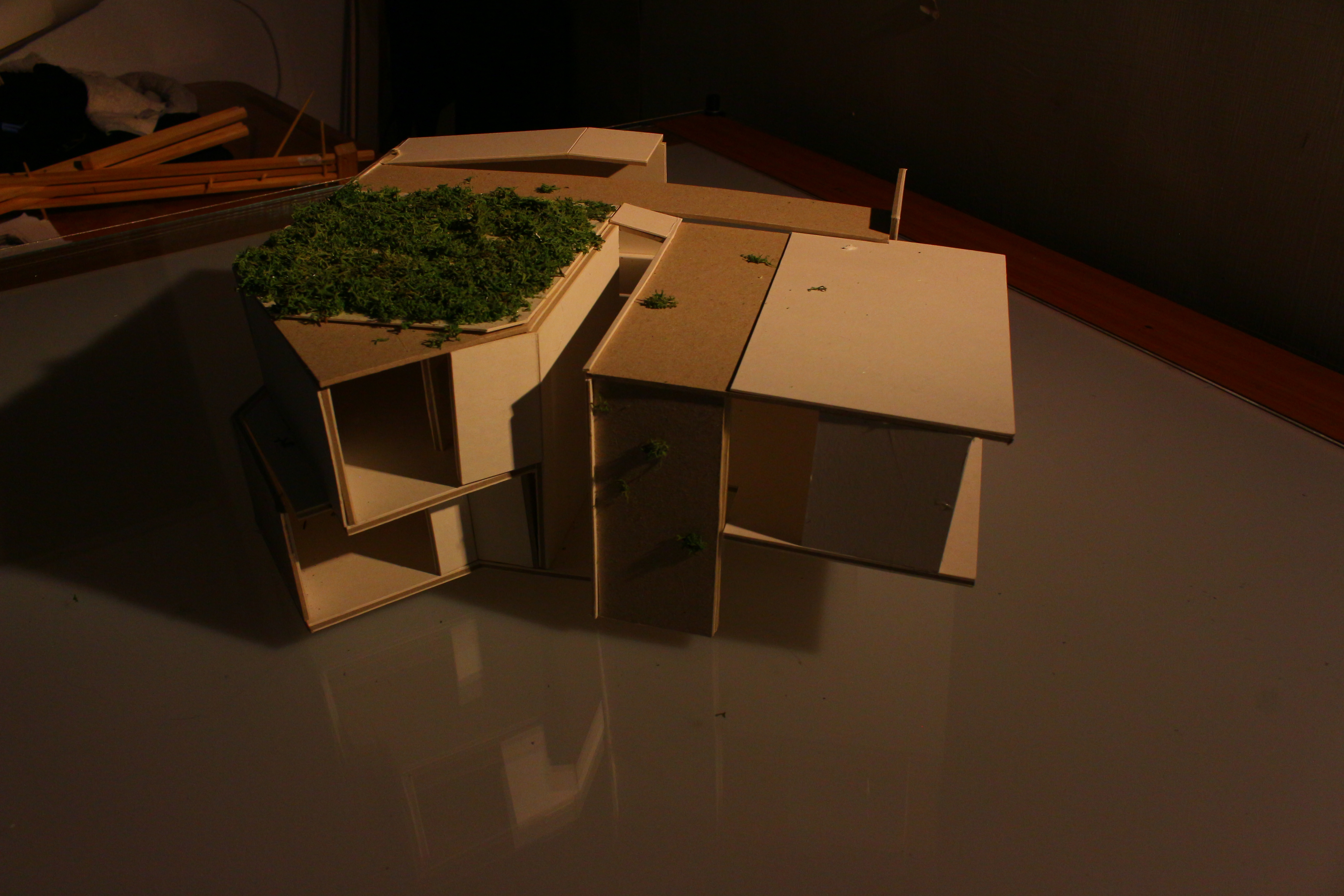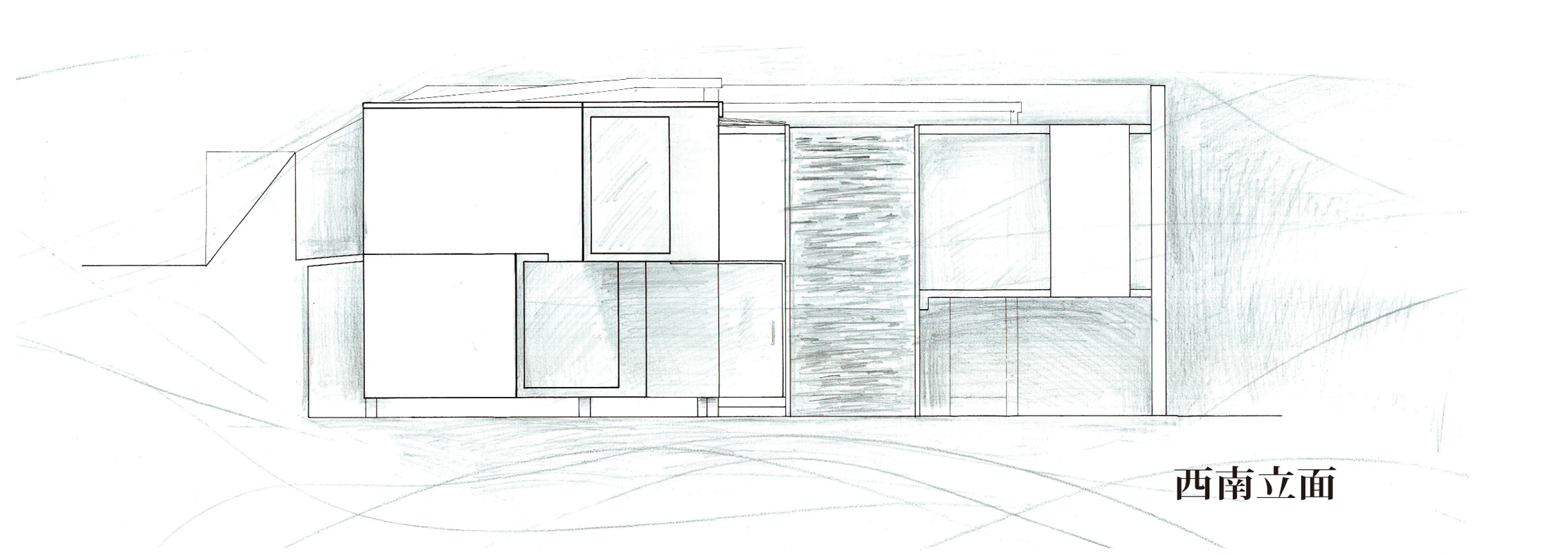 這塊基地,是一塊位於新竹寶山的山坡地,冬季來臨時從山坡上傾瀉而下的是潮濕且刺骨的九降風,在這樣的地形上建築的存在姿態變得很重要,用強硬的態度回應大自然絕對不是個長久之計,我透過壓低建築的迎風面,利用結合坡型的建築將風帶到建築物上方,解決了九降風帶給使用者的困擾,然而環境產生的特性不一定只有問題,我開始思考如何能進一步的利用,透過牆面安排讓風引入建築對使用者達到不同的機能,帶走廚房的油煙,讓曬衣空間通風等。這是一塊山坡地,而在台灣的山坡地會產生一個很大的問題,潮濕 ,同時必須將建築物置入於土地中而又必須產生對潮濕問題的回應,所以我將建築物與土地間的介面做了一個縫隙,這個縫隙不僅是對機能上解決潮濕問題的回應,同時也回到了我最初的想法,「建築在土地上存在的姿態」;因為有「人」所以建築不能完全被土地所影響,建築是土地的存在方式但它不是土地本身,於是設計了整個建築脫開的介面去面對土地。