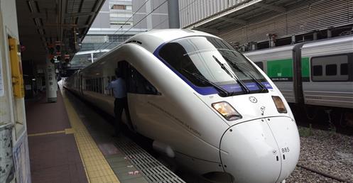 連接博多和長崎的時尚列車,初登場時, 以優雅新穎的流線型成為熱議話題, 885系列的白色車身令人印象深刻。車廂內的坐席非常寬敞舒適。從車窗欣賞窗外佐賀平原和有明海的悠閒田園風光,列車向目的地飛馳而去。