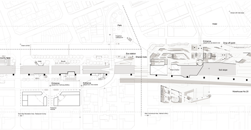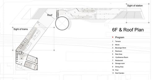 樓牆體框出停留活動空間及移動路線,中間樓層街道延伸,減少單棟建築的封閉性,高樓層強化水平視線。不管你從綠川或周遭的旅館