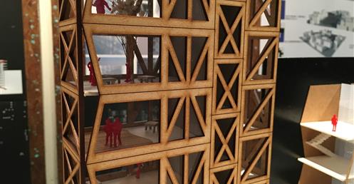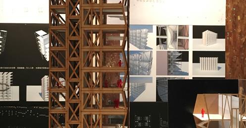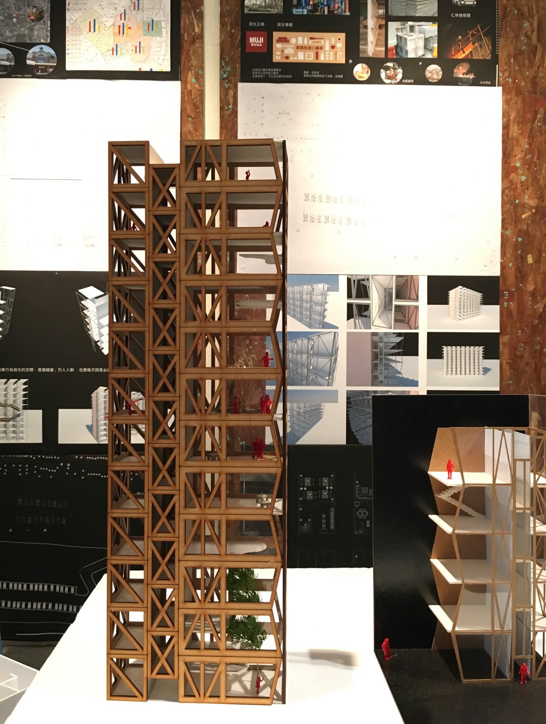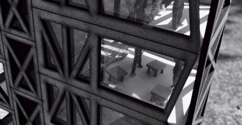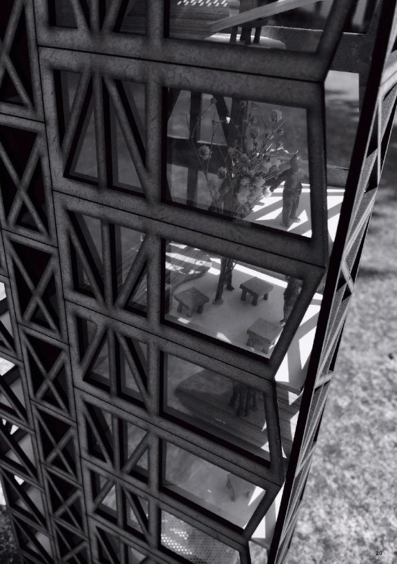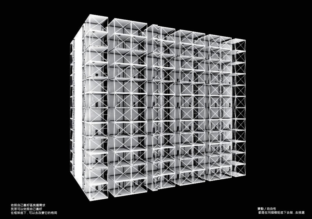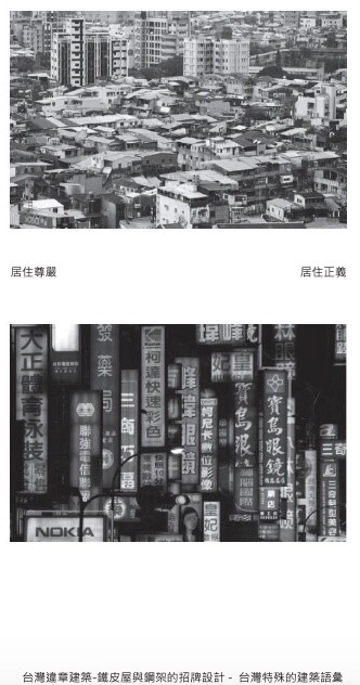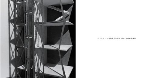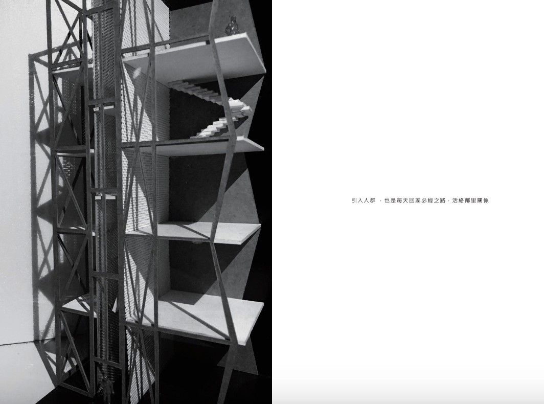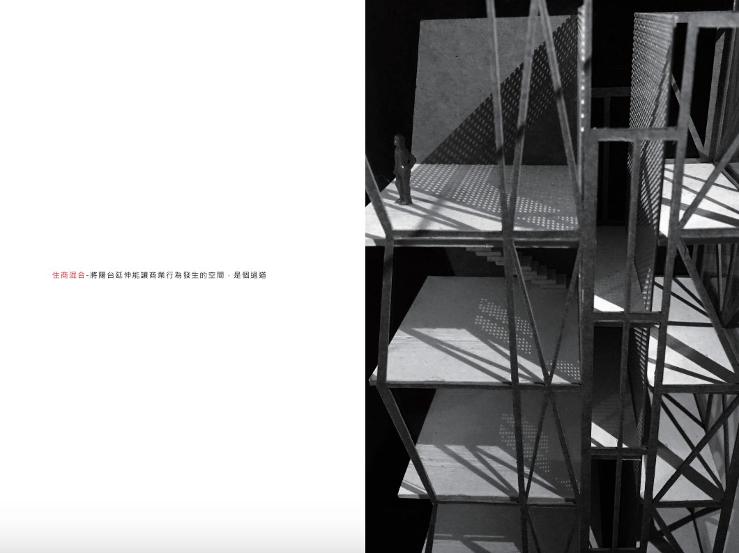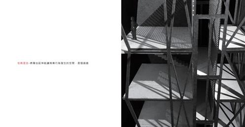在基地範圍內,發現了屬於我們臺灣特有的建築語彙:鐵窗、鐵皮、鷹架,綜合稱之為:擴充體。建築的主體與「擴充體」的組合。臺灣社會很有默契地以「材料」清楚區隔兩者,使用了鐵皮、鐵管這些較廉價而缺乏質感、品味的材料「不確定性」、與隨時準備修改的「彈性」這兩項特徵。如何將擴充體是「臨時性的配角」扭轉變成「永恆性的主角」是我的設計目標、策略。