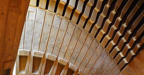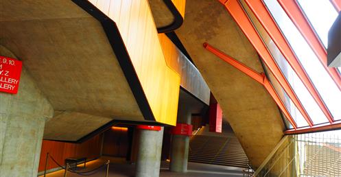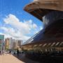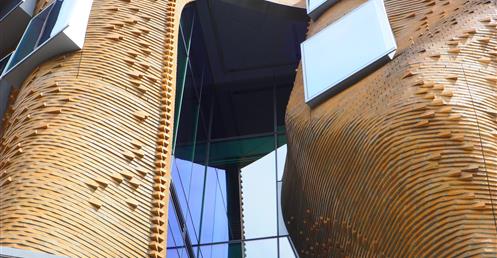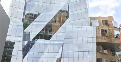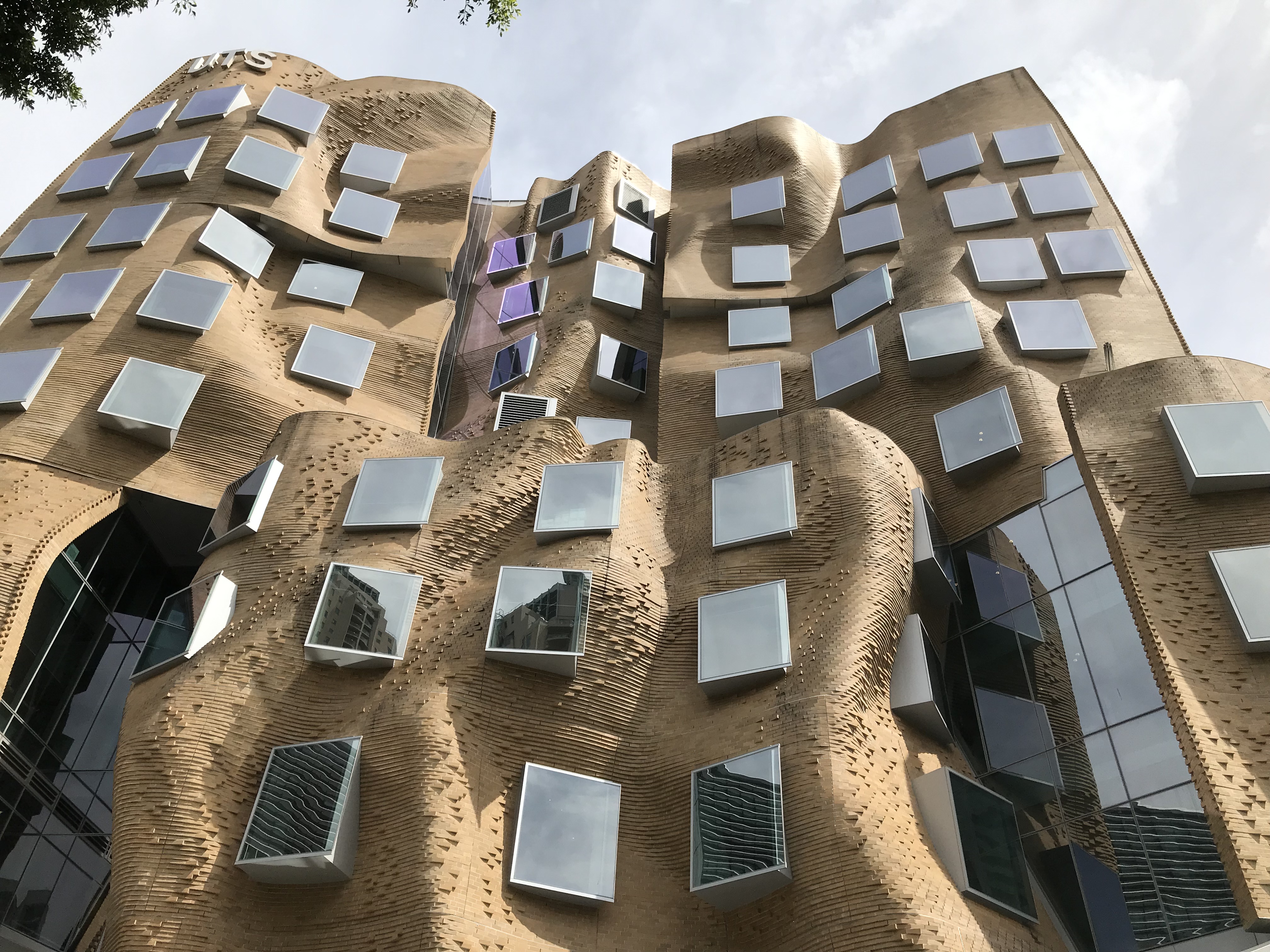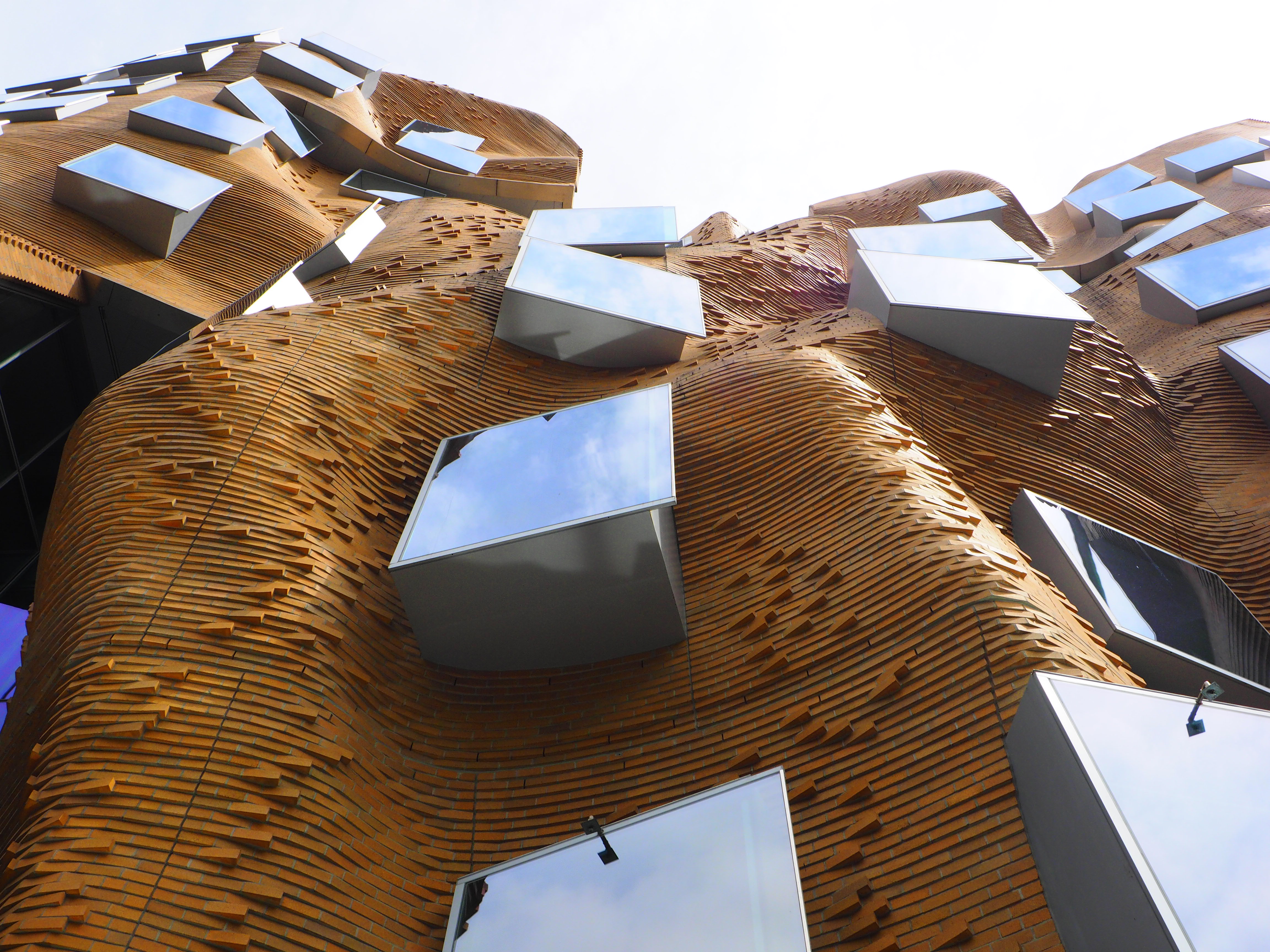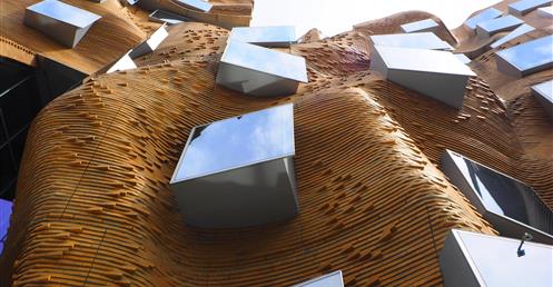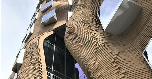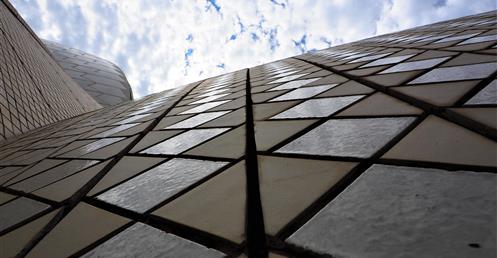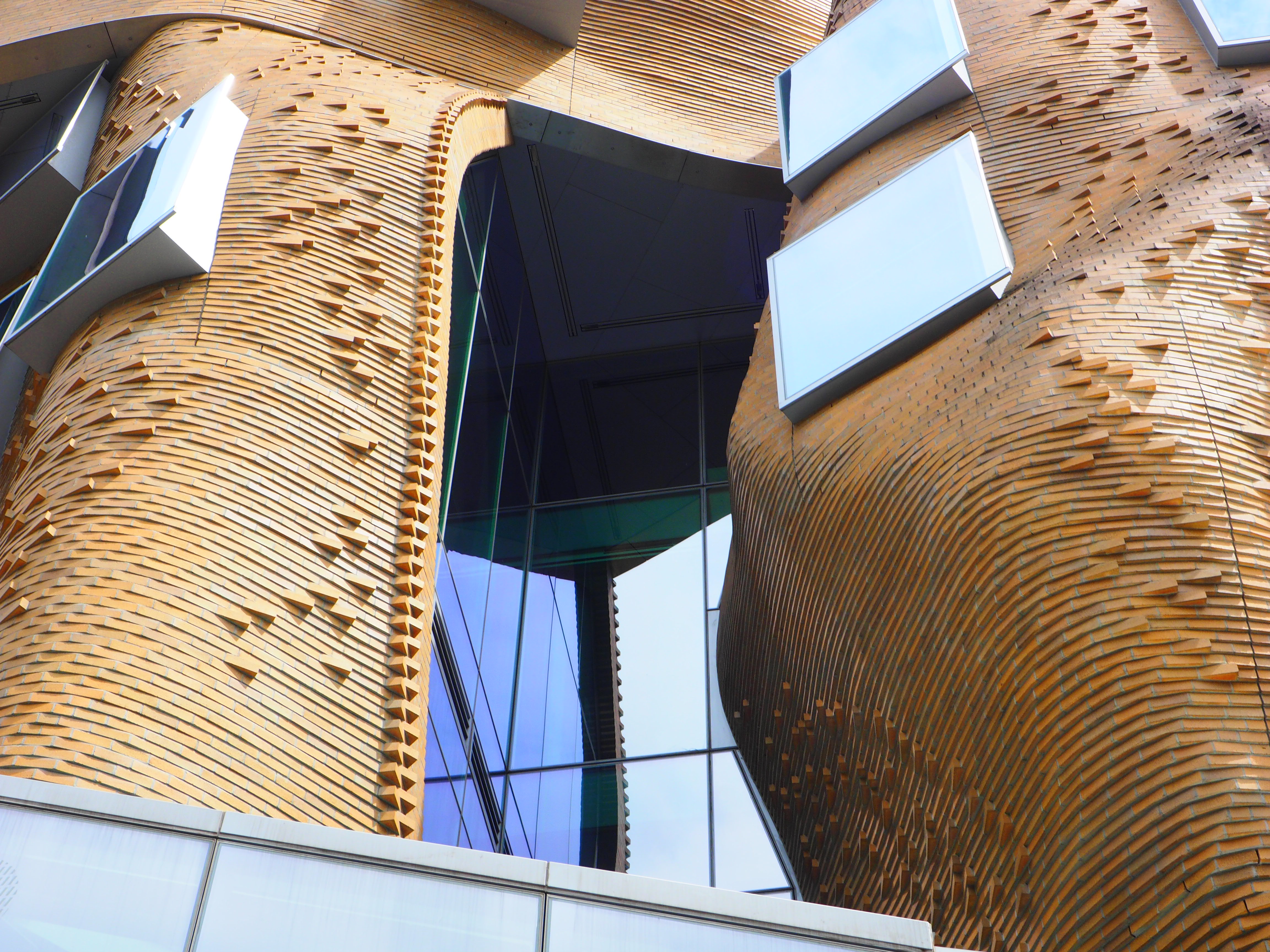 這座樓的立面用掉了32萬塊定製磚, 整體設計被形容成一個「壓扁的褐色紙袋子」。弗蘭克·蓋瑞說,「也許它很像一個褐色的紙袋子,但是這裡面很靈活,有很大的改變和移動的空間。」