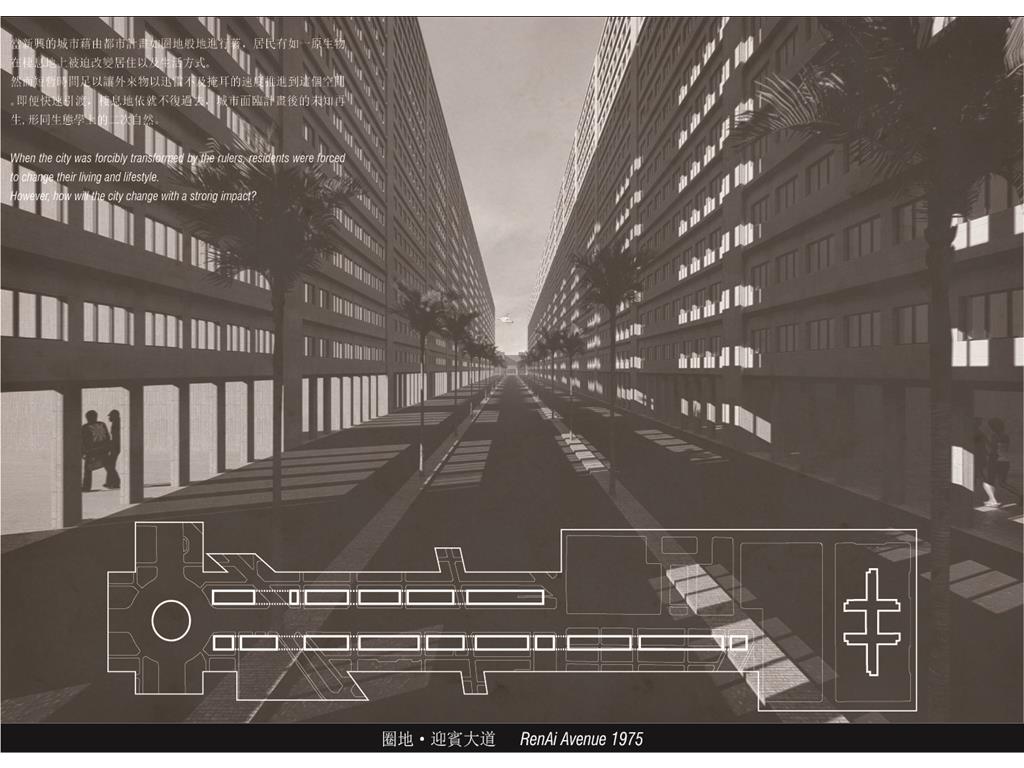 台北有兩座城,清朝的台北城/民國六十年代的信義計畫區。設計以信義計畫區這個建城計畫對台北帶來哪些影響,並在設計者與體驗者之間來回推演。