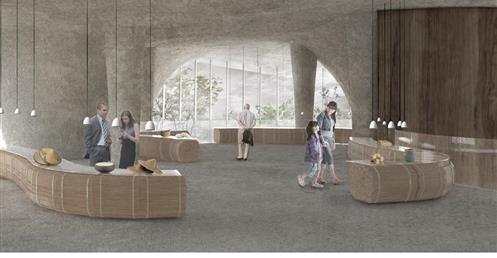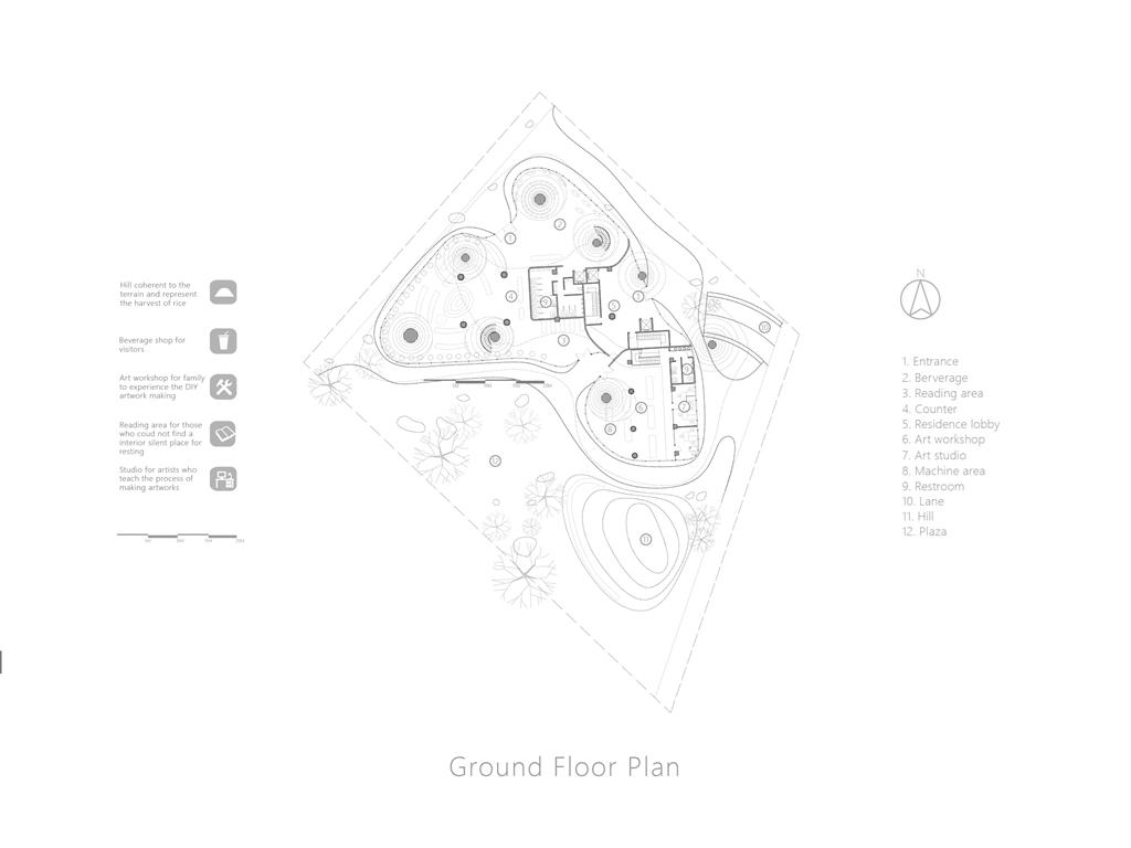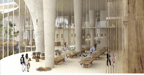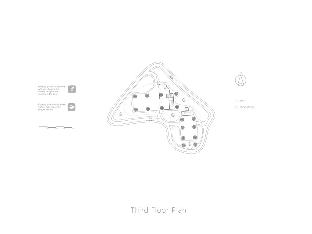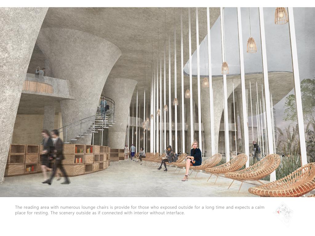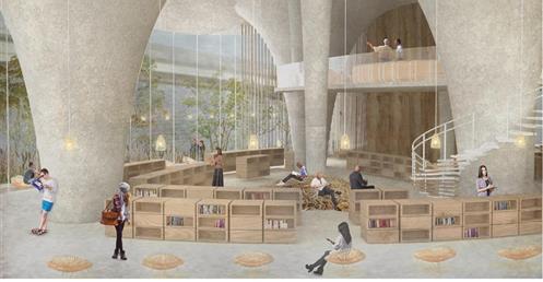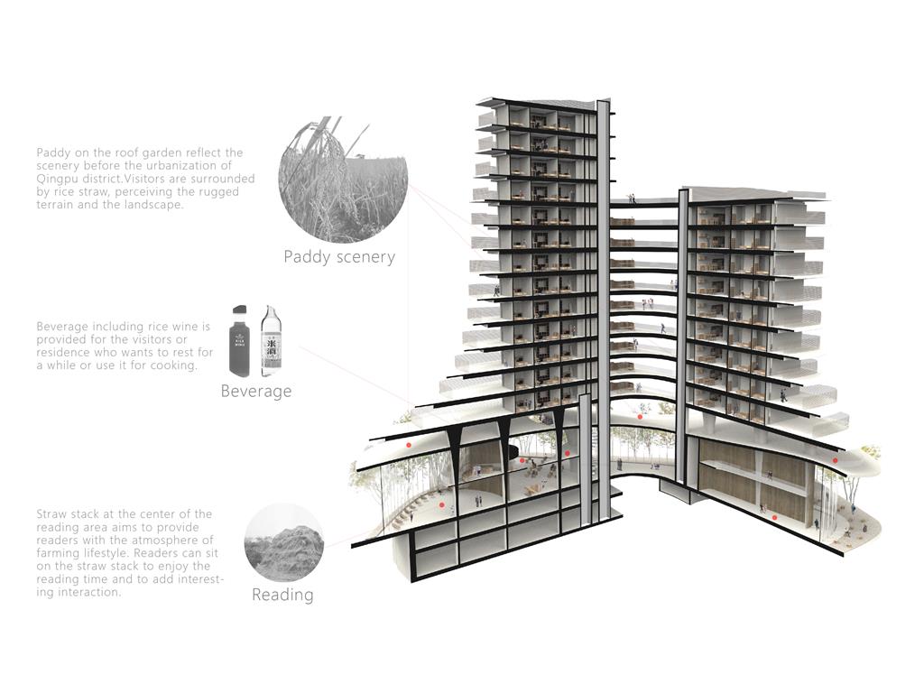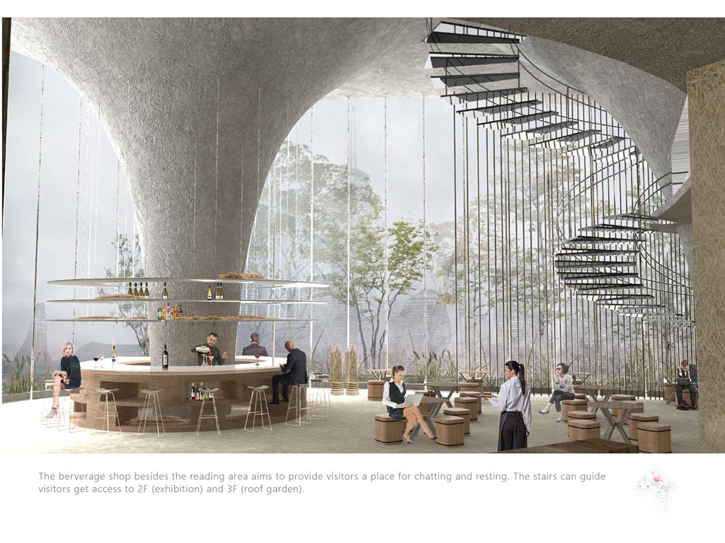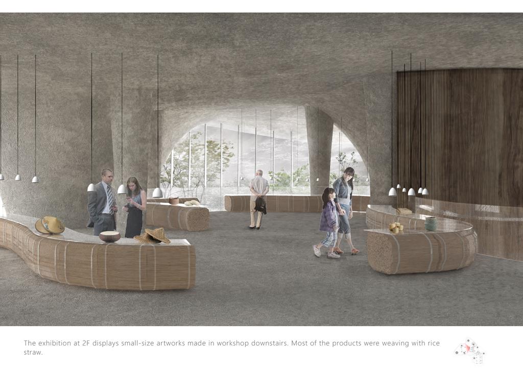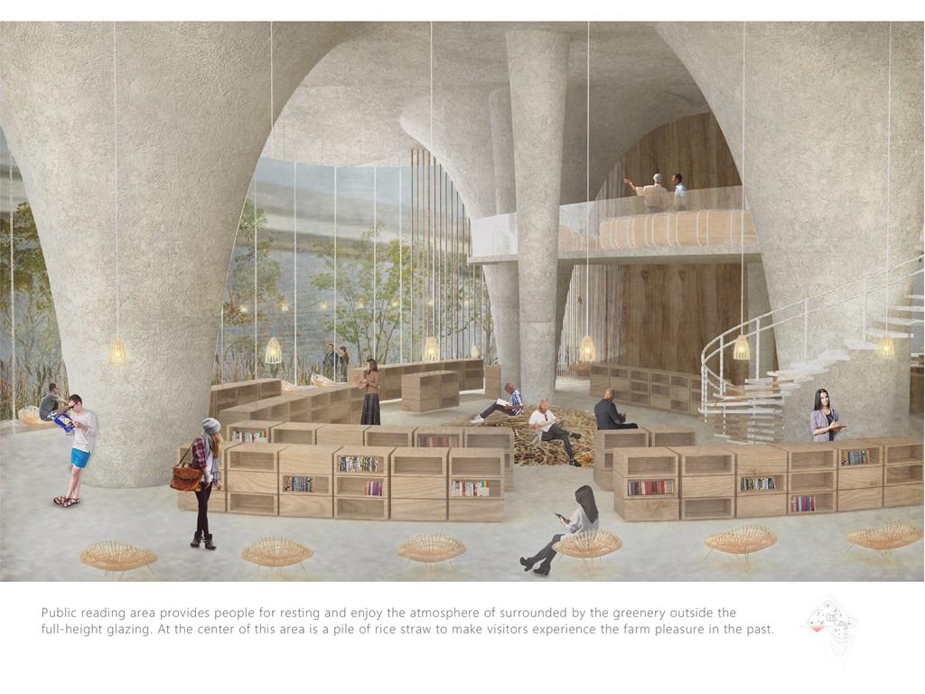 米食文化是台灣傳統農業文化中最重要的部分,回應我們在設計發想上的初心—「桃園在地農家傳統」,我們將「稻米」與「稻稈」廣泛地運用在建築材料與室內設計上,透過稻稈製成家具、書架、帷幕等,並創造以水稻田意象為主題的空中廣場,讓群眾能最直接地接觸、認識這樣美好的農業文化。