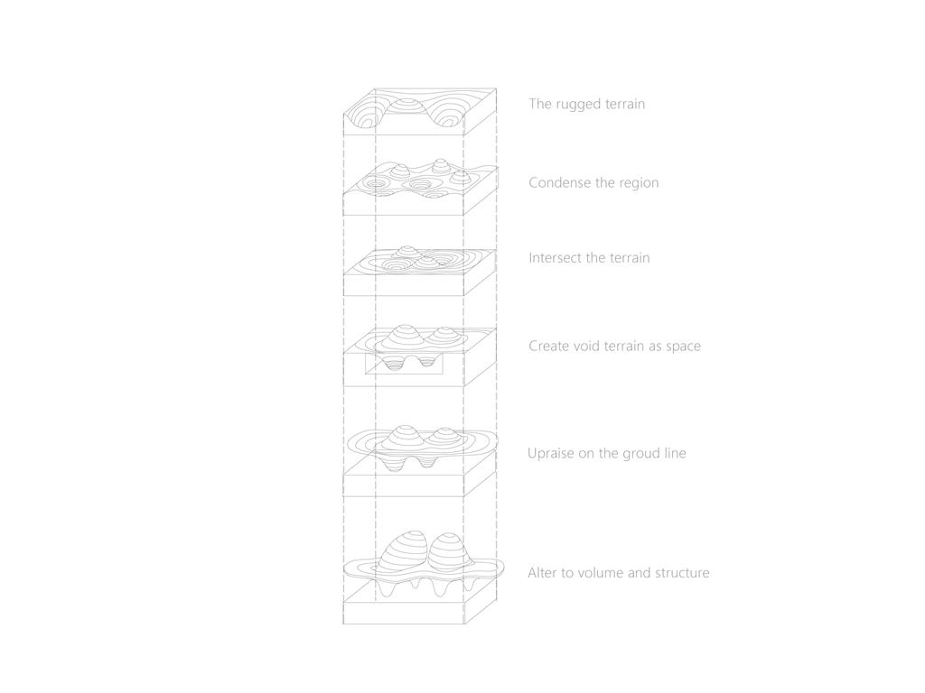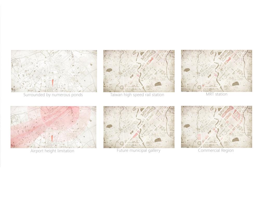「青埔的地形」與「桃園在地農家傳統」是這次設計發展的兩大主軸,我們運用桃園「千塘鄉」的自然特色,提取「土丘」與「埤塘」具有明顯的高低落差、攏起與下凹的地形元素,作為整體結構型式與造型設計的發展方向。