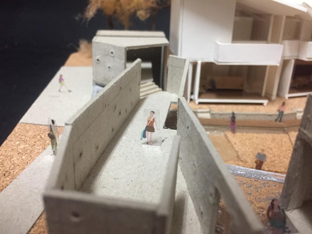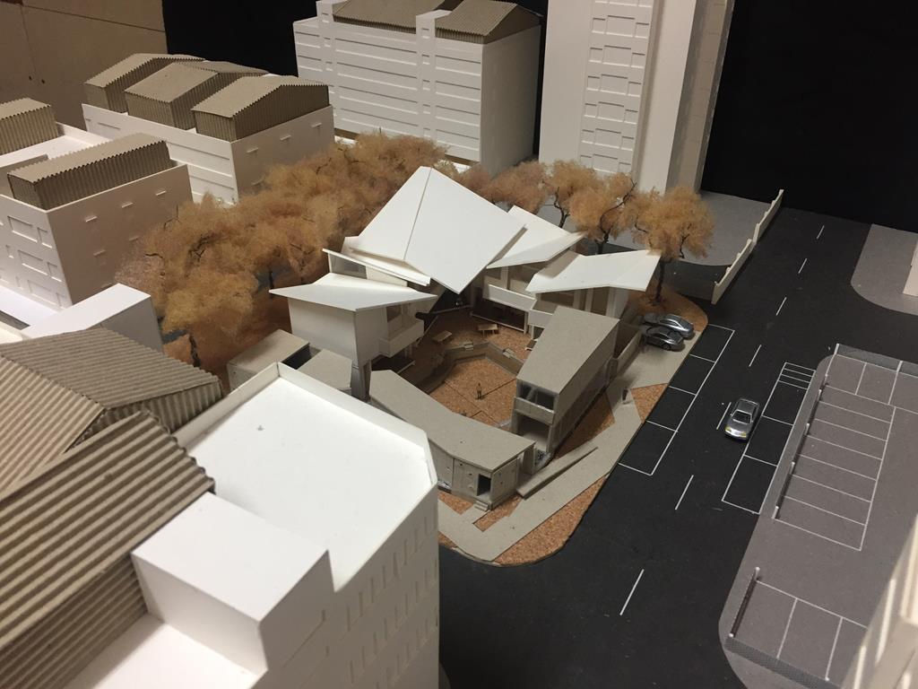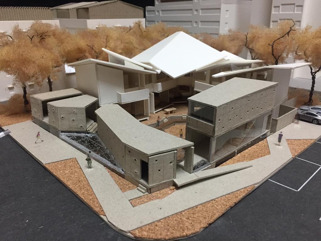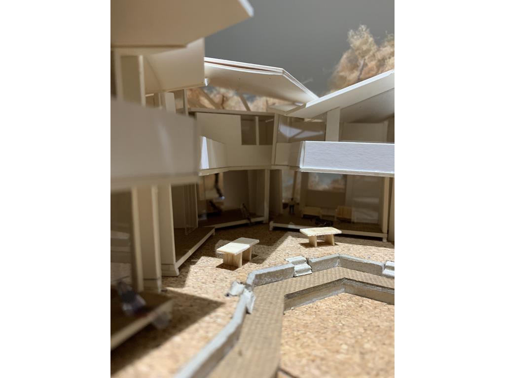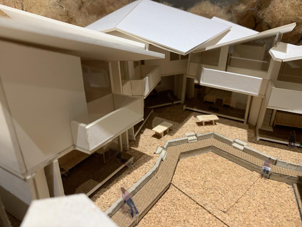 外圍的量體一部分是作為外到內的通道,我刻意讓這個通道有點曲折,光線明暗交錯,呼應故事中通往桃花源的不易,另一側的量體是社區的共享食堂,社區可以在一個禮拜中固定某個晚上一起吃頓晚飯,交流情感,位於二樓的食堂邊吃飯時可以俯瞰整個社區的庭園,是一個舒適的空間,量體的一樓是一個對外的小市場,販售社區庭院種出來的蔬菜水果。
