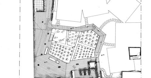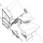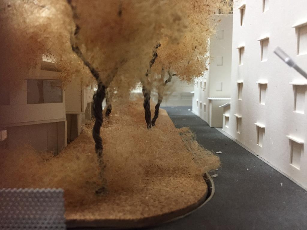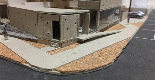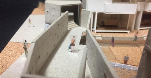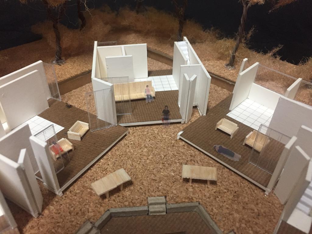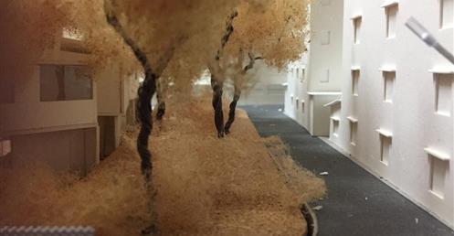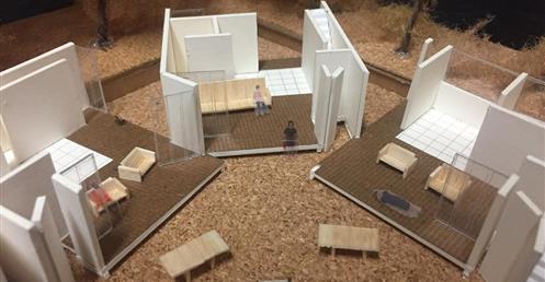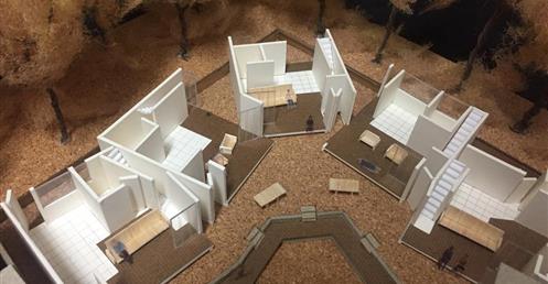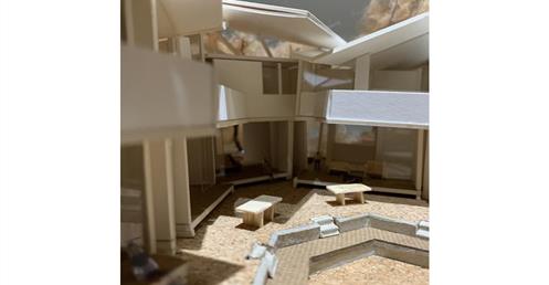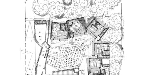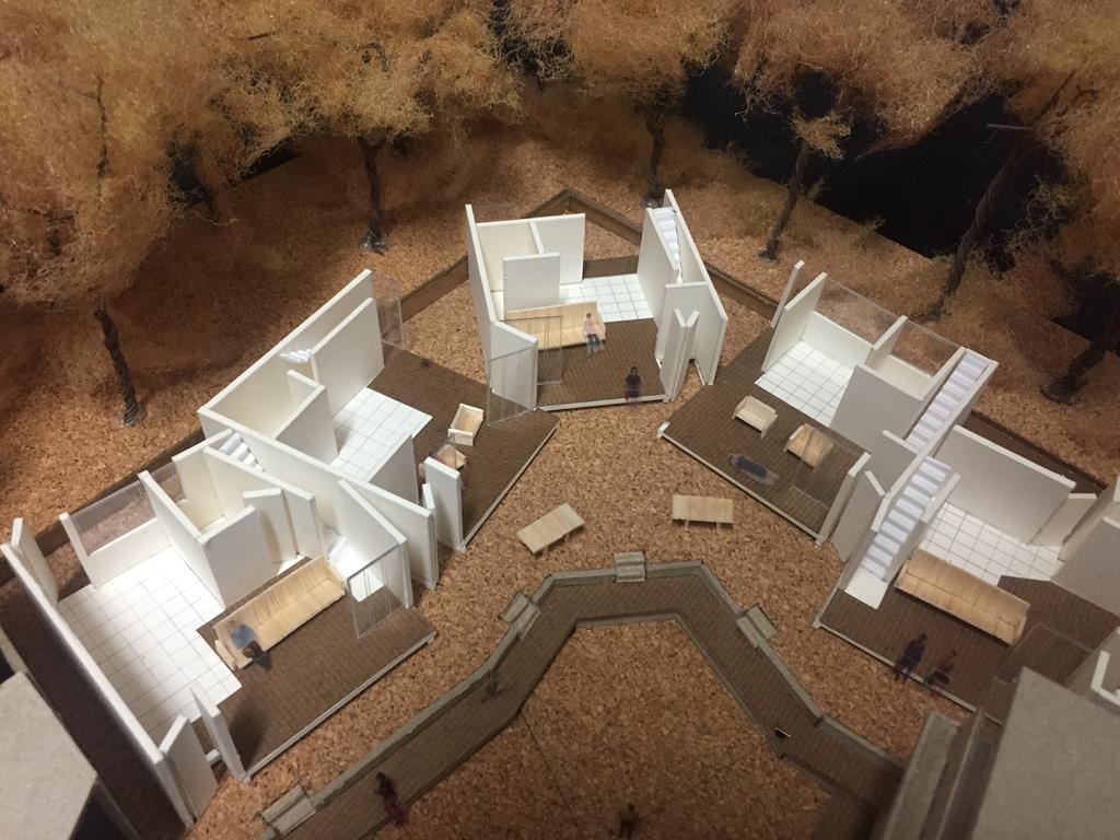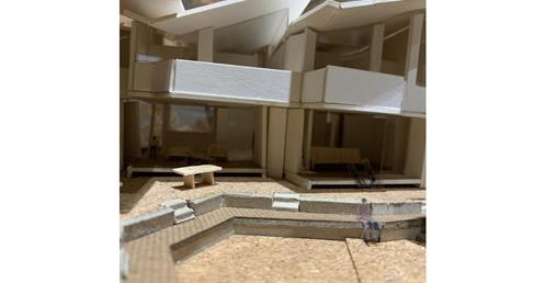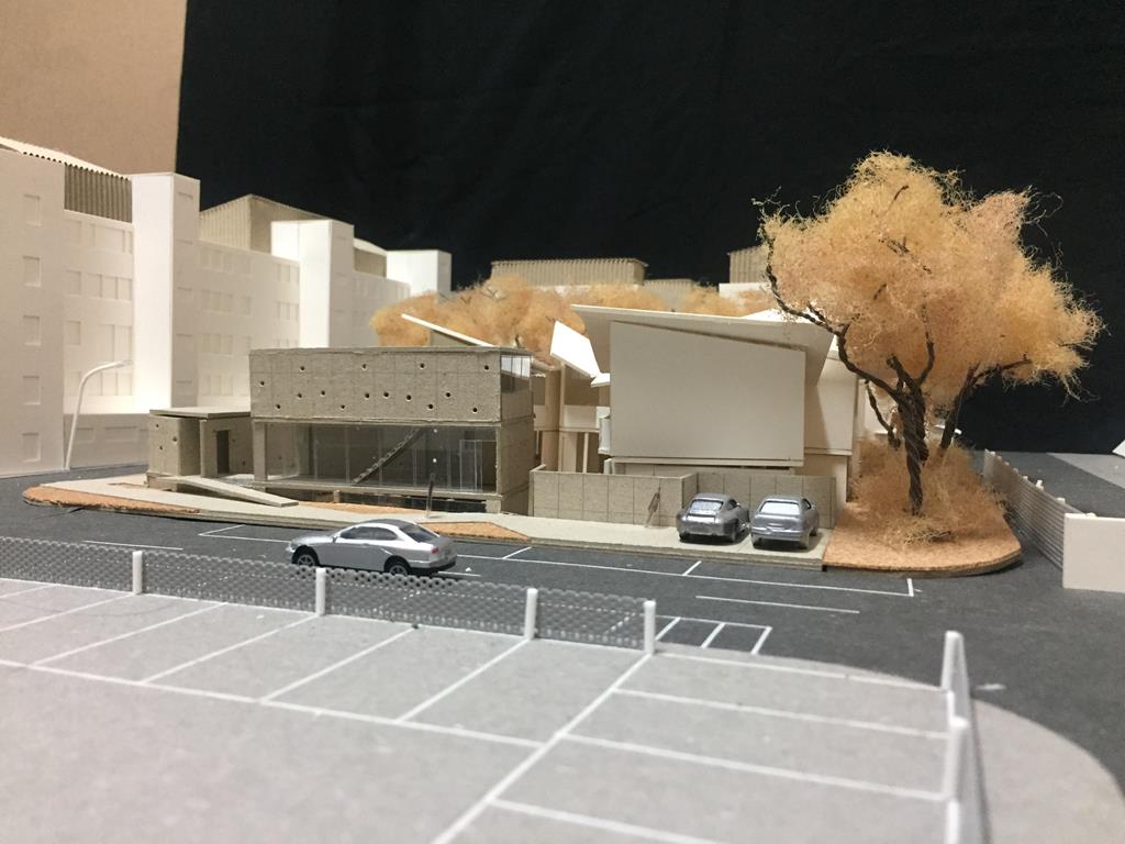 外圍的量體一部分是作為外到內的通道,我刻意讓這個通道有點曲折,光線明暗交錯,呼應故事中通往桃花源的不易,另一側的量體是社區的共享食堂,社區可以在一個禮拜中固定某個晚上一起吃頓晚飯,交流情感,位於二樓的食堂邊吃飯時可以俯瞰整個社區的庭園,是一個舒適的空間,量體的一樓是一個對外的小市場,販售社區庭院種出來的蔬菜水果。