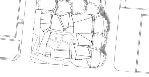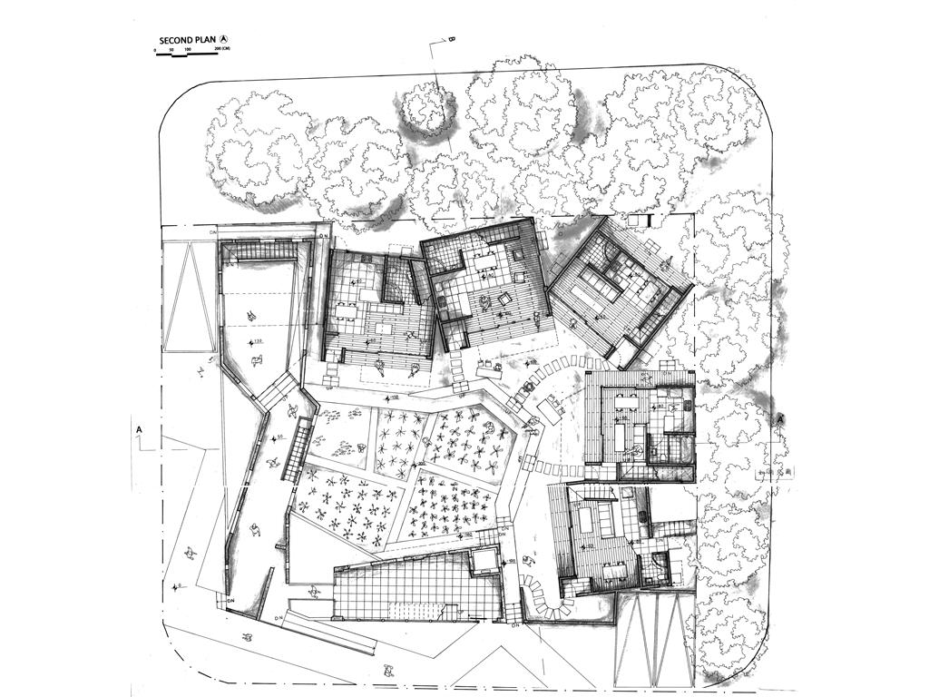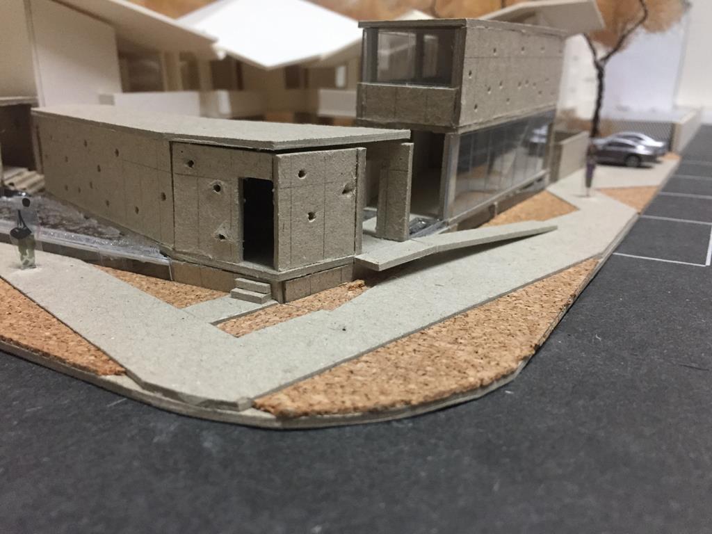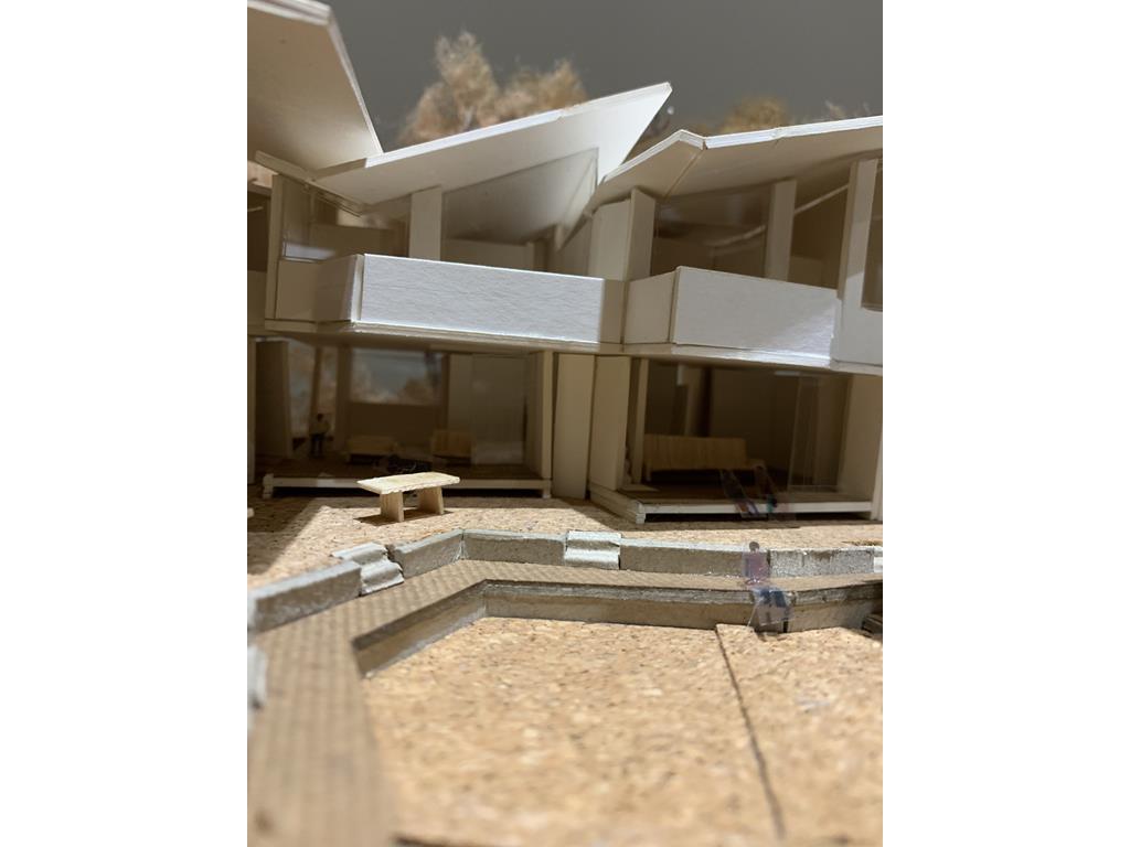 於是我首先將量體圍出環型的樣態,創造出中間的共享庭園,並下挖一層樓,將這個庭園與與外部繁雜的馬路產生區隔,接著將五個單元面對庭園置入開放式的客廳,以木地板的平台作為內與外的銜接,每一戶客廳跟餐廳都可以跟戶外環境有良好的關係,採光跟通風都很充足,假日的午後可以躺在木地板上看書,小孩可以在庭園嬉戲,戶與戶之間也不那麼封閉,很容易產生互動,不僅有公共的庭園每一戶也有私人的庭園,靠外部的灰色量體主要作為社區內與外的屏障,但卻不完全封死。每一戶的各個空間適中試圖營造出溫馨的氛圍,並置入挑空,讓一二樓之間有對話,在每個單元的二樓我盡量置入陽台讓二樓也可以有外部空間,居住量體的背立面用樹木綠帶作為跟馬路鄰房的過渡。