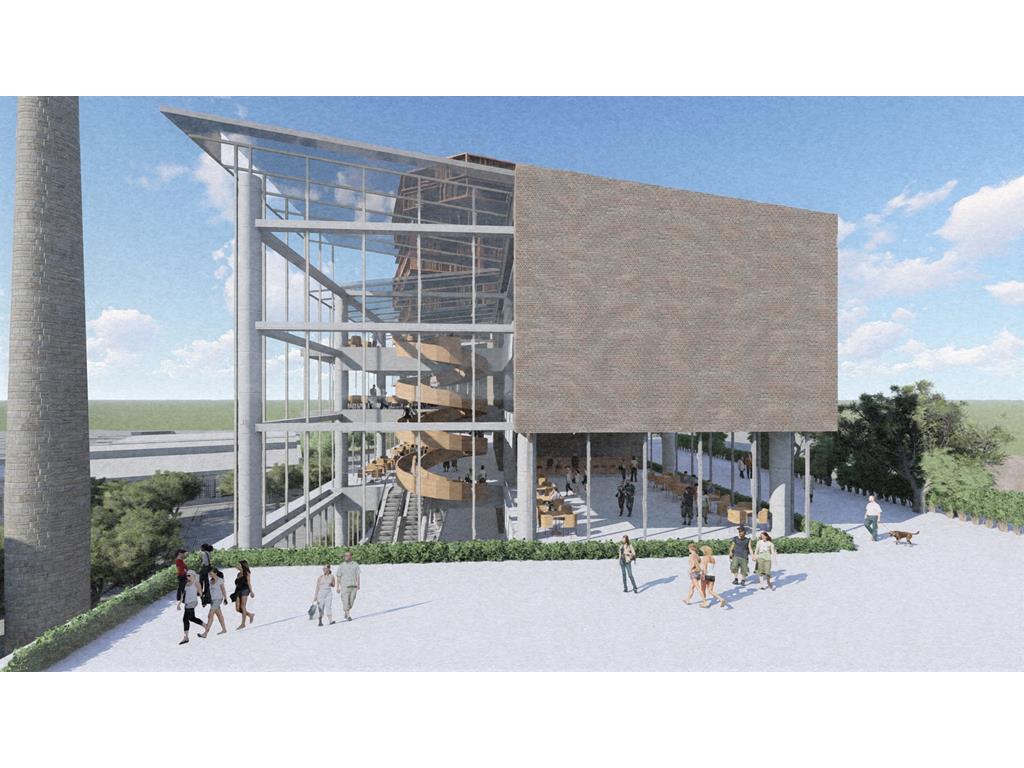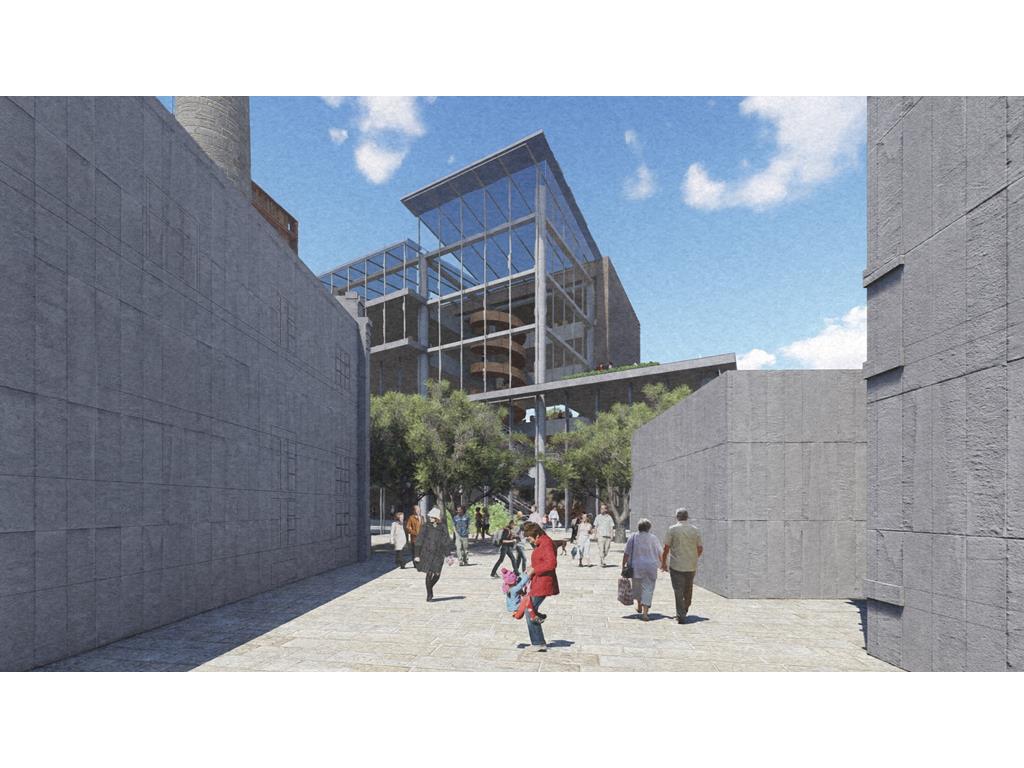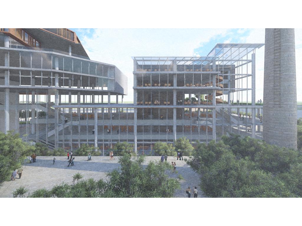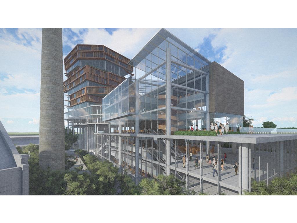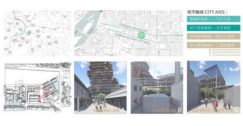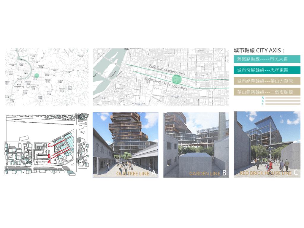 設計概念主要源自華山既有的老酒廠,在老建築群中,有三條重要的建築軸線,分別指向基地的三項指標元素:大樹群、紅磚建築群、老煙囪,我期望運用老樹、紅磚、煙囪這三樣元素,重新形塑來訪者對華山的印象,透過於三個建築老軸線上,創造相應的端景,將人潮由華山老園區帶進新的文創產業大樓,活絡華山新舊兩區,讓人群與空間也能重新互動。