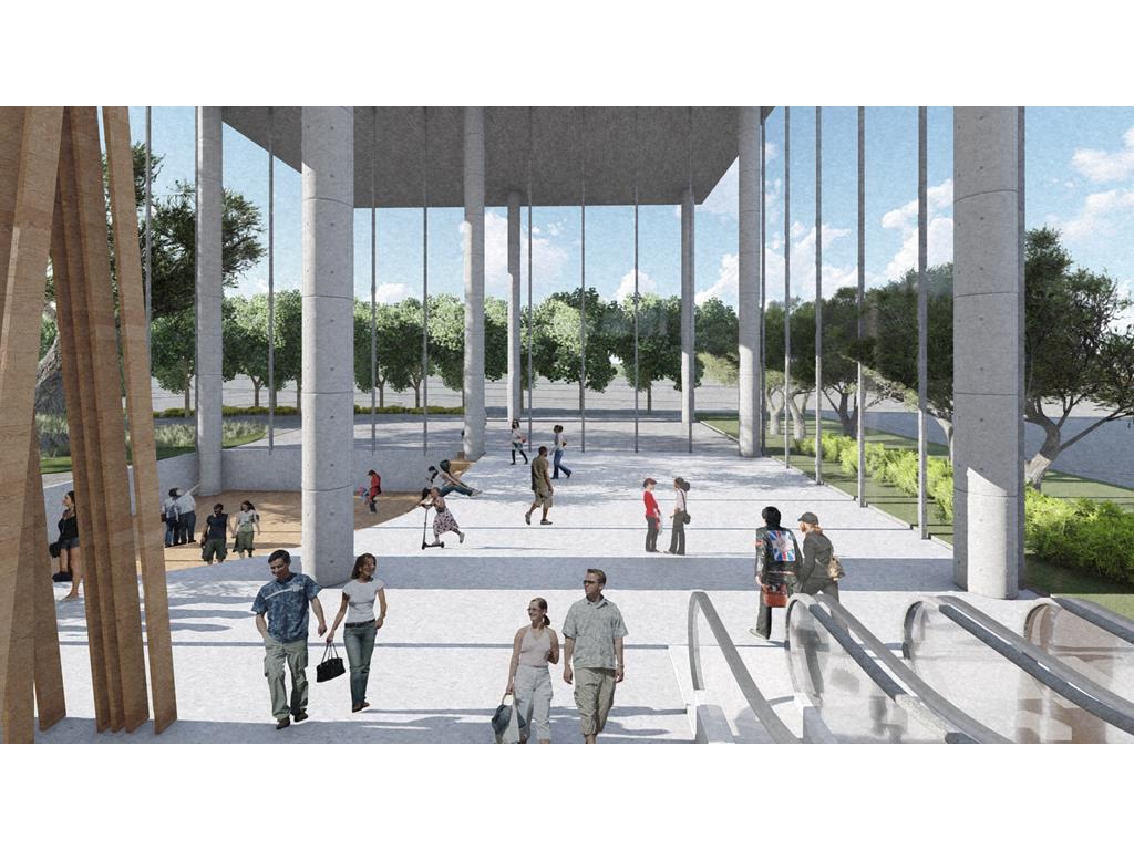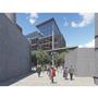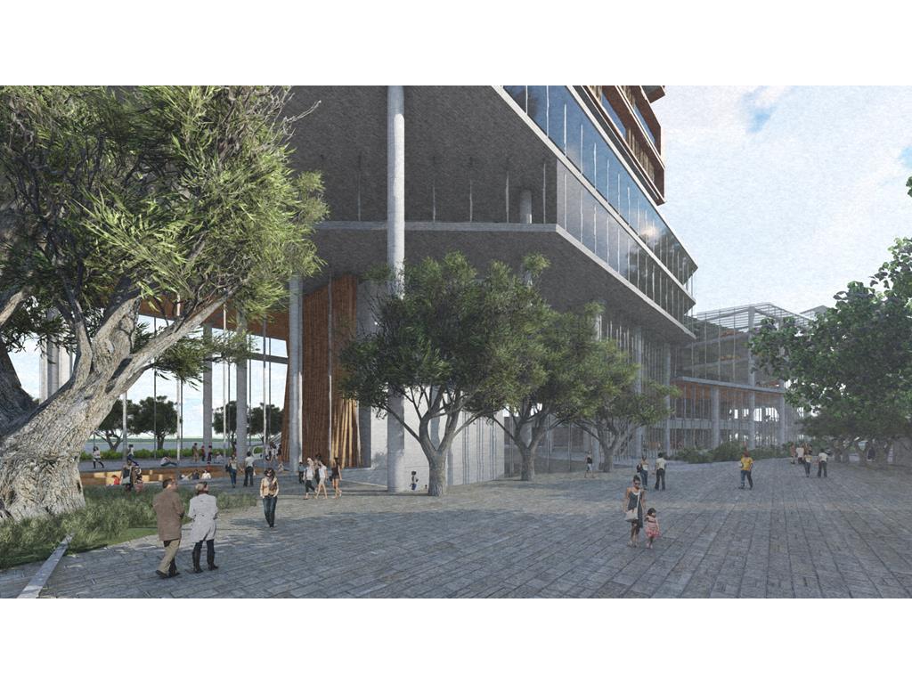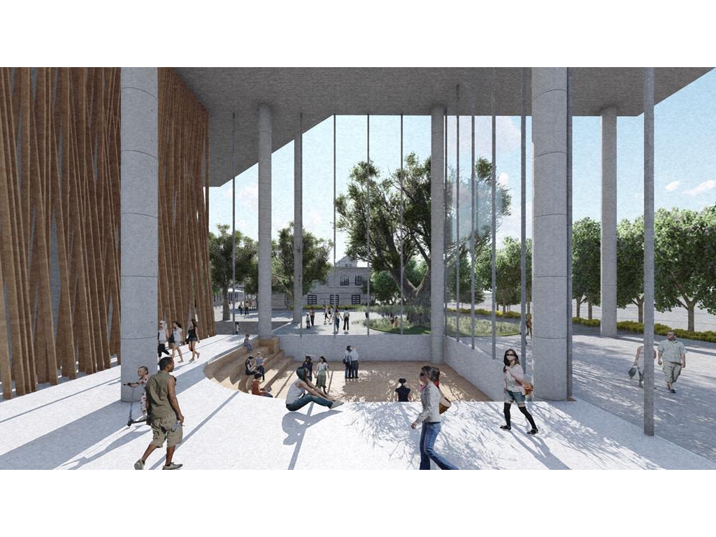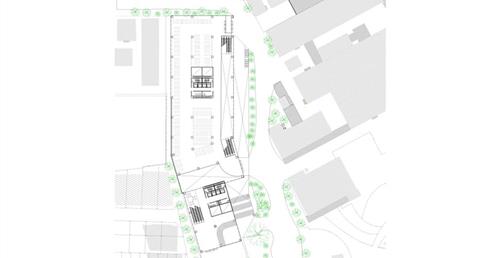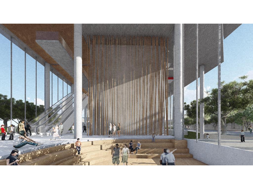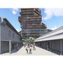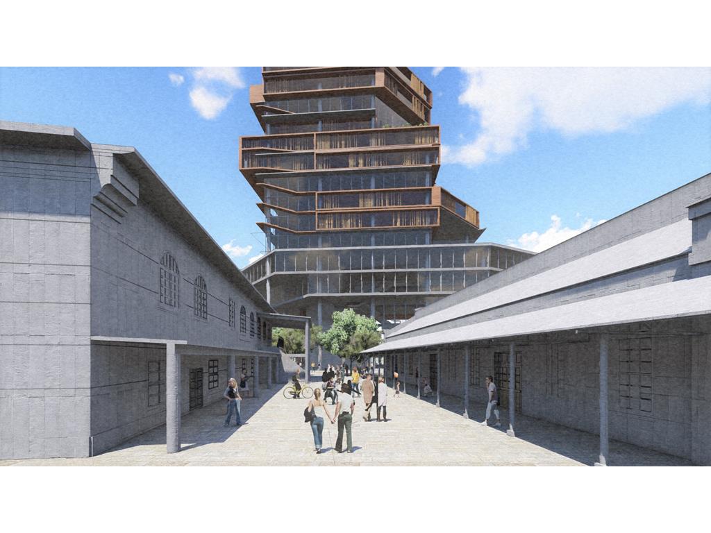設計概念主要源自華山既有的老酒廠,在老建築群中,有三條重要的建築軸線,分別指向基地的三項指標元素:大樹群、紅磚建築群、老煙囪,我期望運用老樹、紅磚、煙囪這三樣元素,重新形塑來訪者對華山的印象,透過於三個建築老軸線上,創造相應的端景,將人潮由華山老園區帶進新的文創產業大樓,活絡華山新舊兩區,讓人群與空間也能重新互動。